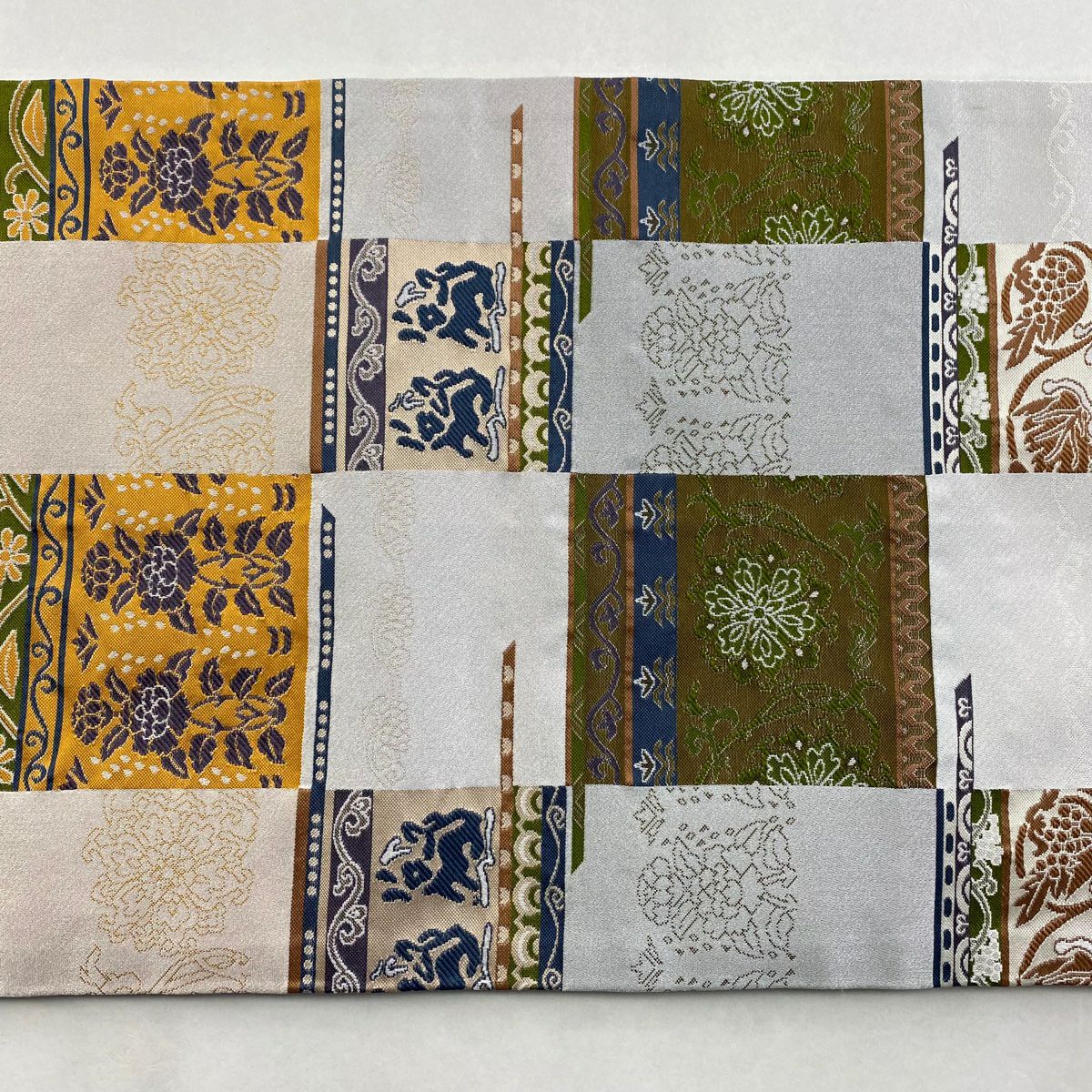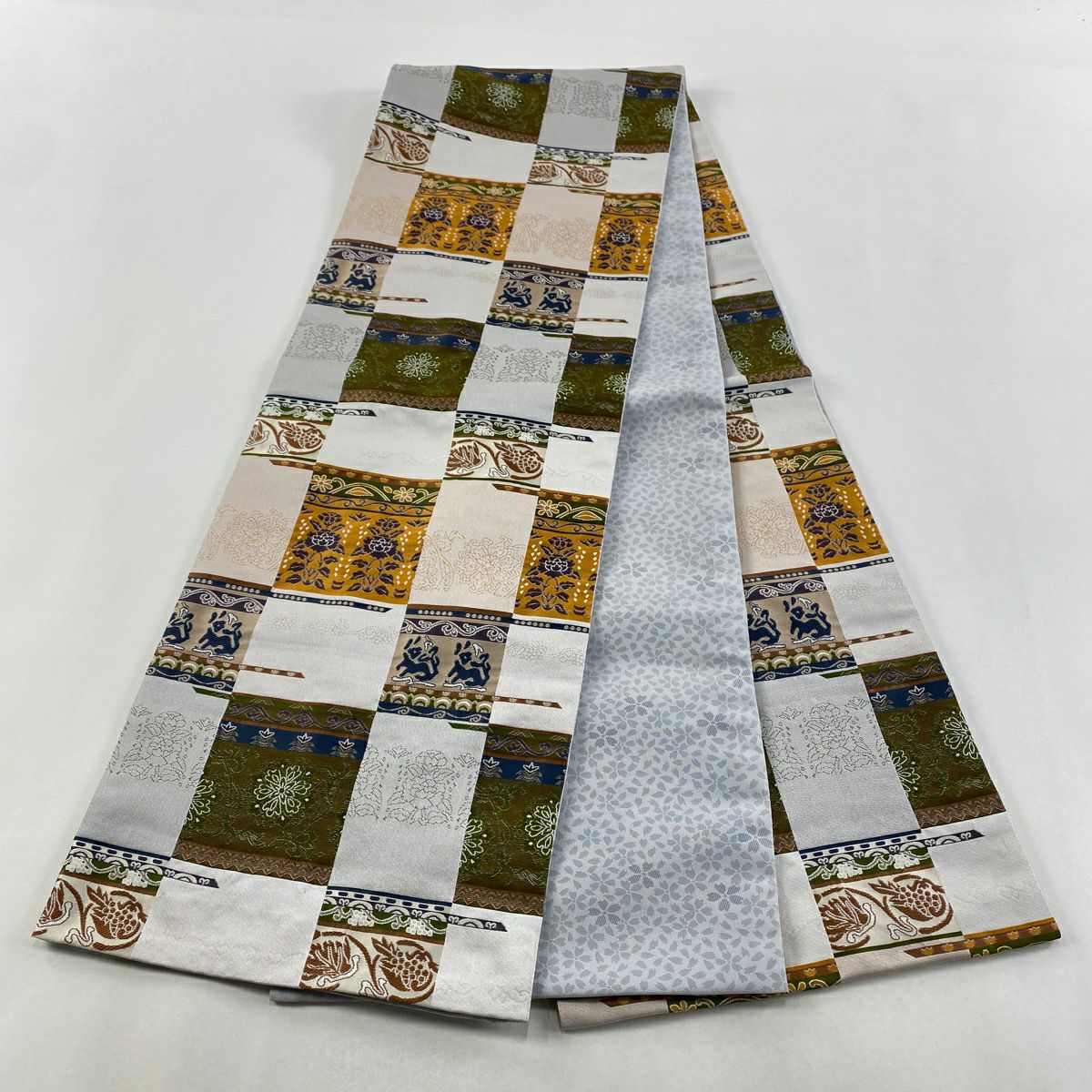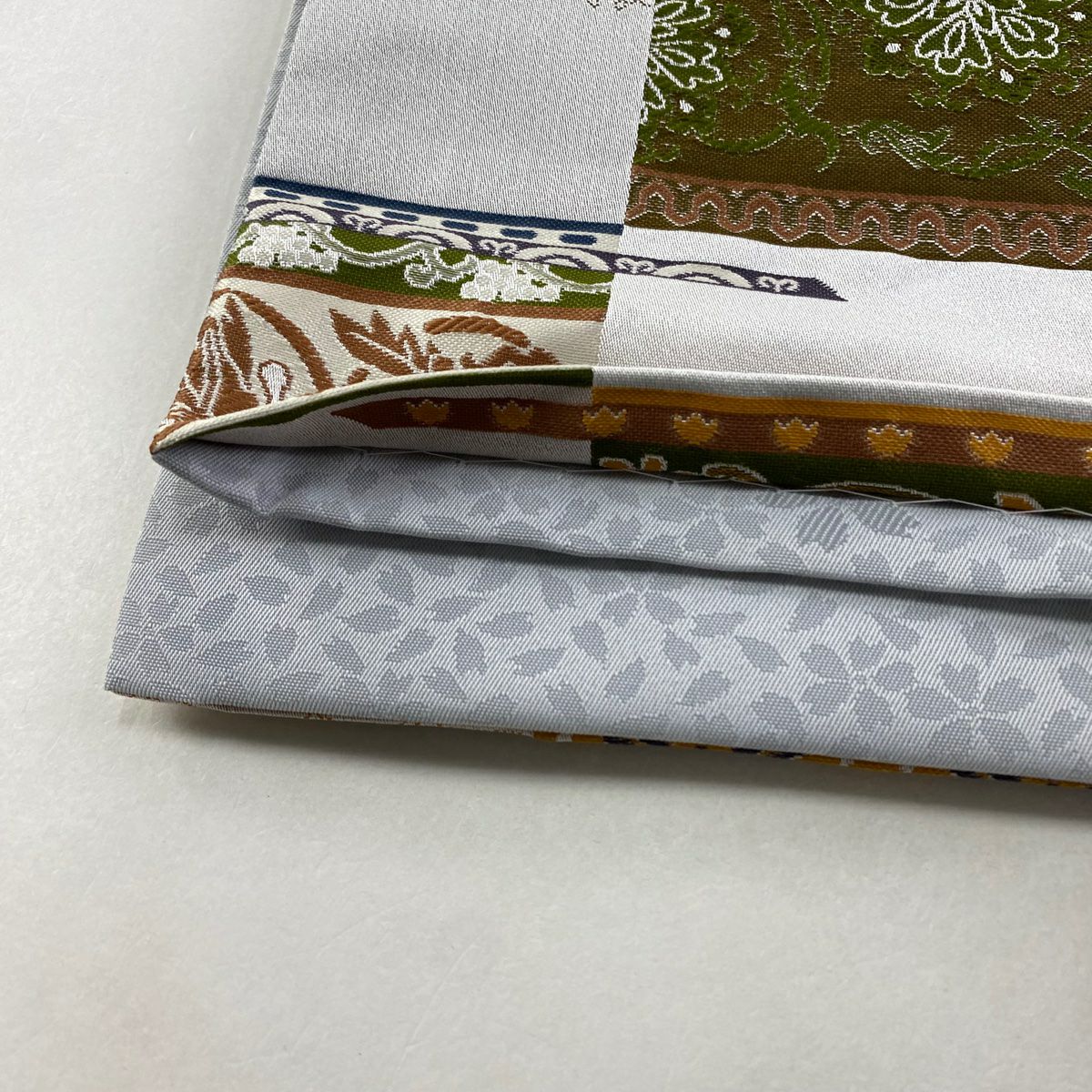 【在庫一掃】 【美品】 袋帯 秀品 草花 華文 灰白 全通 化繊