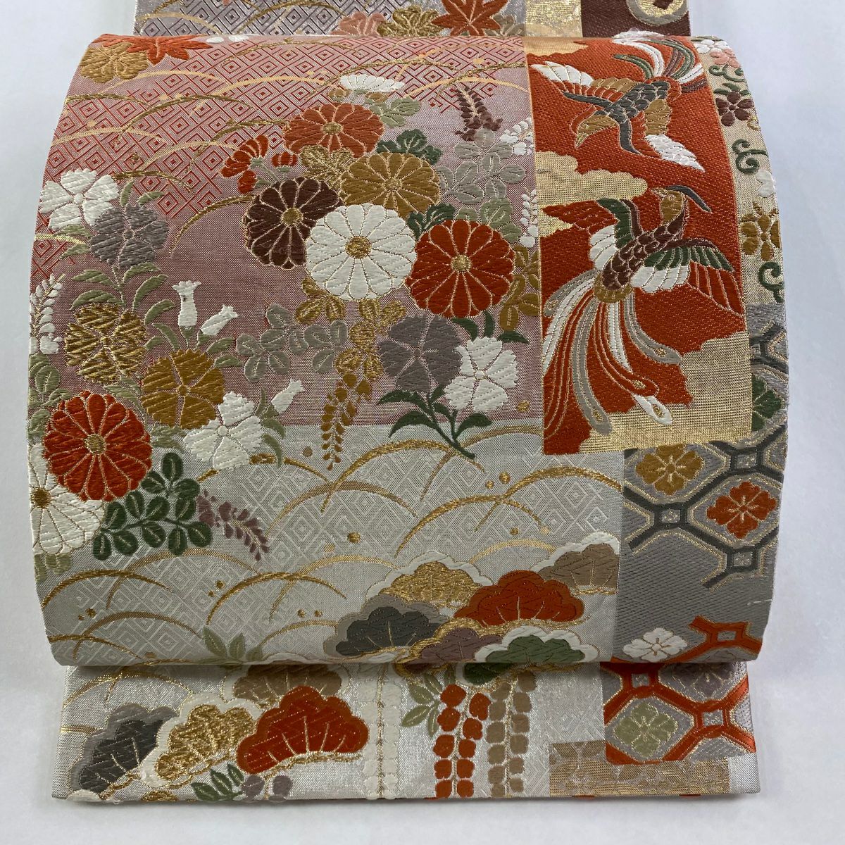 【在庫一掃】 袋帯 秀品 松 花鳥 箔 金糸 灰白 六通 正絹