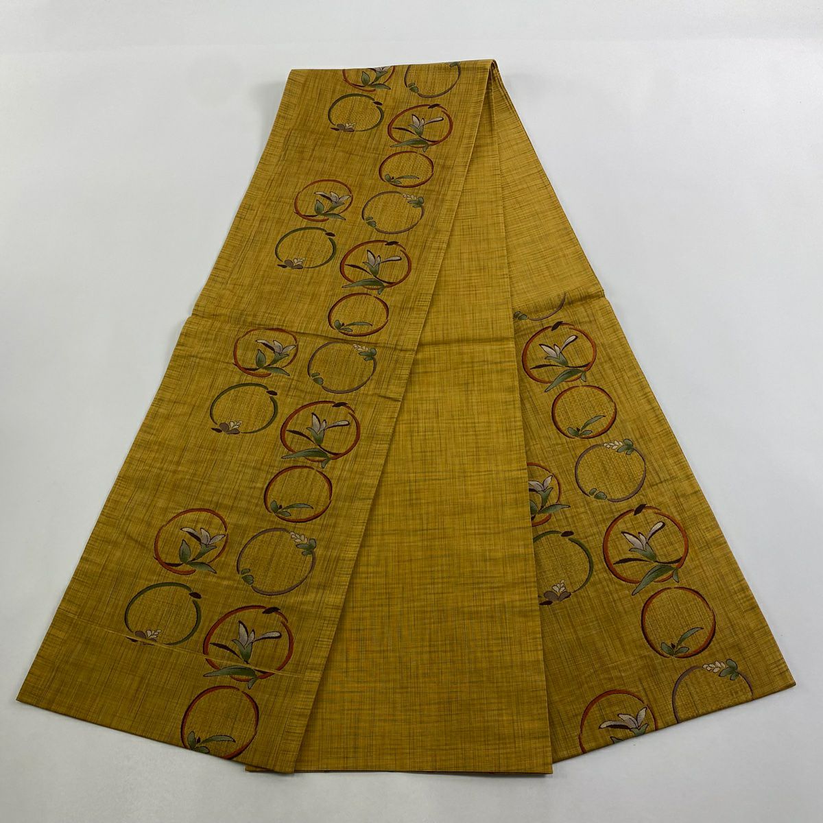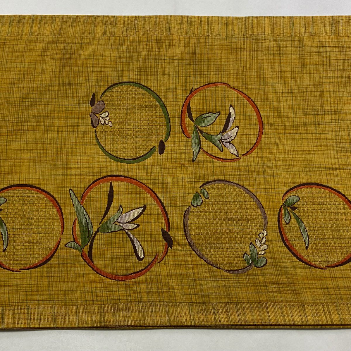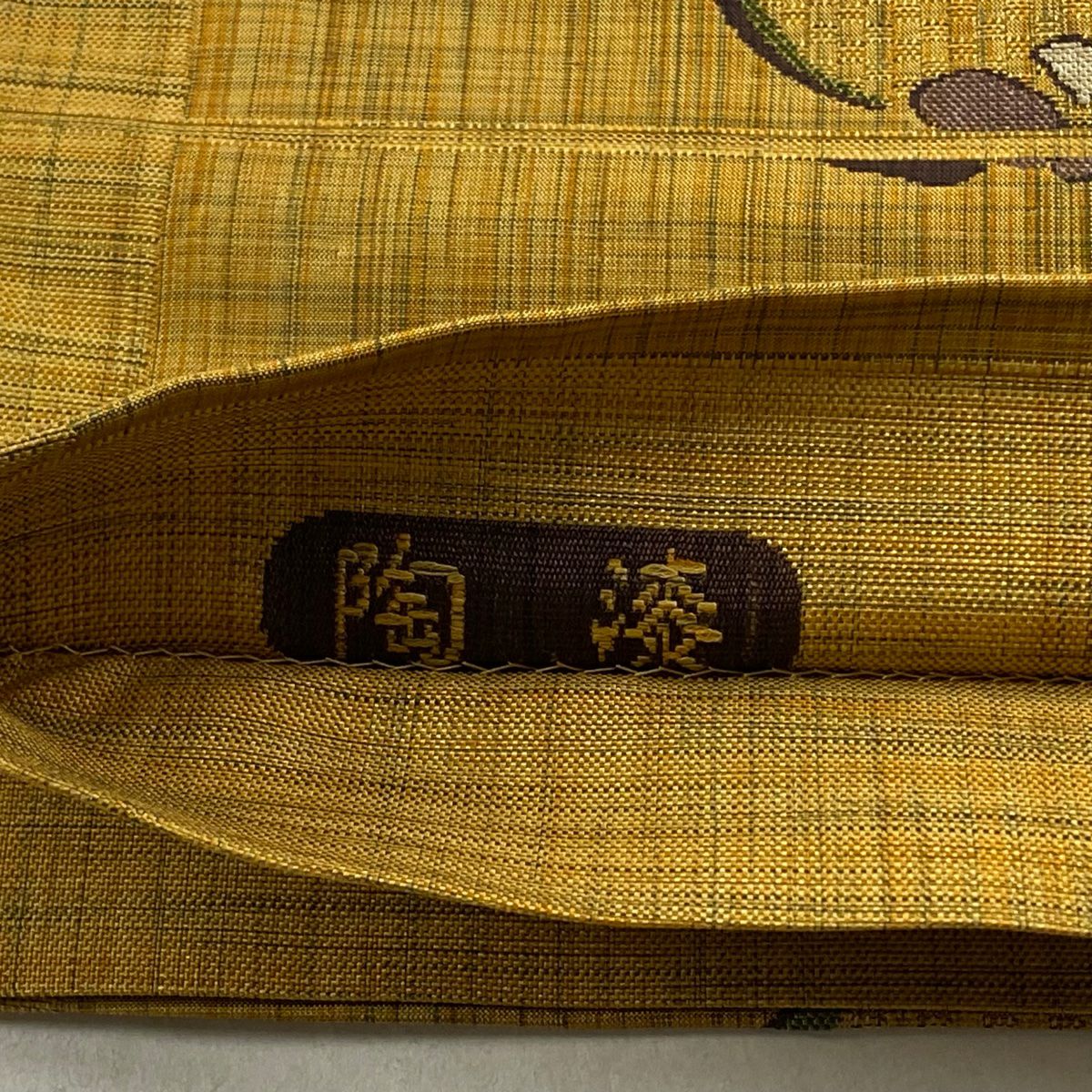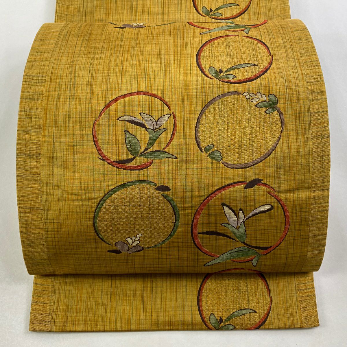 【在庫一掃】 袋帯 秀品 紬地 草花 丸文 黄土色 六通 正絹