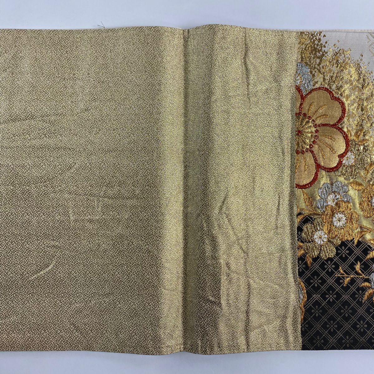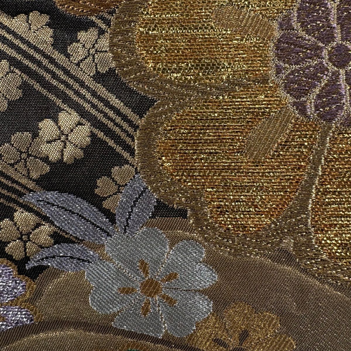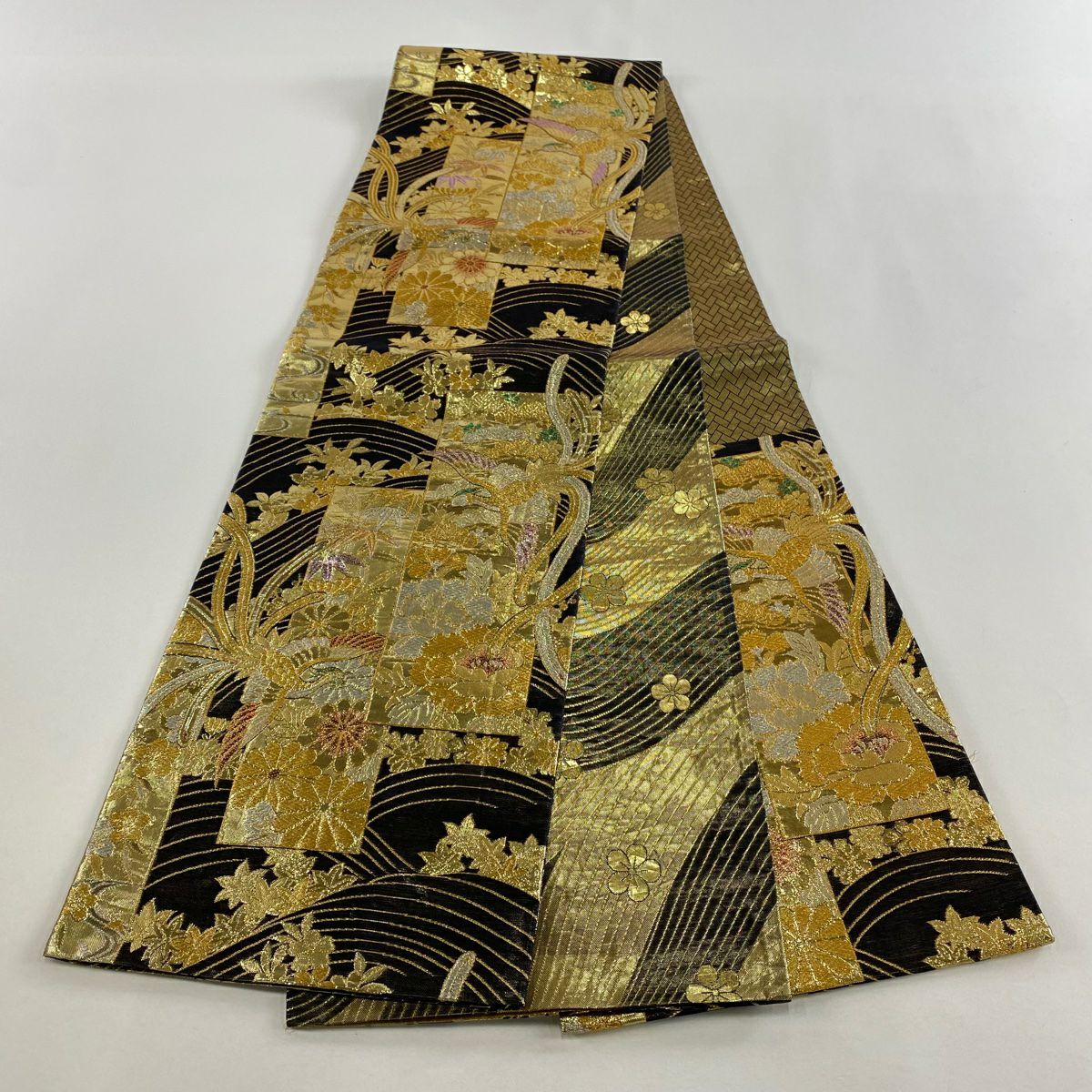 【在庫一掃】 袋帯 秀品 波 草花 金糸 箔 墨色 六通 正絹