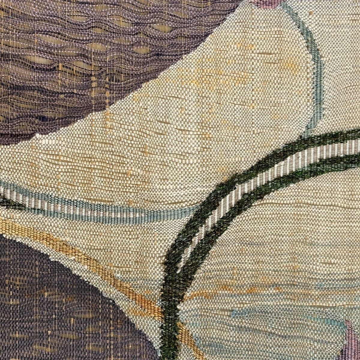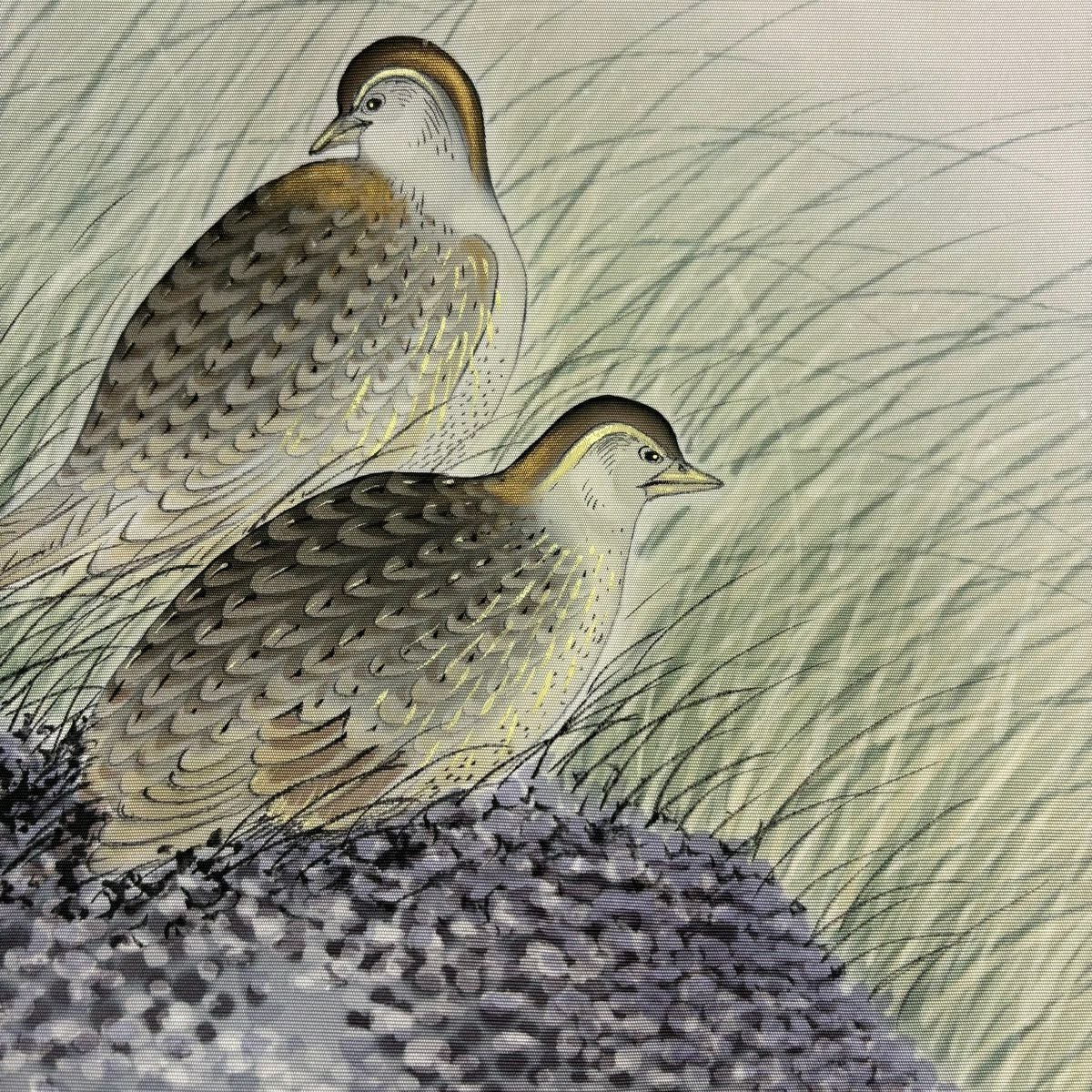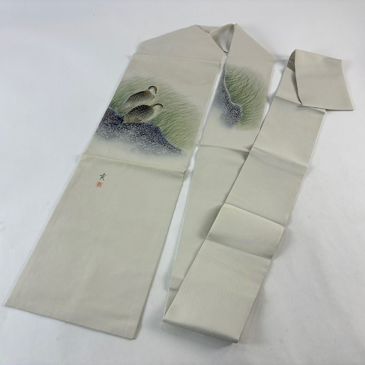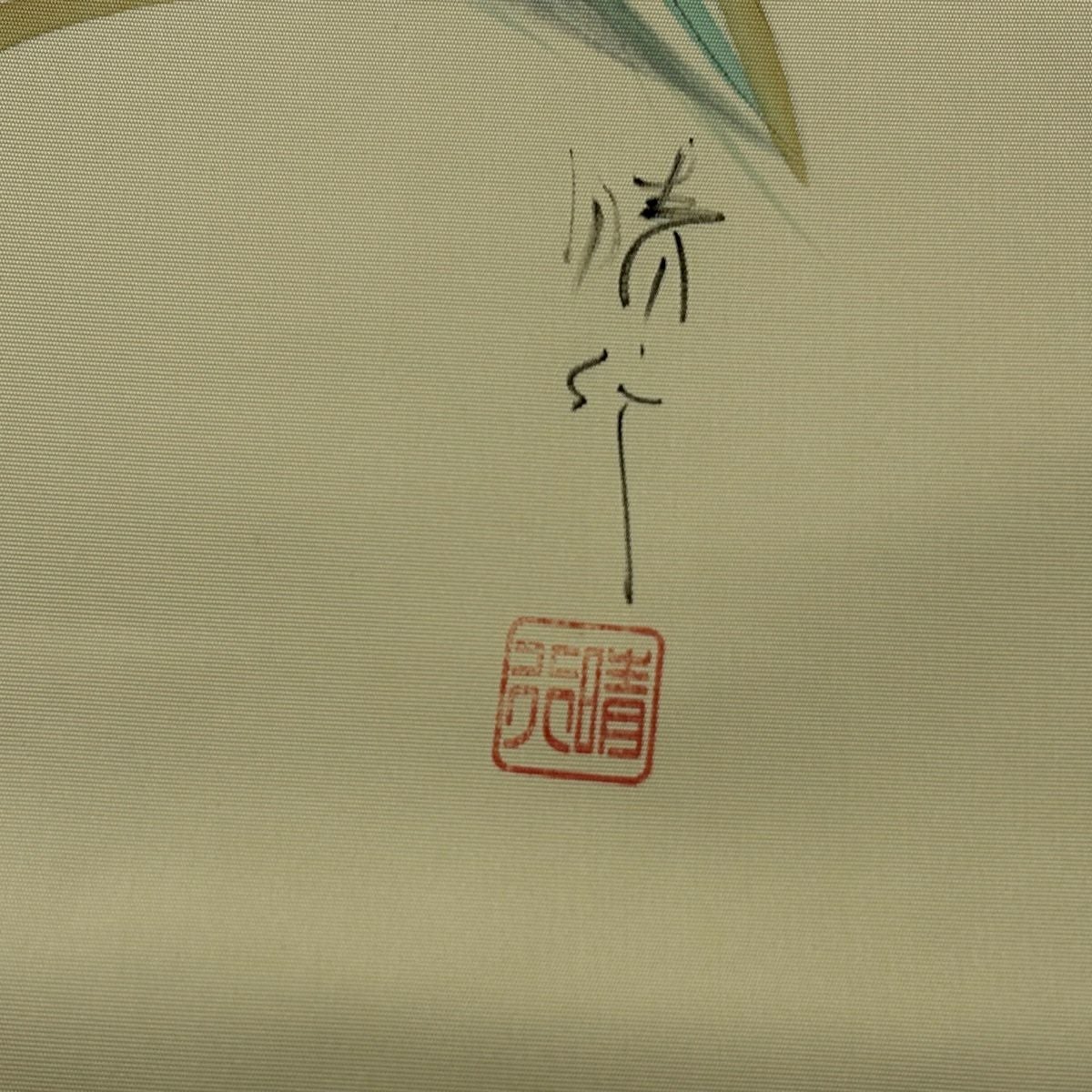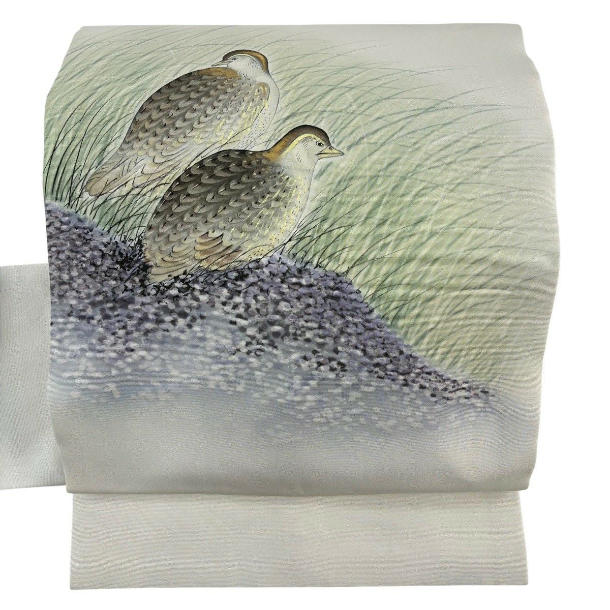 名古屋帯 秀品 落款あり 鳥 灰緑 正絹