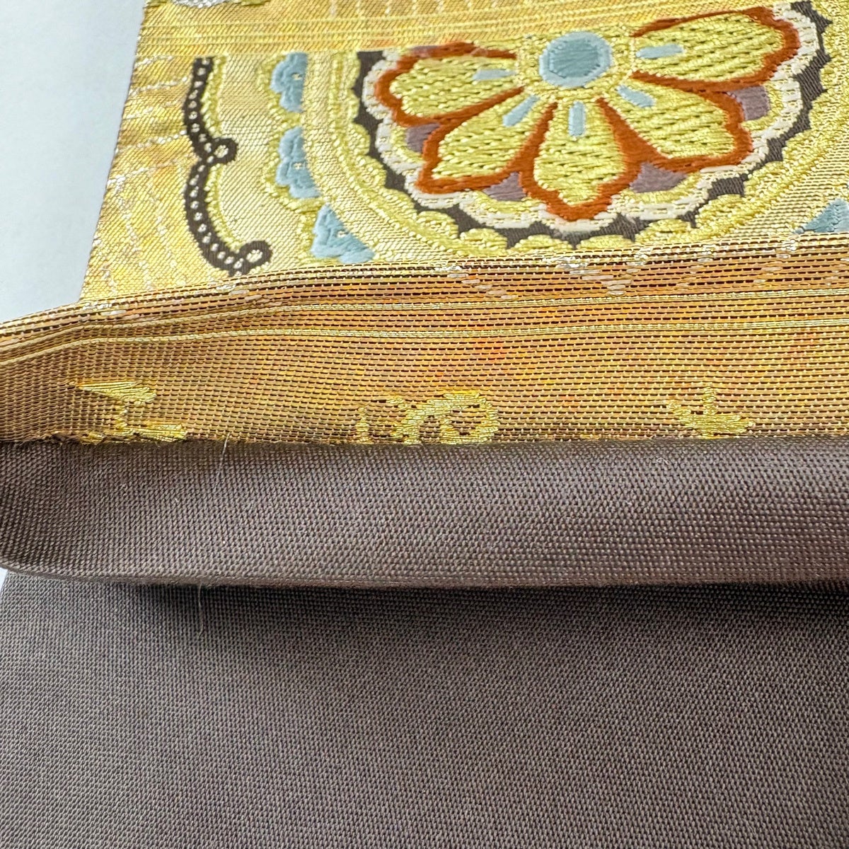 袋帯 秀品 草花 波 金糸 唐織 薄茶色 六通 正絹