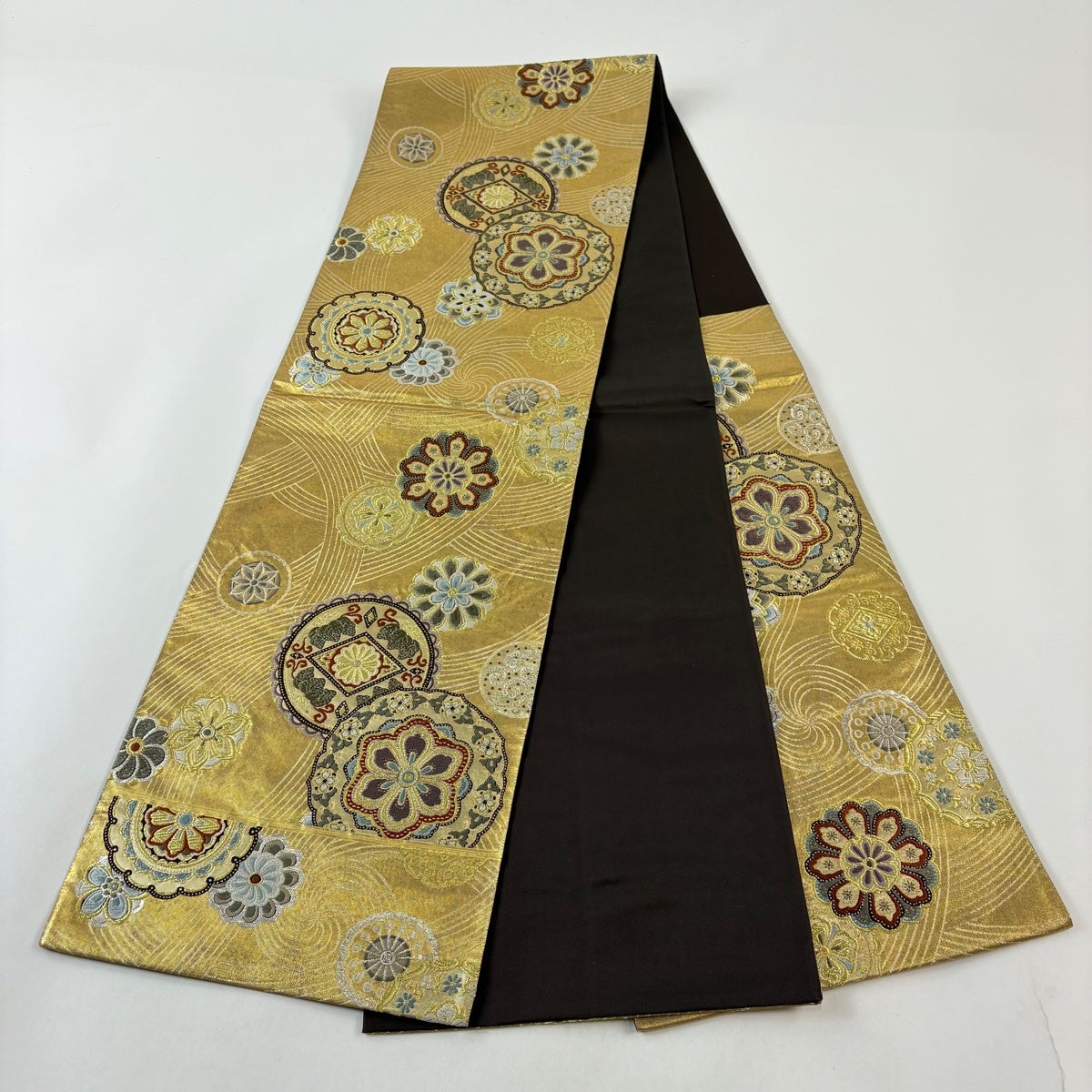 袋帯 秀品 菊 草花 箔 金銀彩 金茶 お太鼓柄 正絹