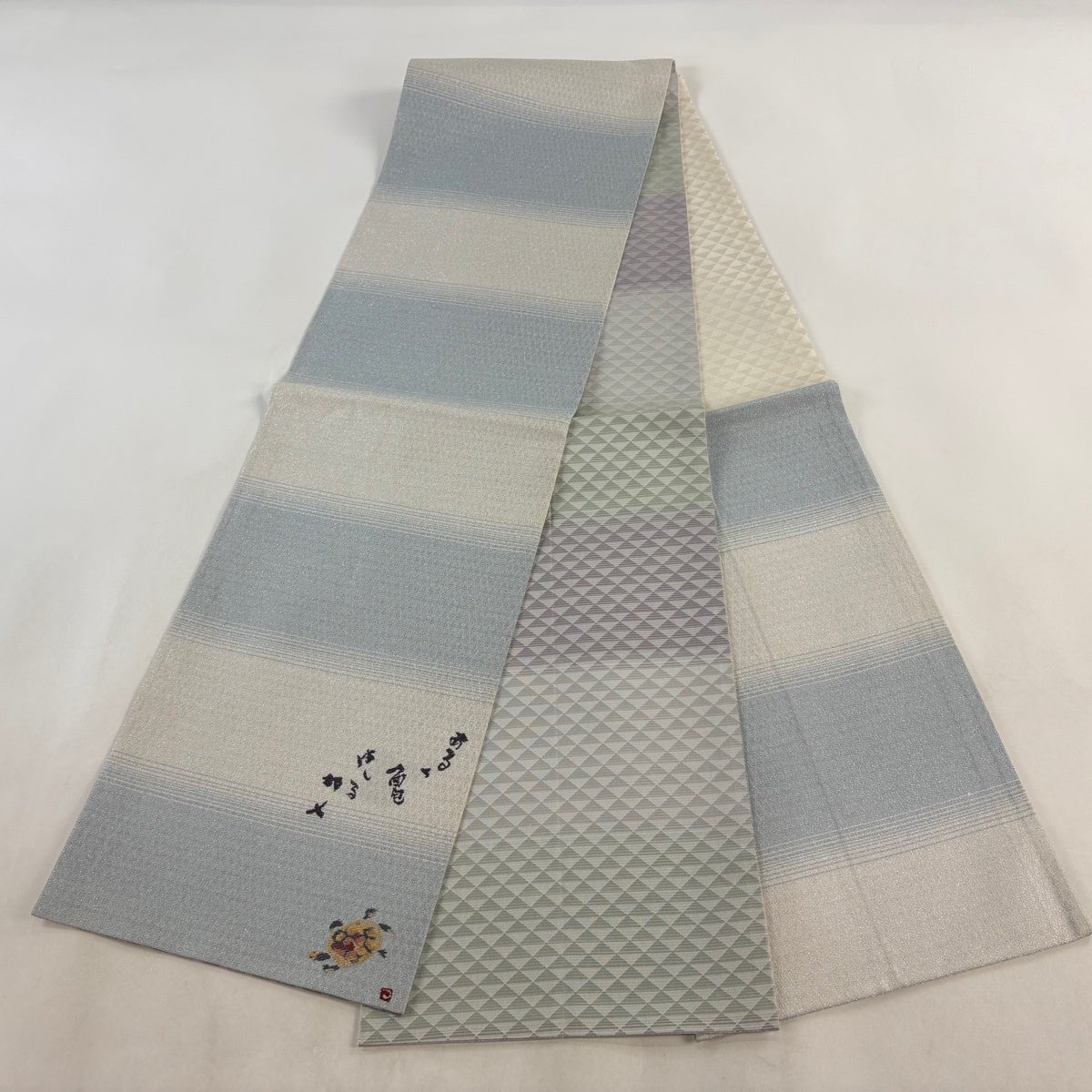 名古屋帯 秀品 落款あり 夏紬地 笹 竹 灰色 正絹