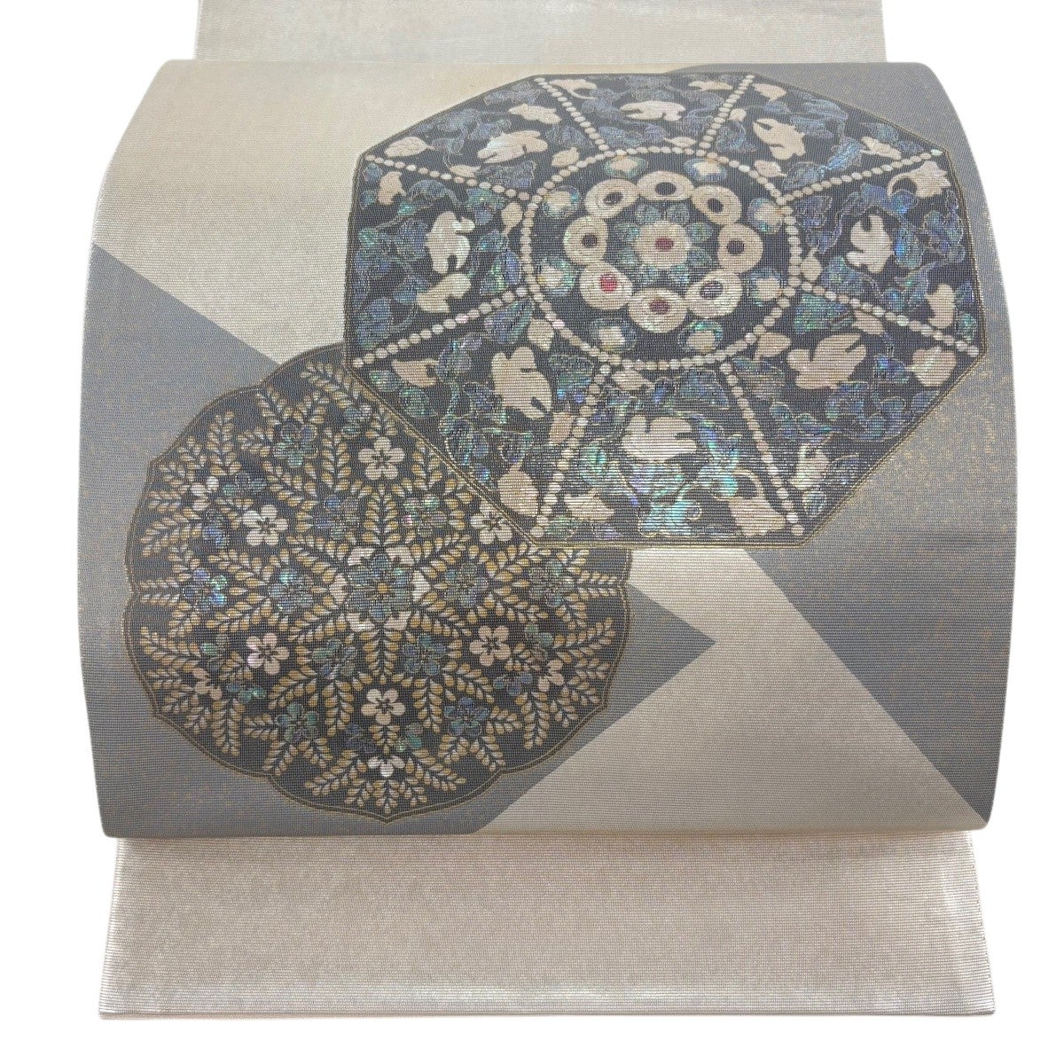 【美品】 袋名古屋帯 秀品 七宝 花菱 薄茶色 正絹
