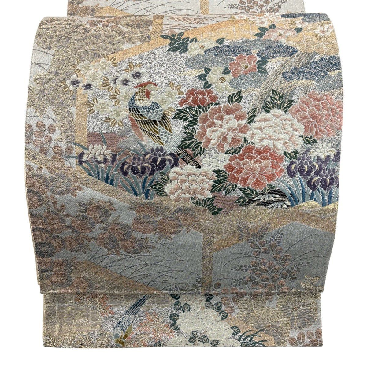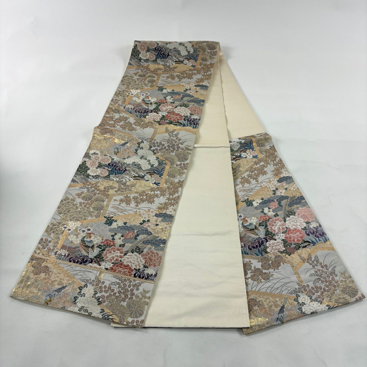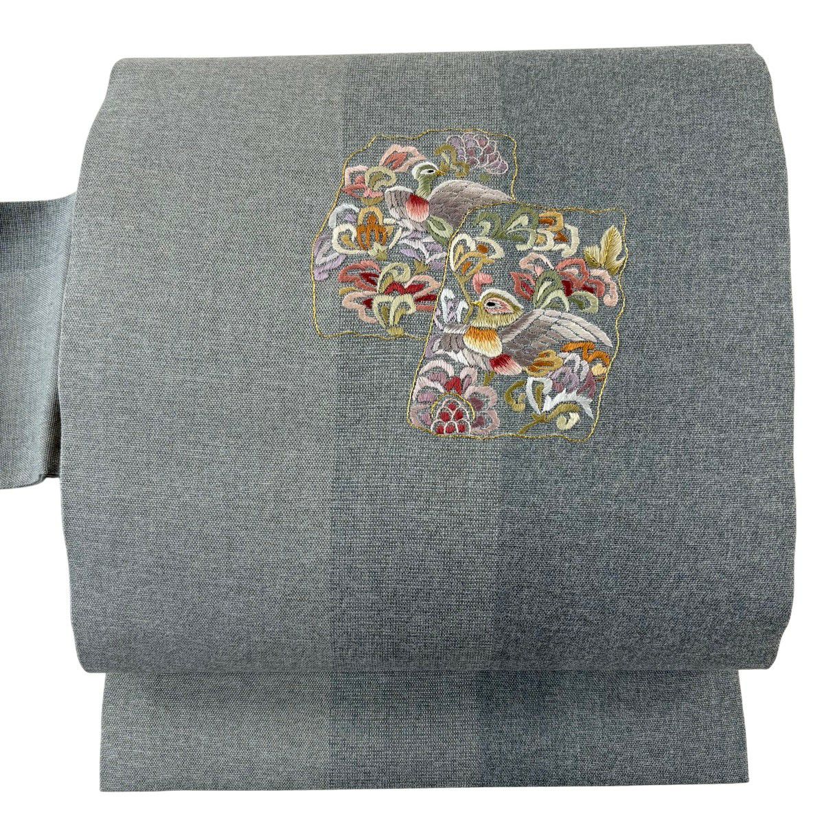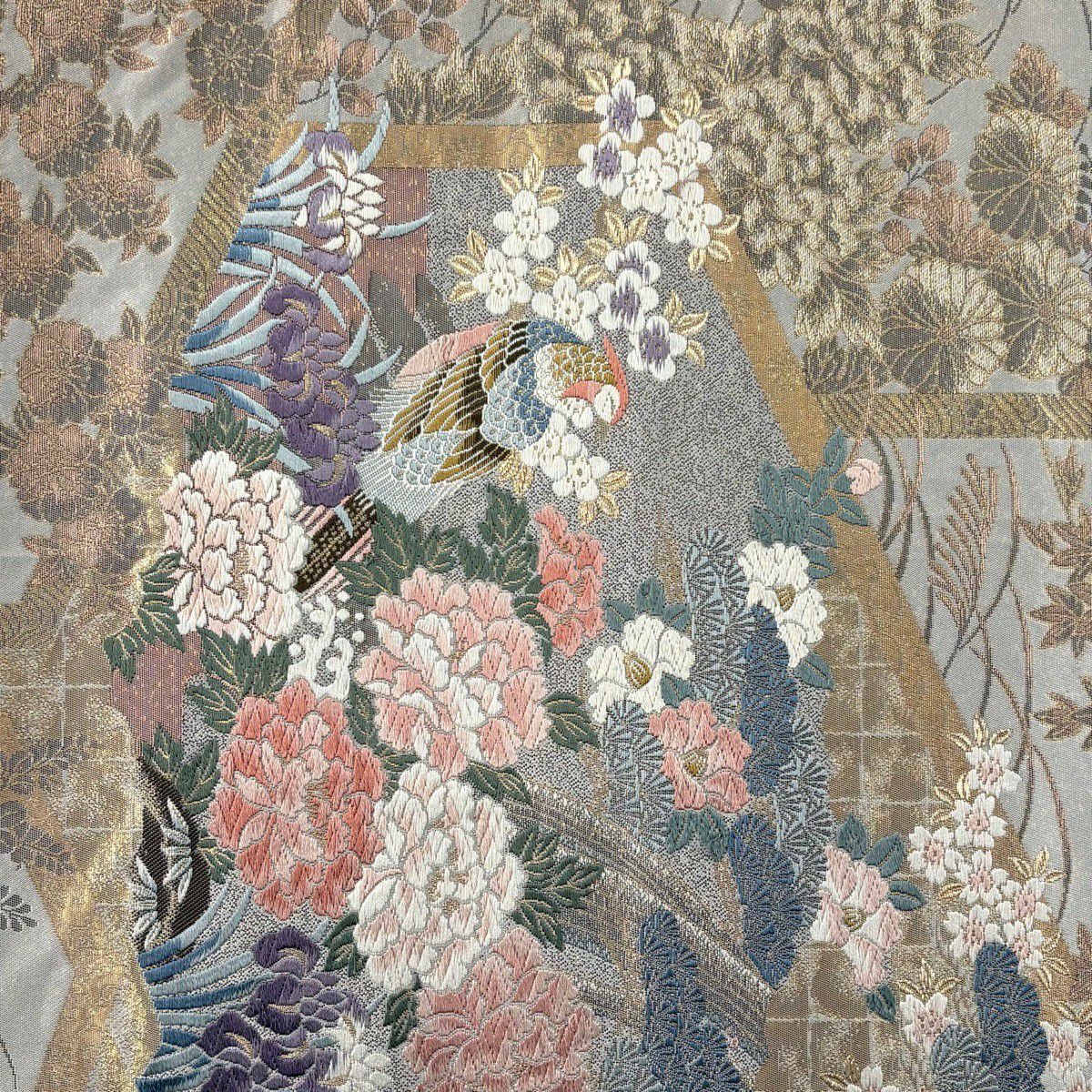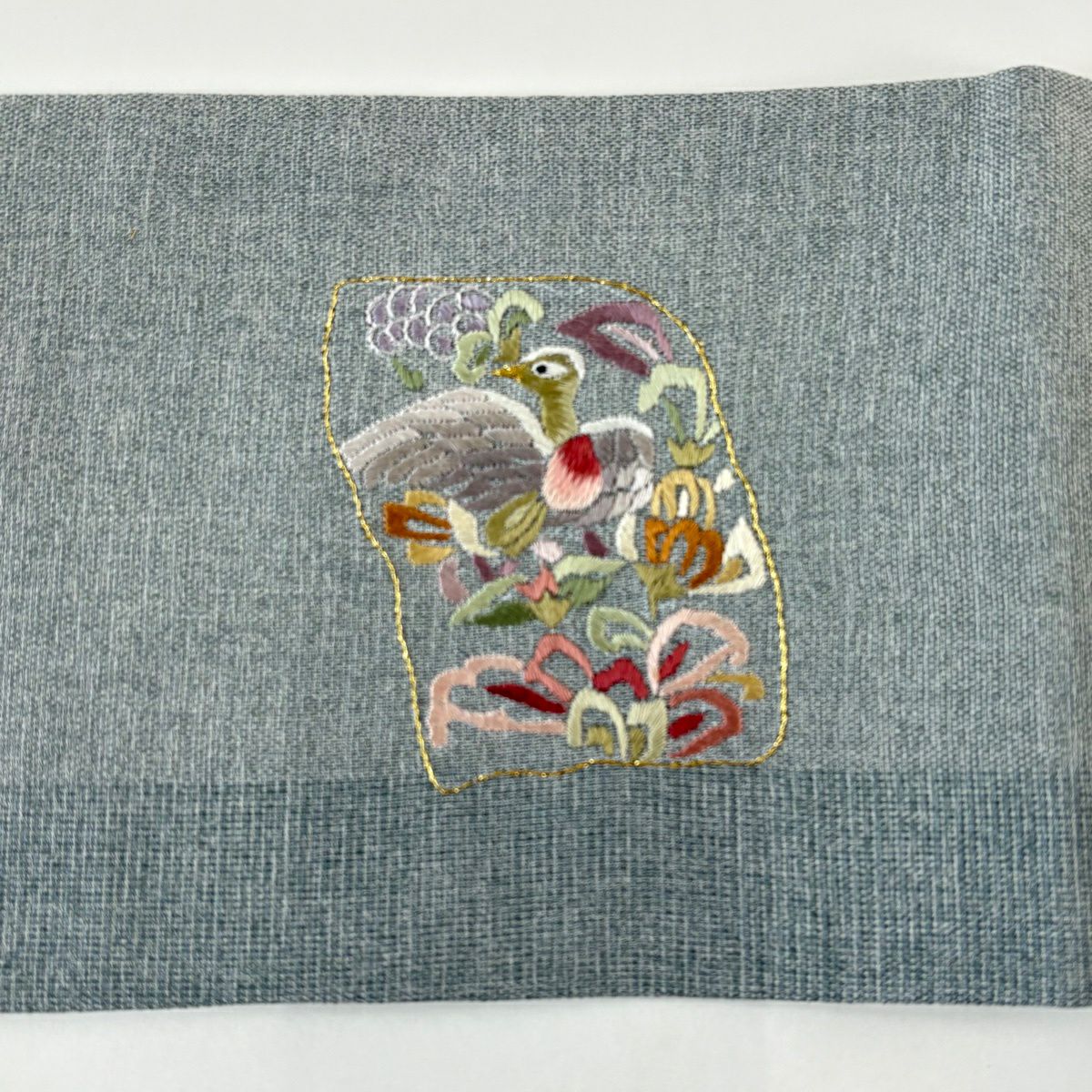 【美品】 名古屋帯 秀品 色紙 花喰い鳥 刺繍 金糸 灰緑 正絹