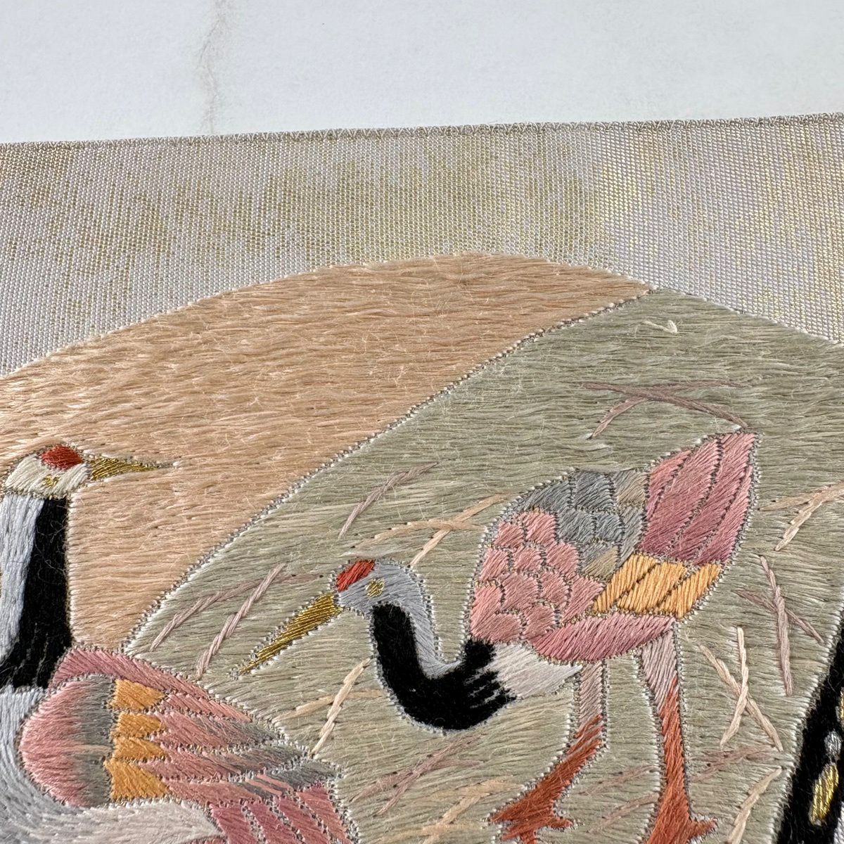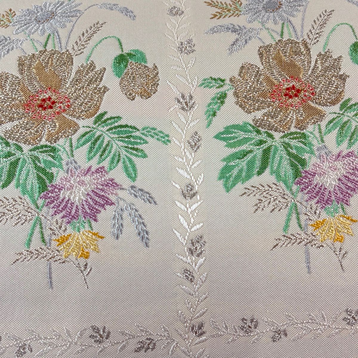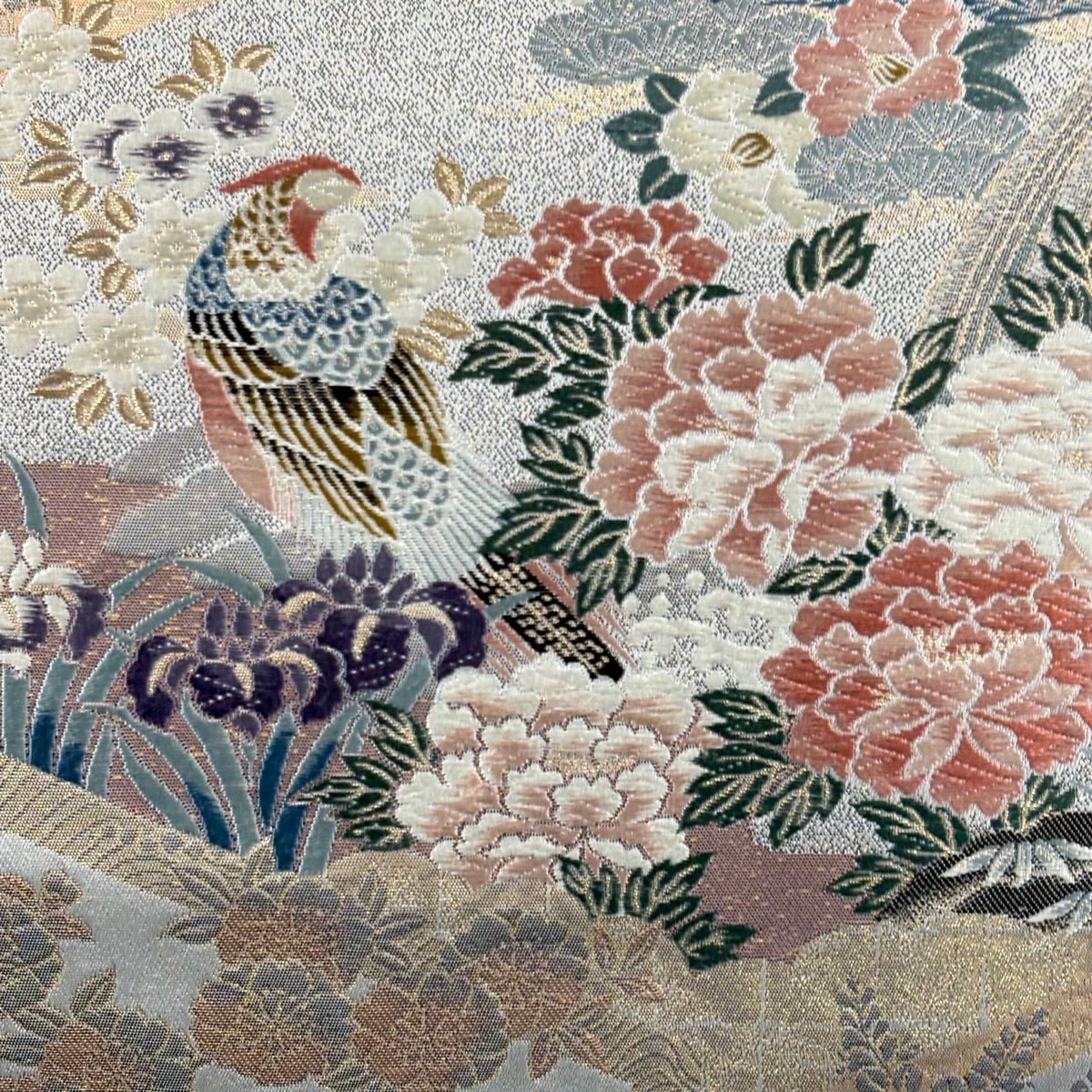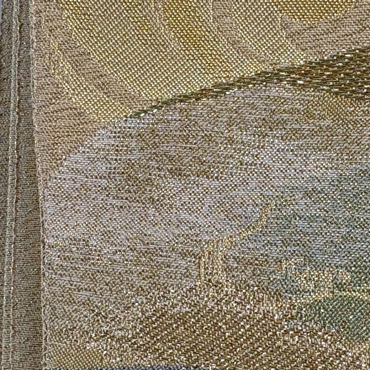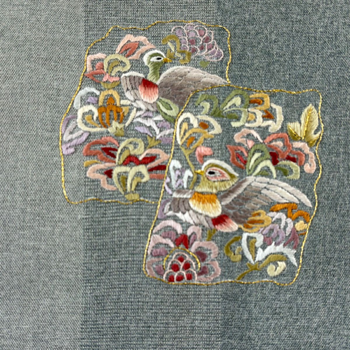 【美品】 名古屋帯 秀品 色紙 花喰い鳥 刺繍 金糸 灰緑 正絹