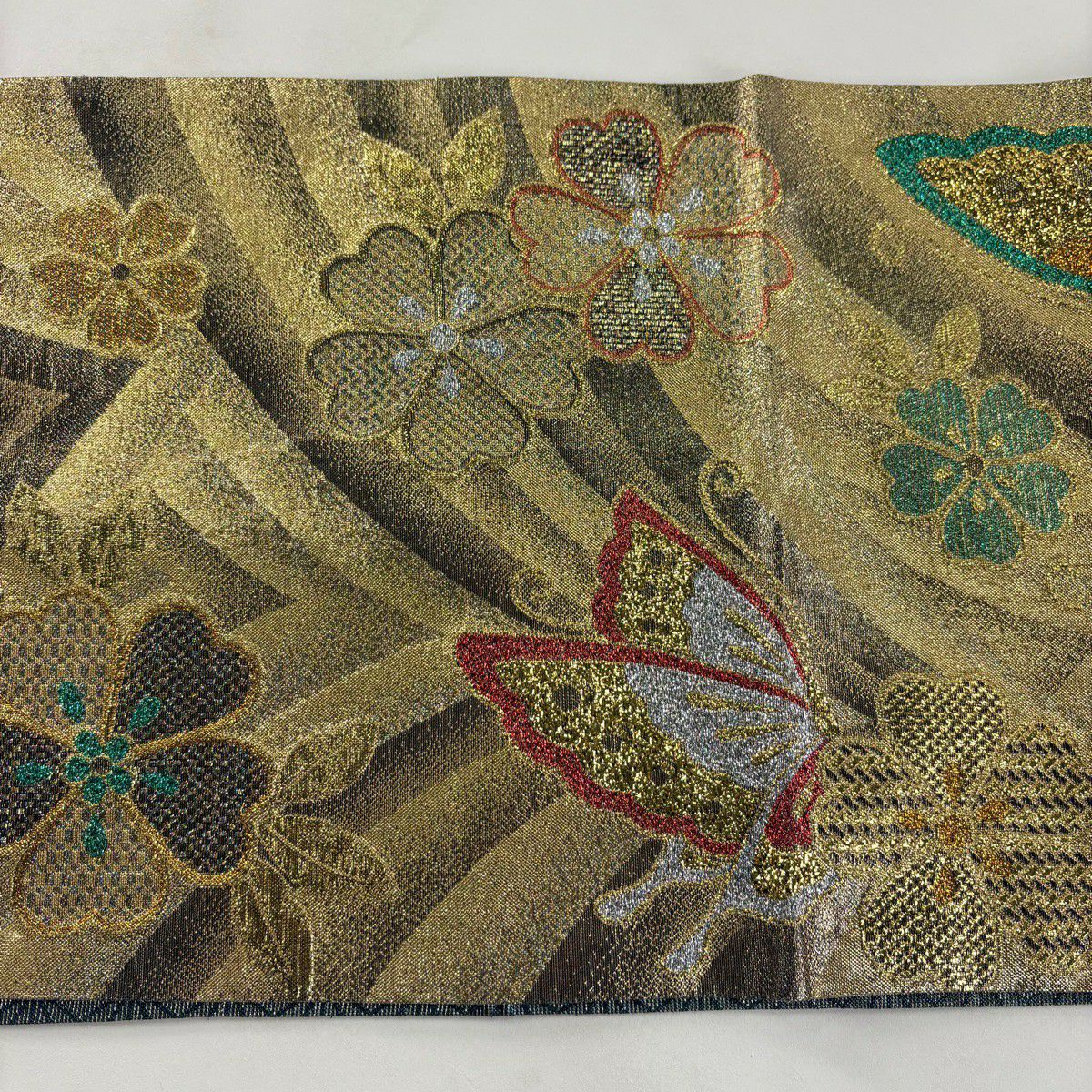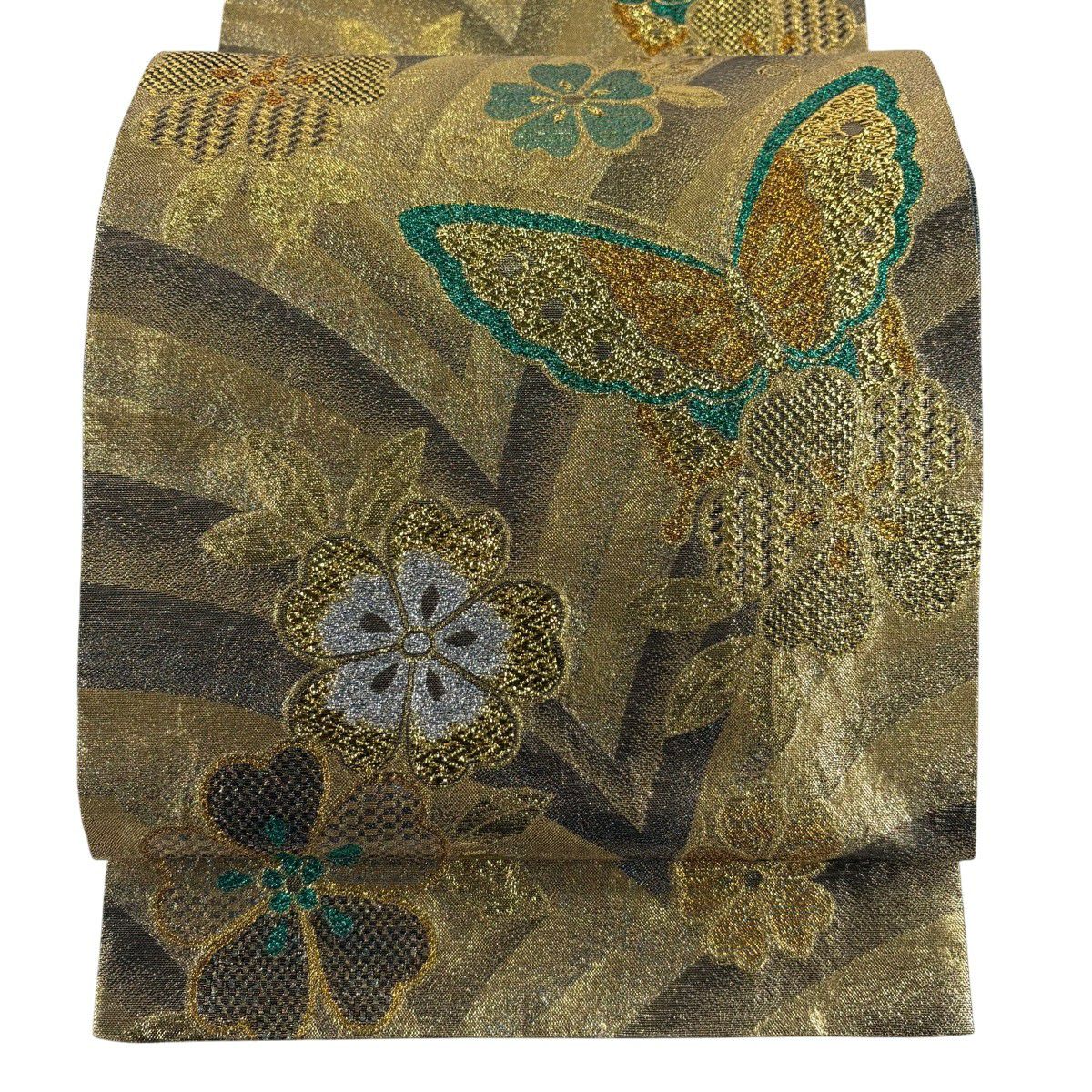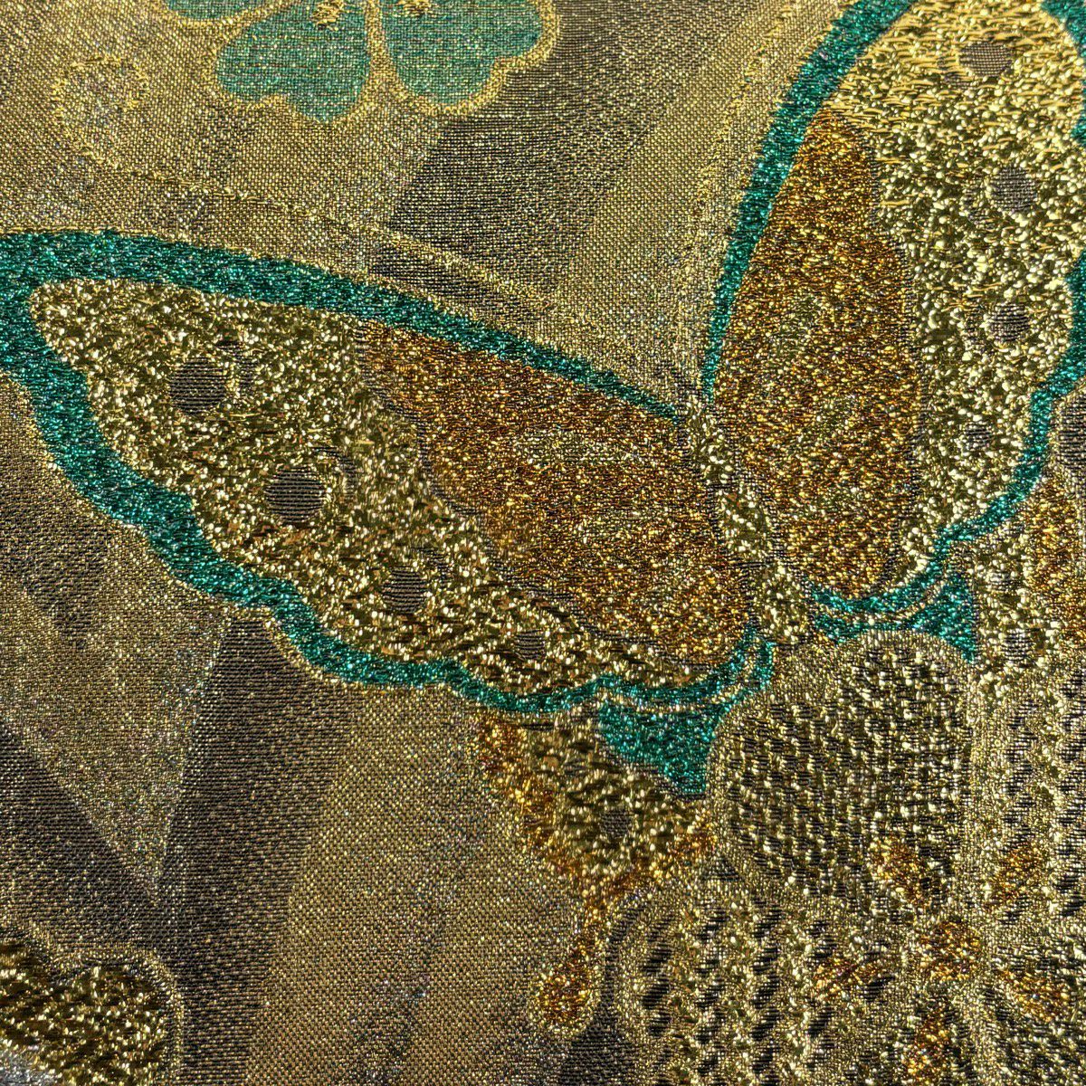 【美品】 袋帯 秀品 振袖向き 蝶 桜 金糸 箔 金色 六通 正絹