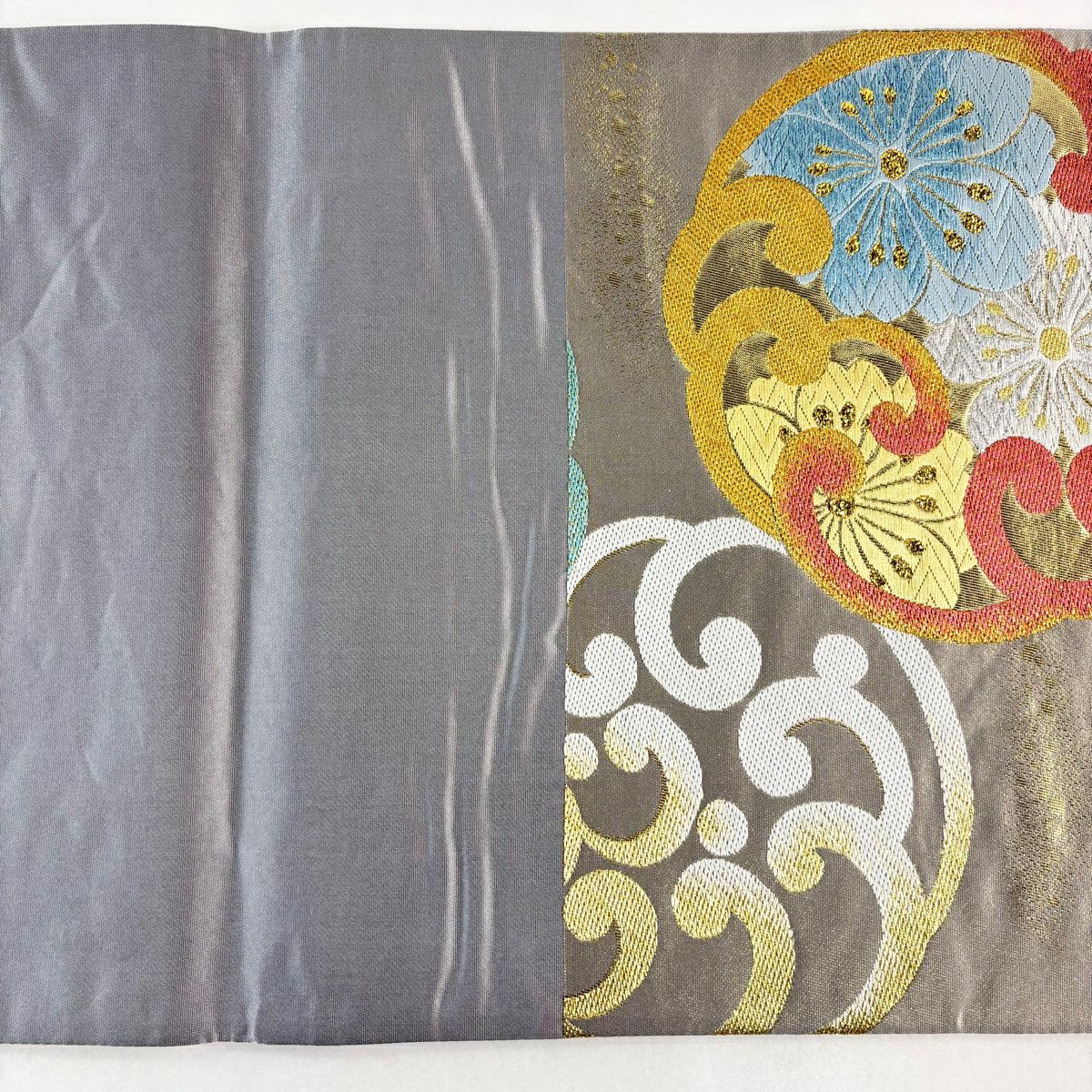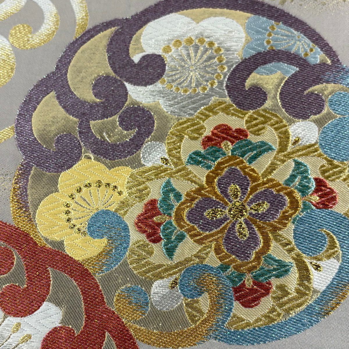 30%OFF 袋帯 秀品 草花 金銀糸 灰紫 六通 正絹 K30