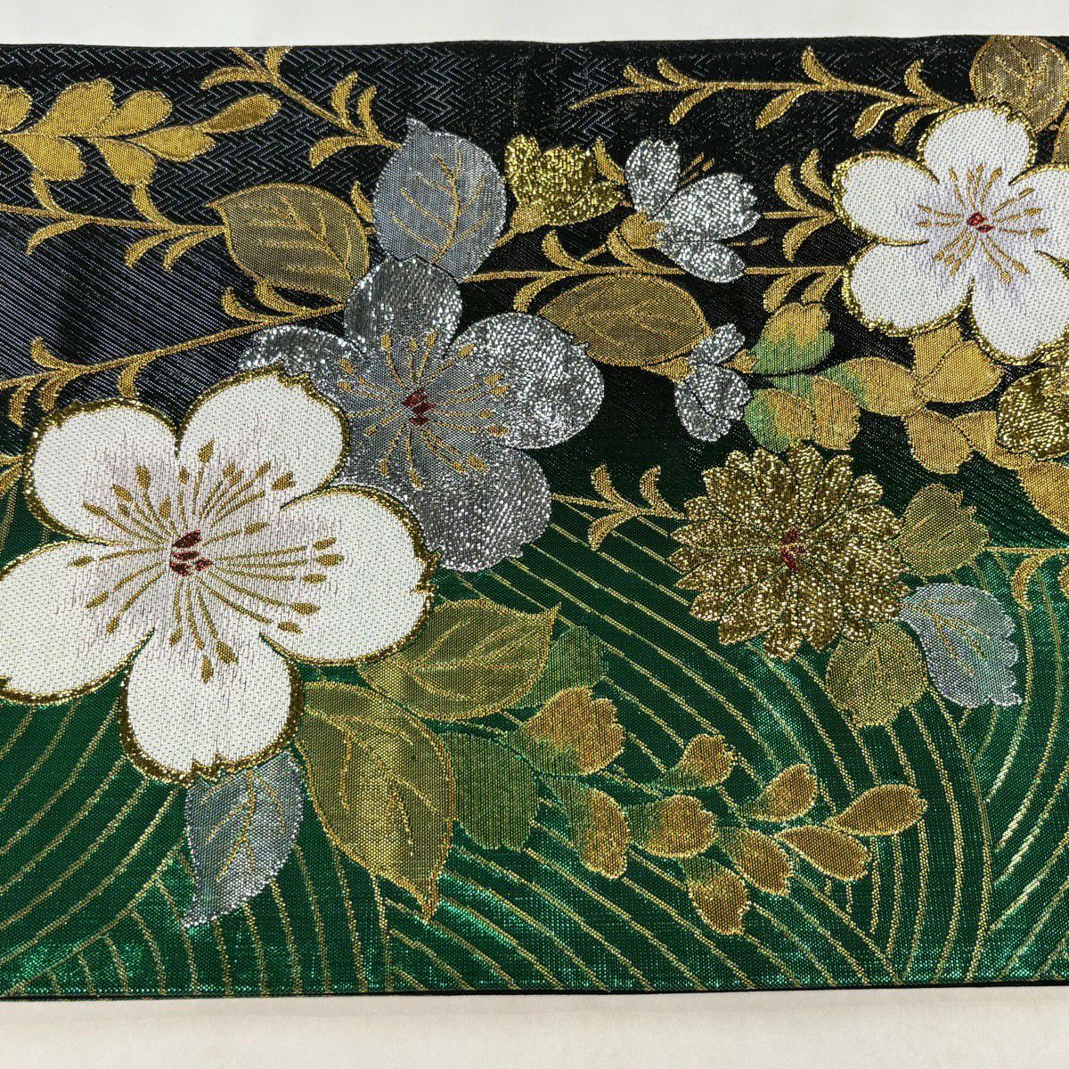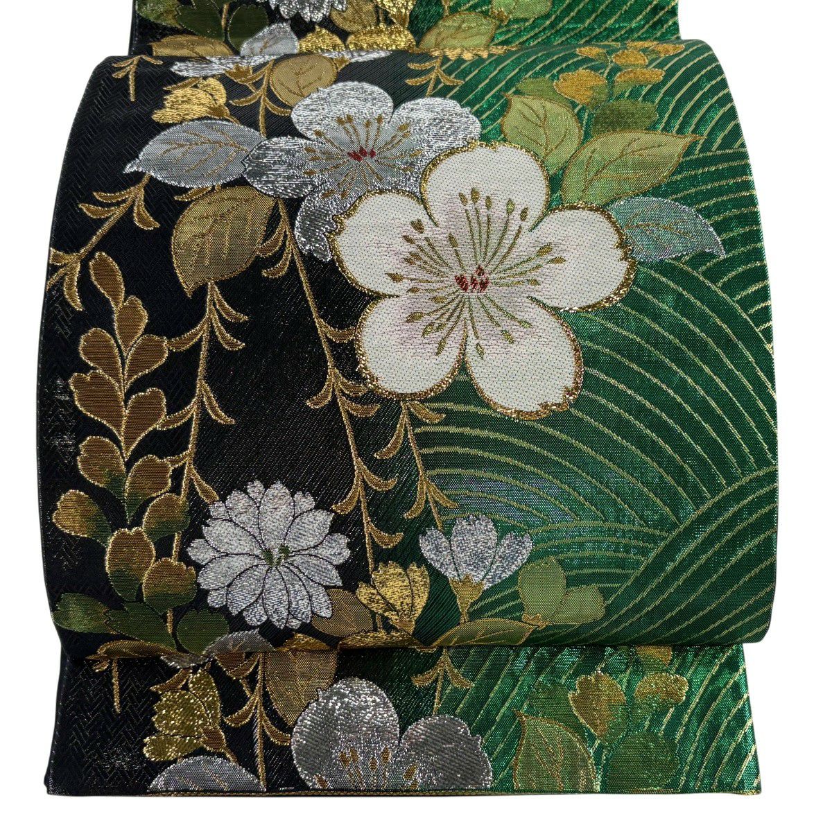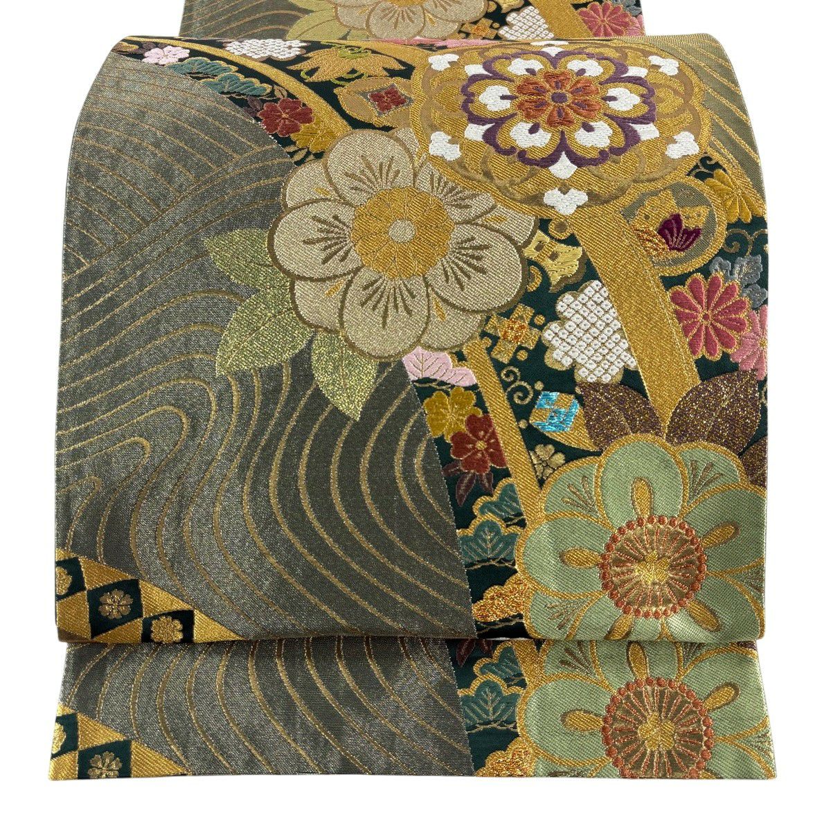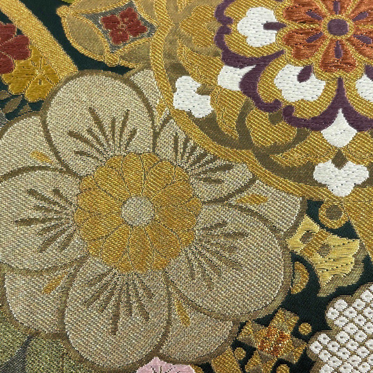 30%OFF 袋帯 秀品 草花 幾何学 深緑 六通 正絹 K30