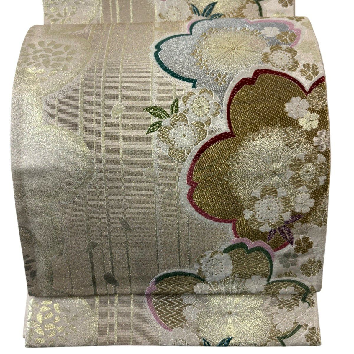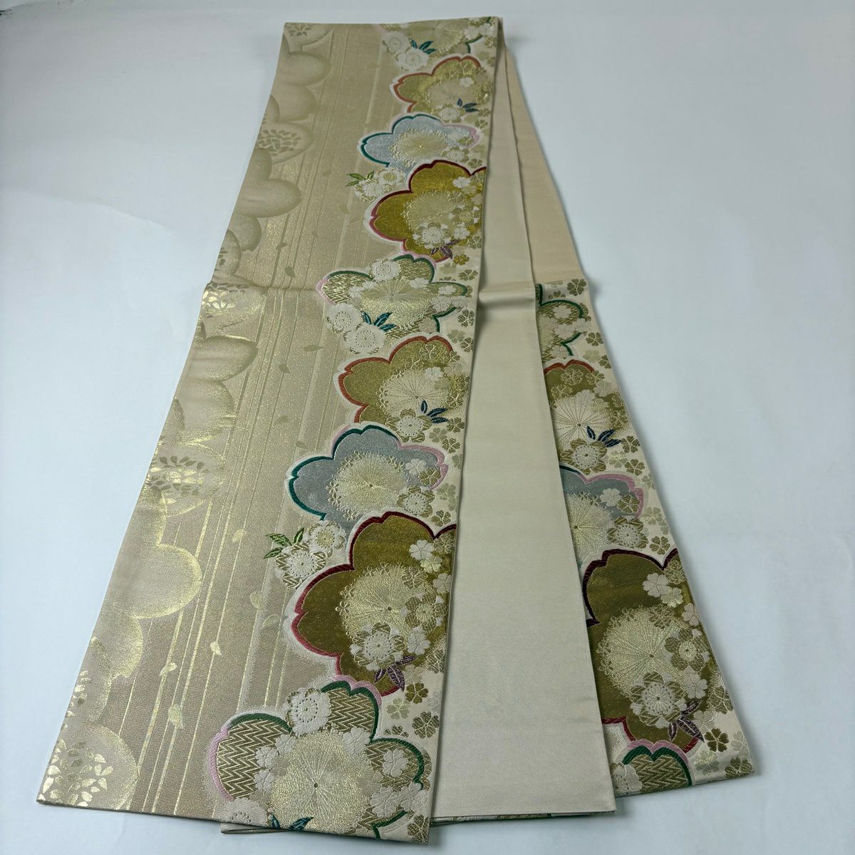 30%OFF 名古屋帯 秀品 桜 格子 金彩 灰緑 正絹 K30