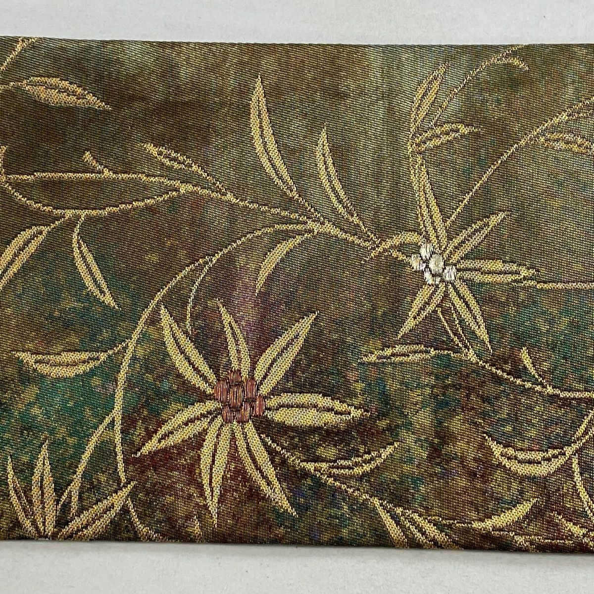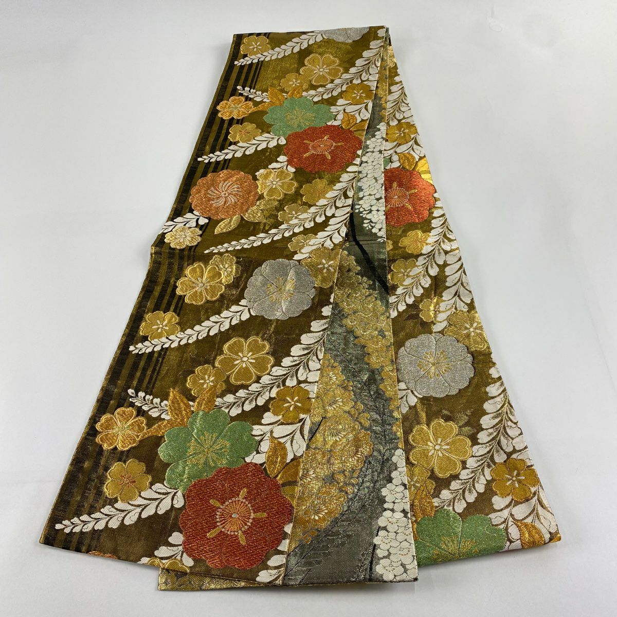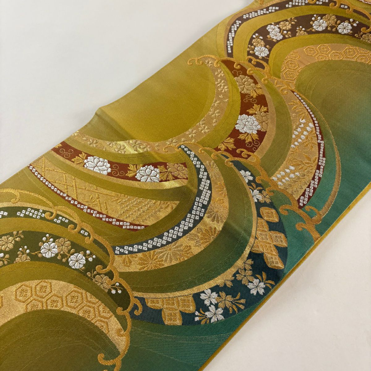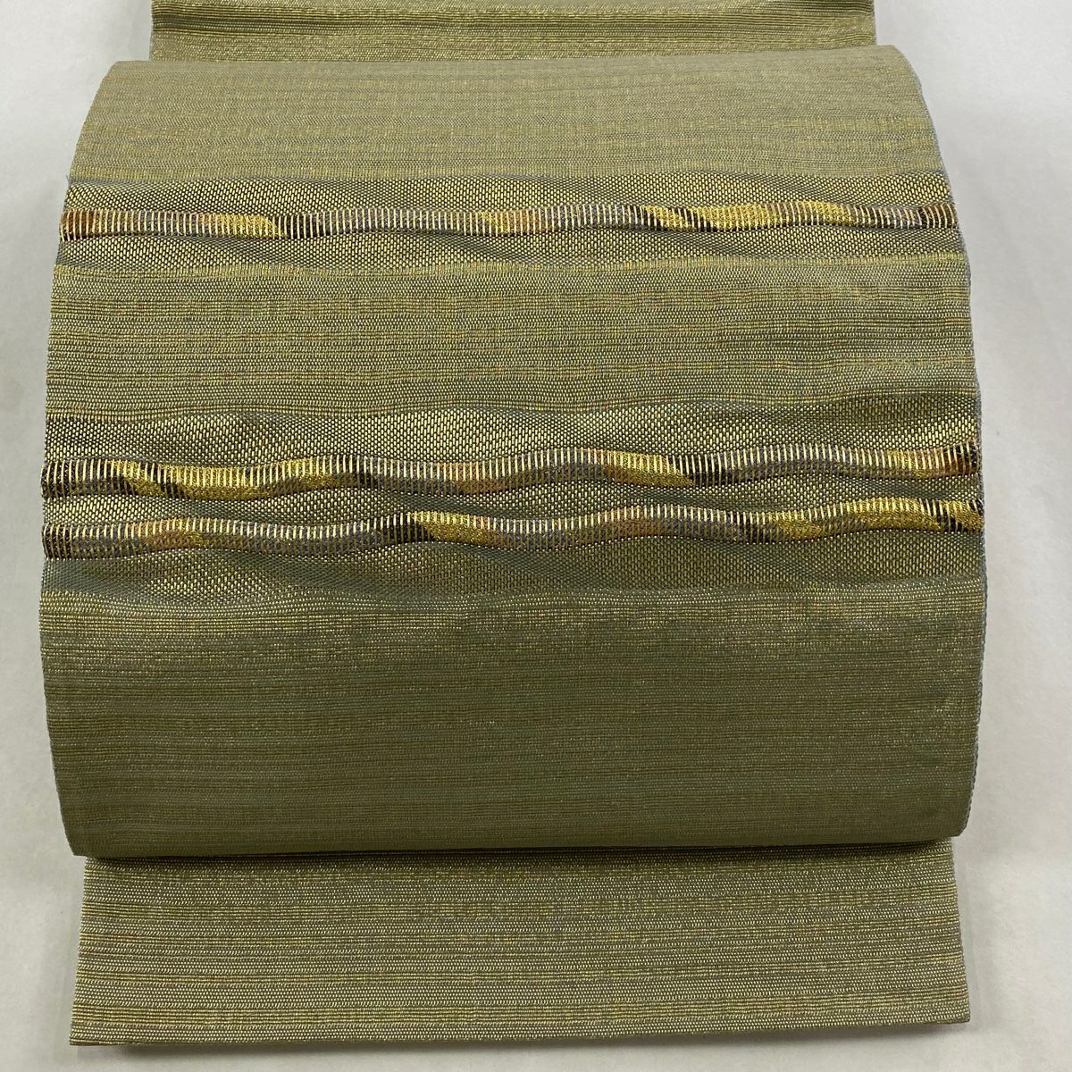 【在庫一掃】 袋帯 秀品 草花 波頭 唐織 箔 鶯色 六通 正絹