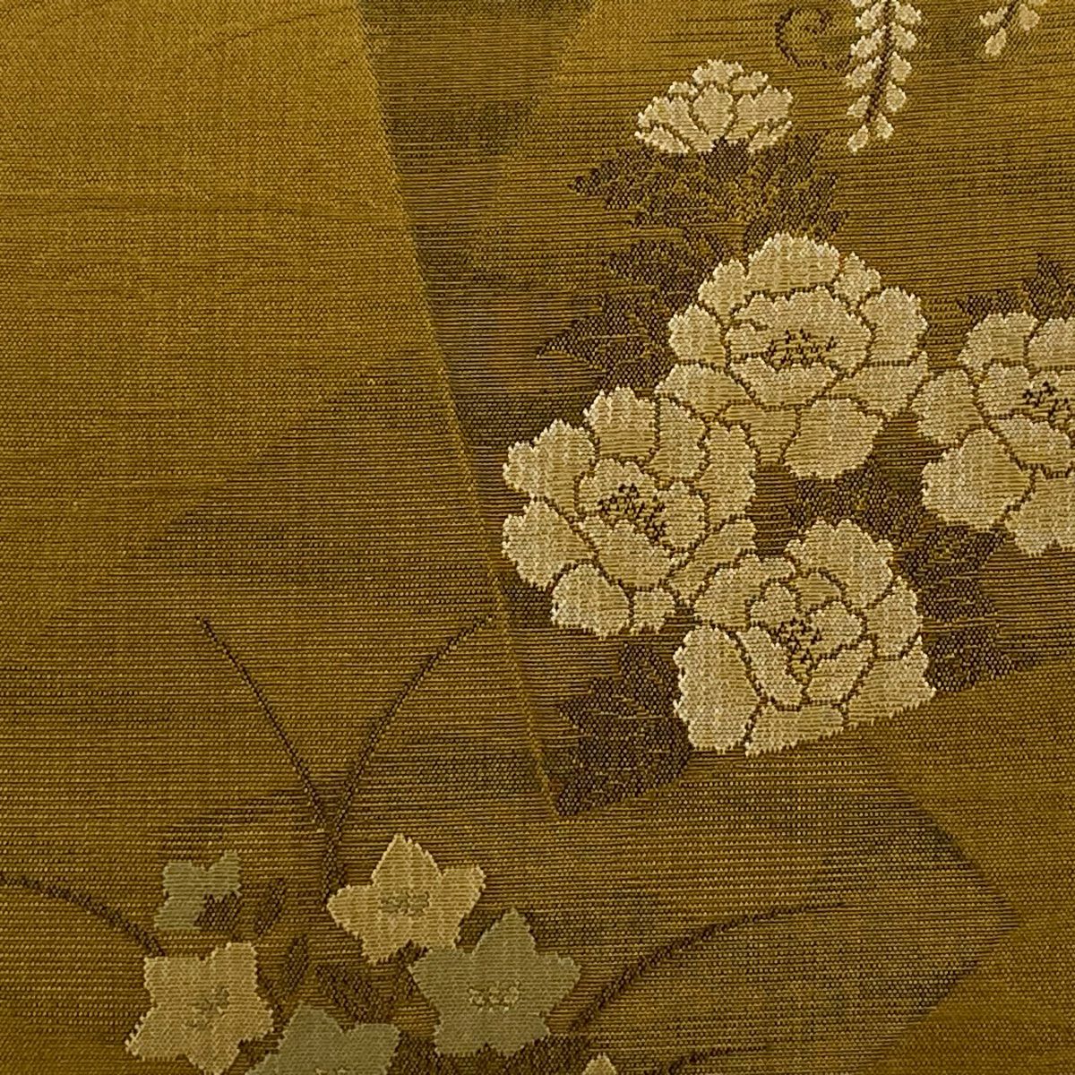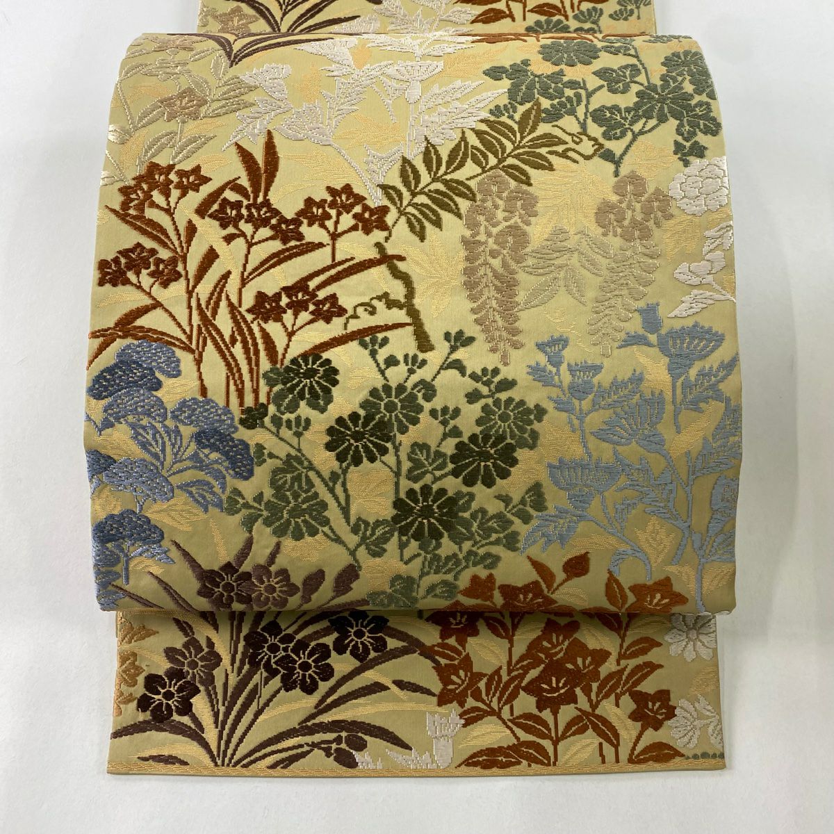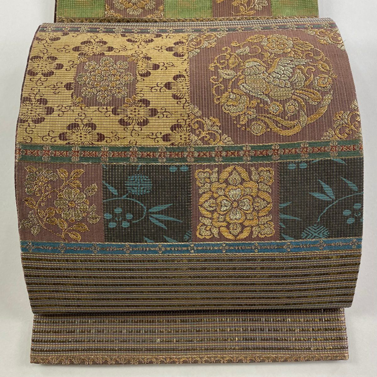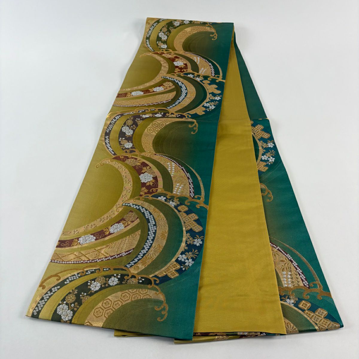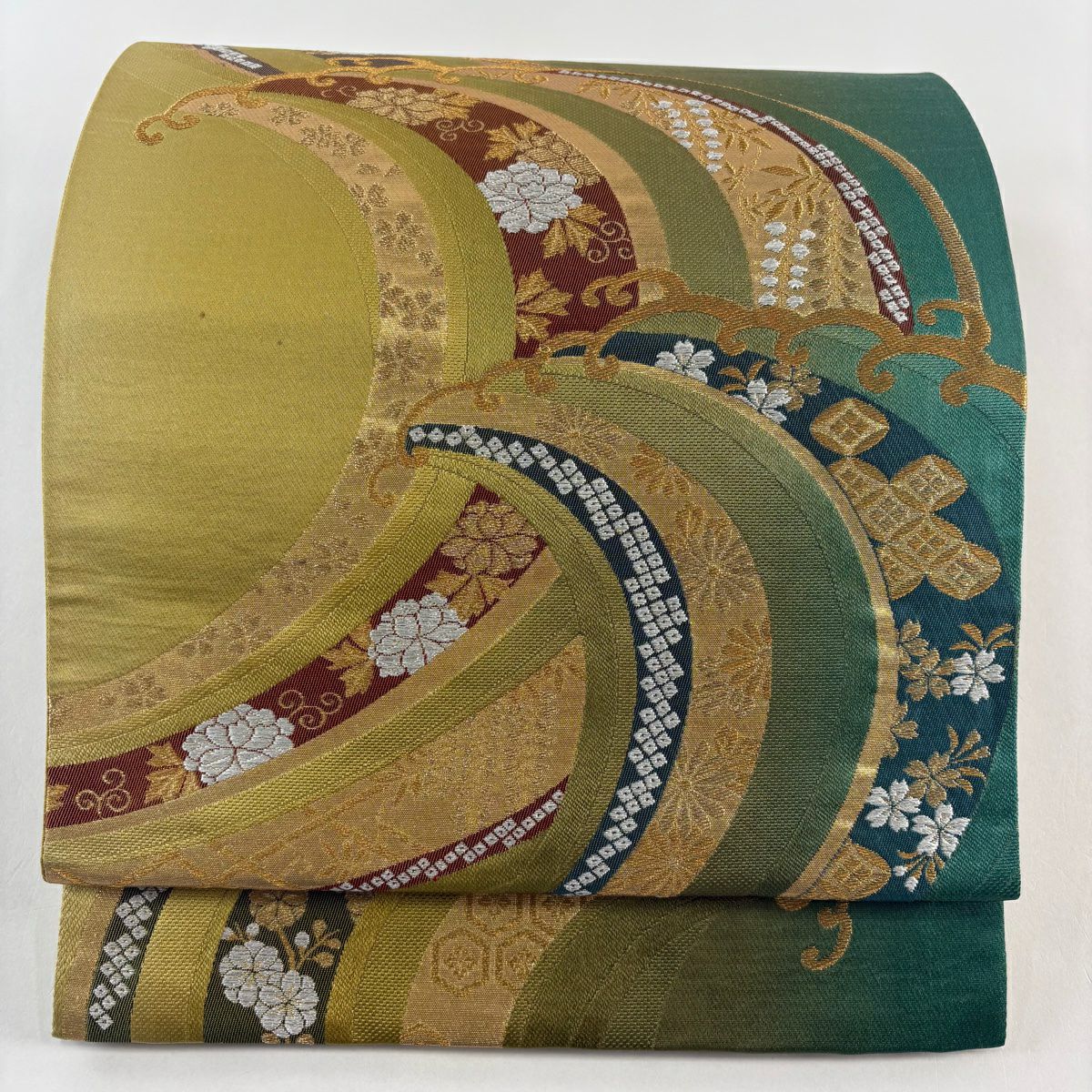 【在庫一掃】 袋帯 秀品 草花 波頭 唐織 箔 鶯色 六通 正絹