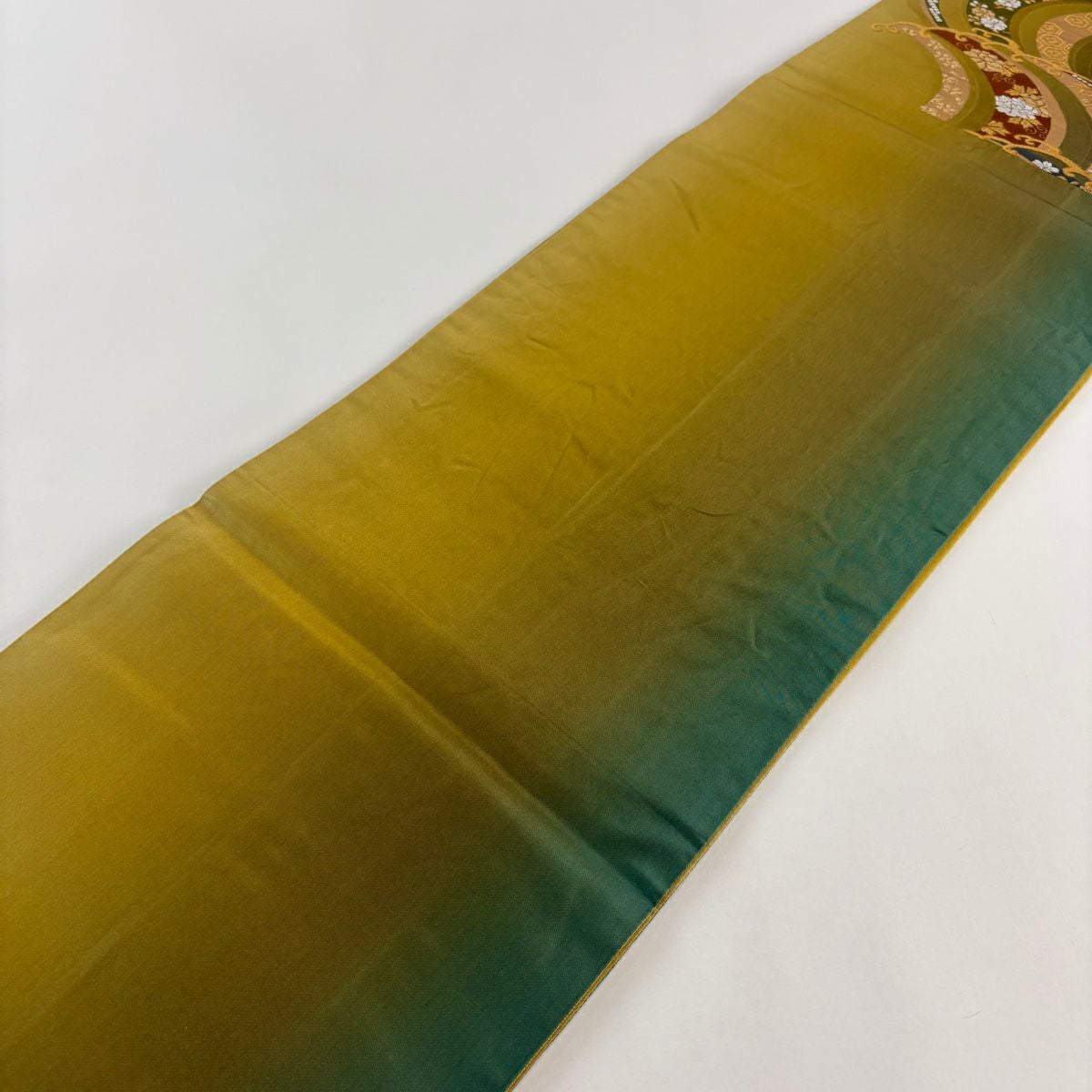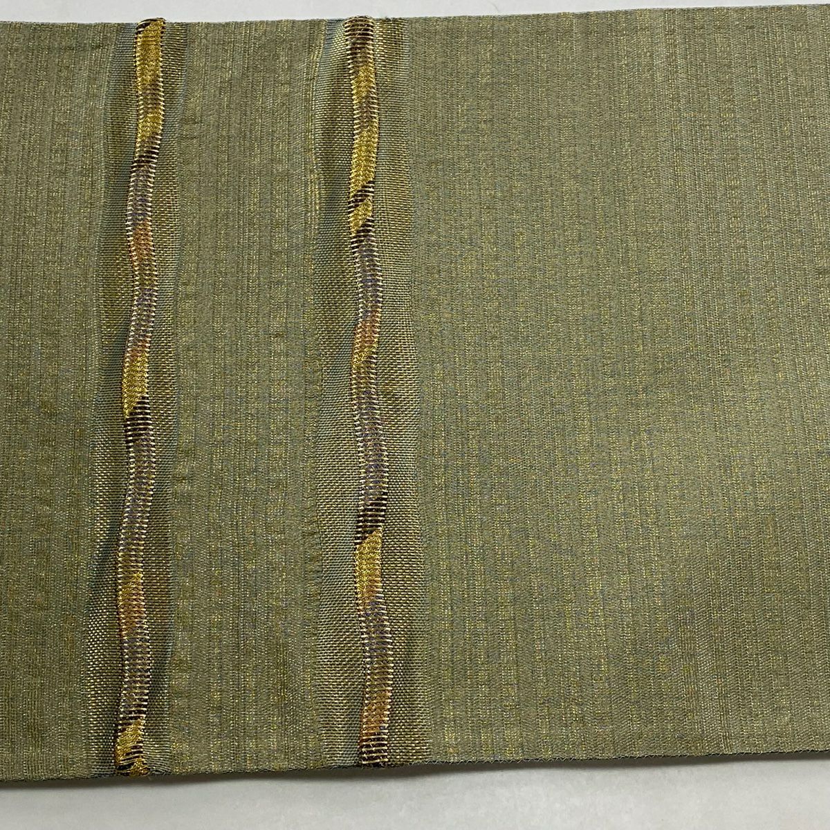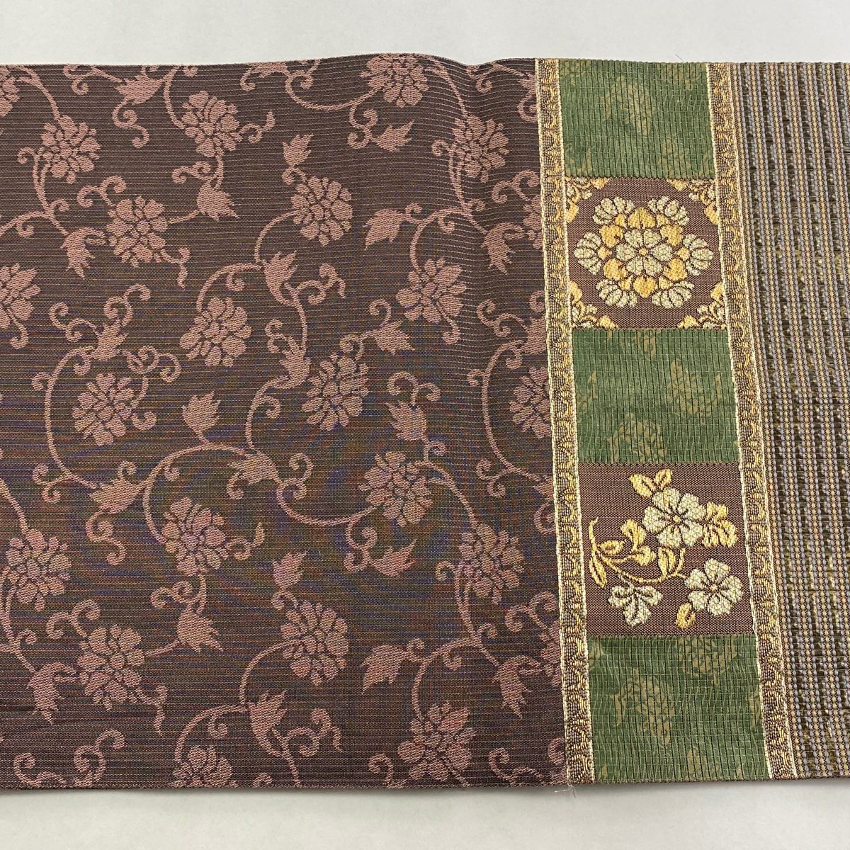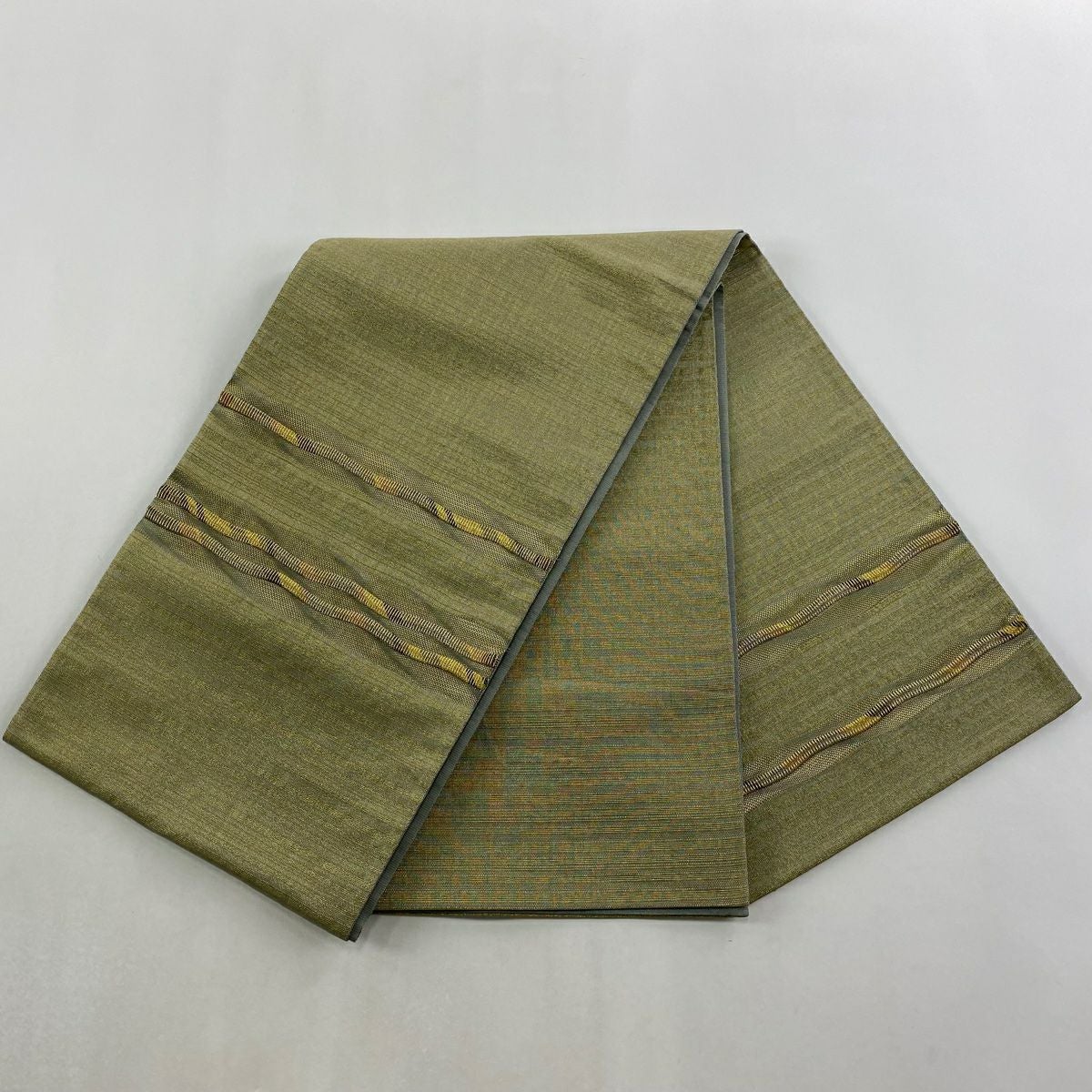 【在庫一掃】 袋帯 秀品 草花 波頭 唐織 箔 鶯色 六通 正絹