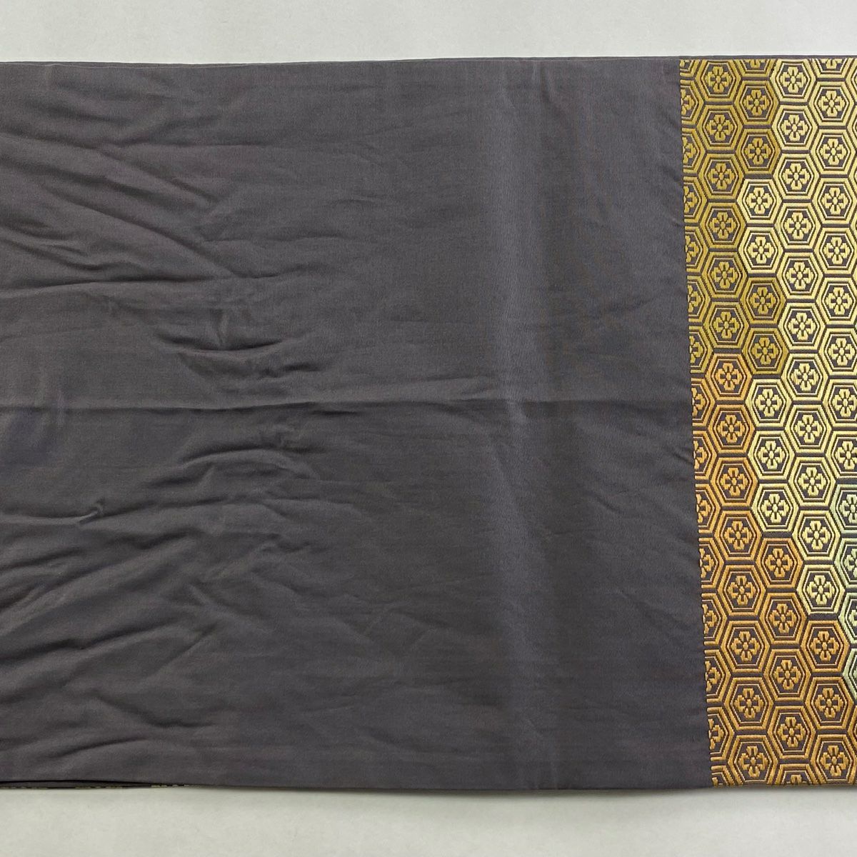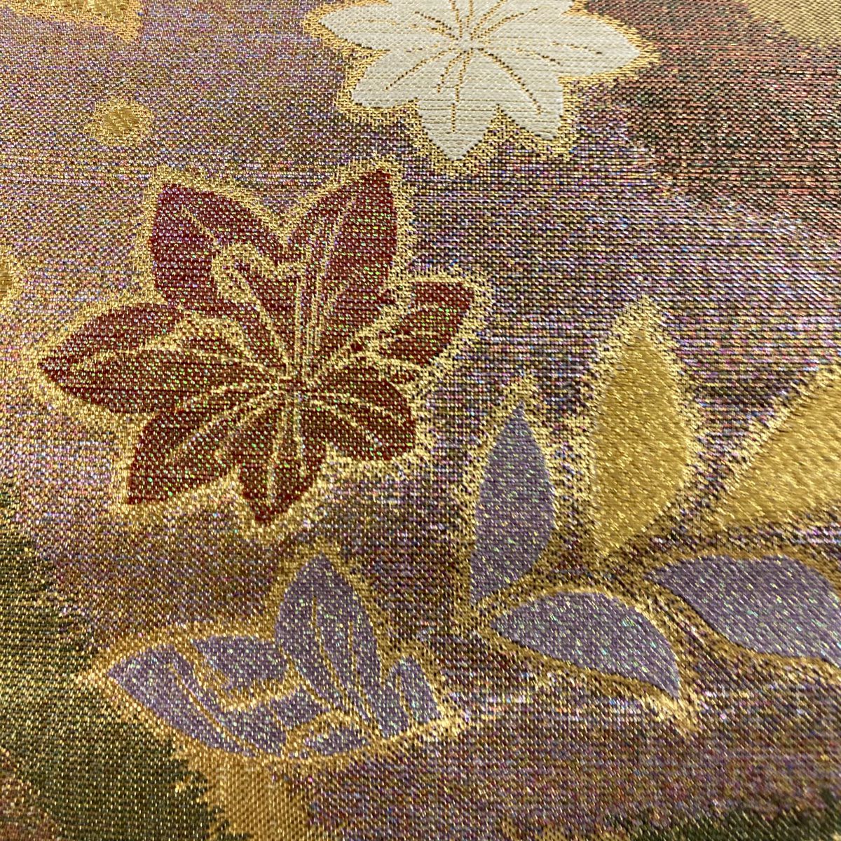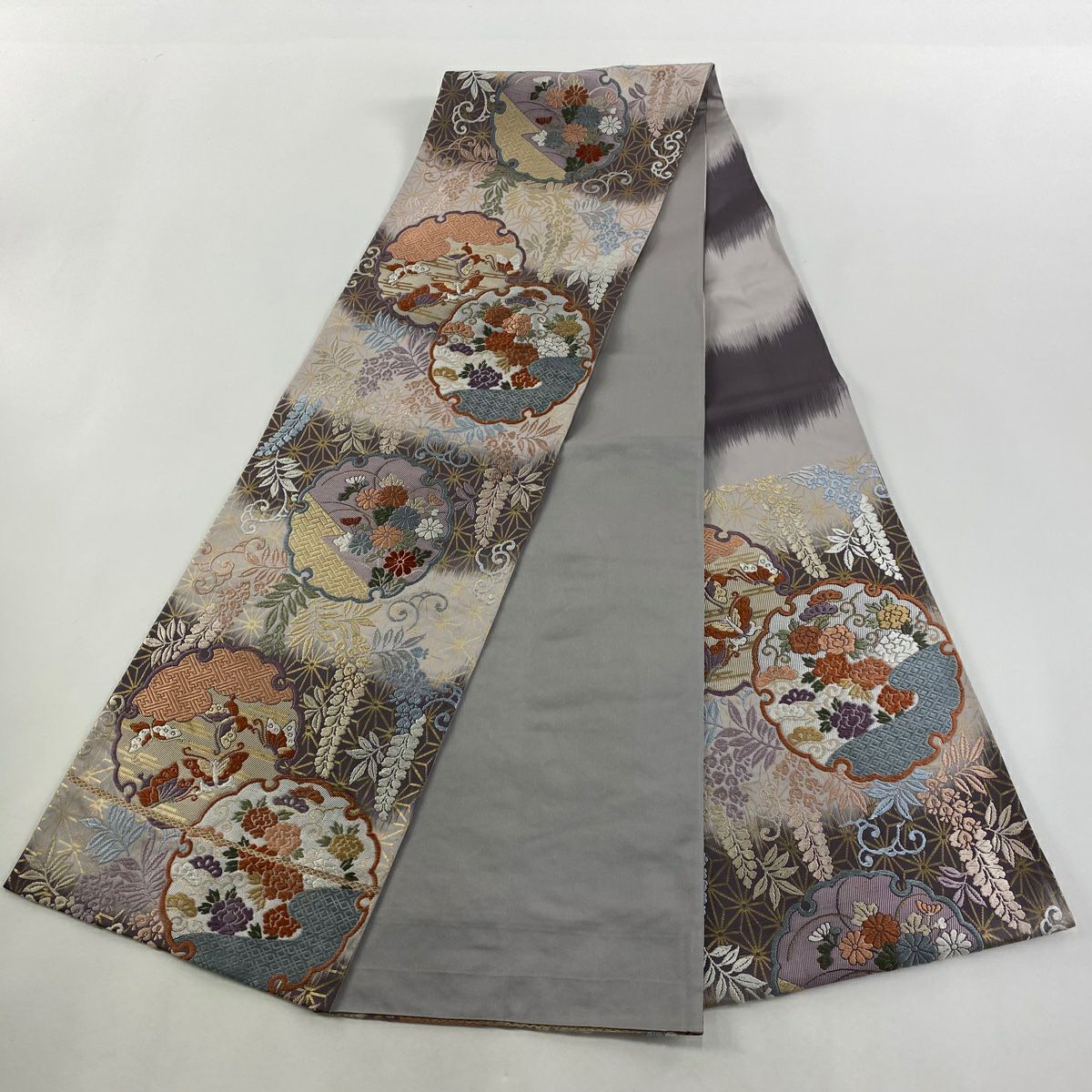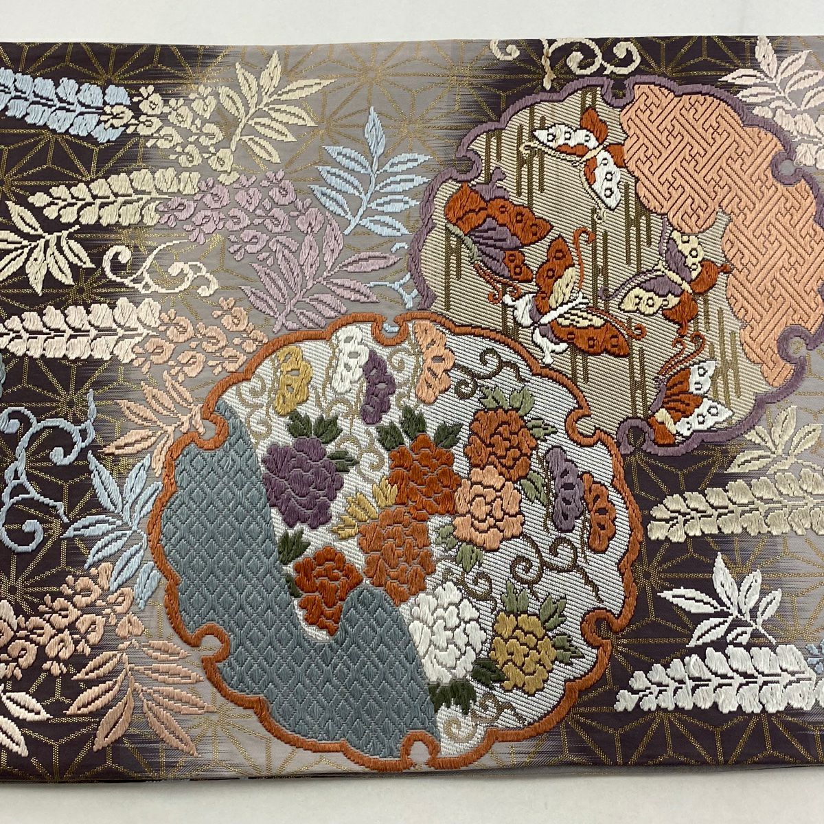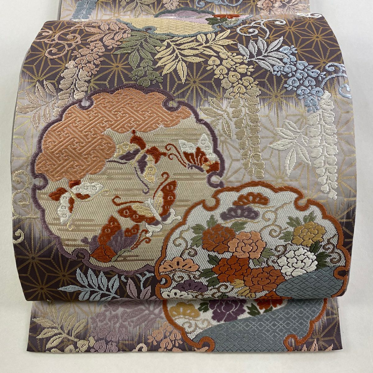【在庫一掃】 袋帯 秀品 雪輪 草花 唐織 箔 灰紫 六通 正絹