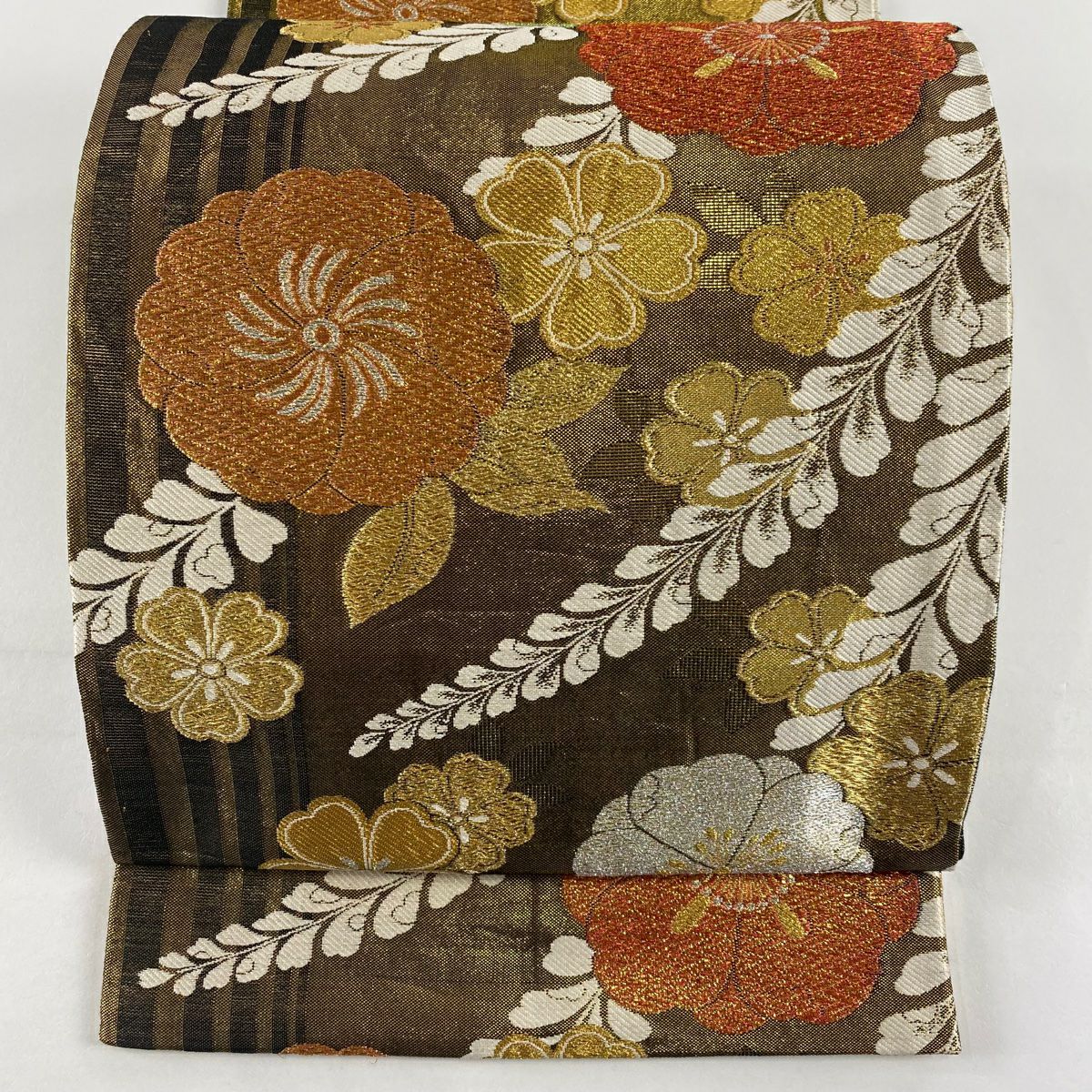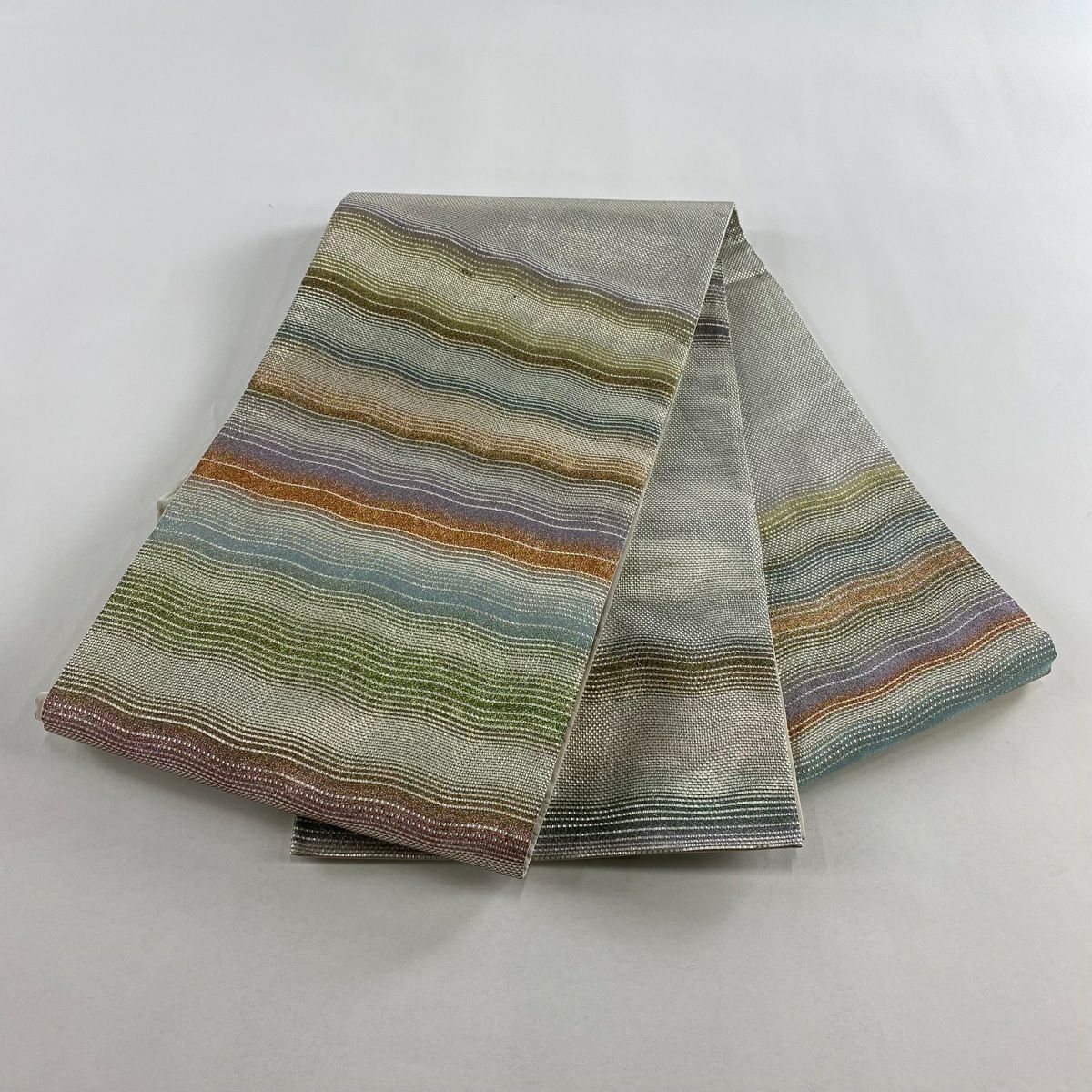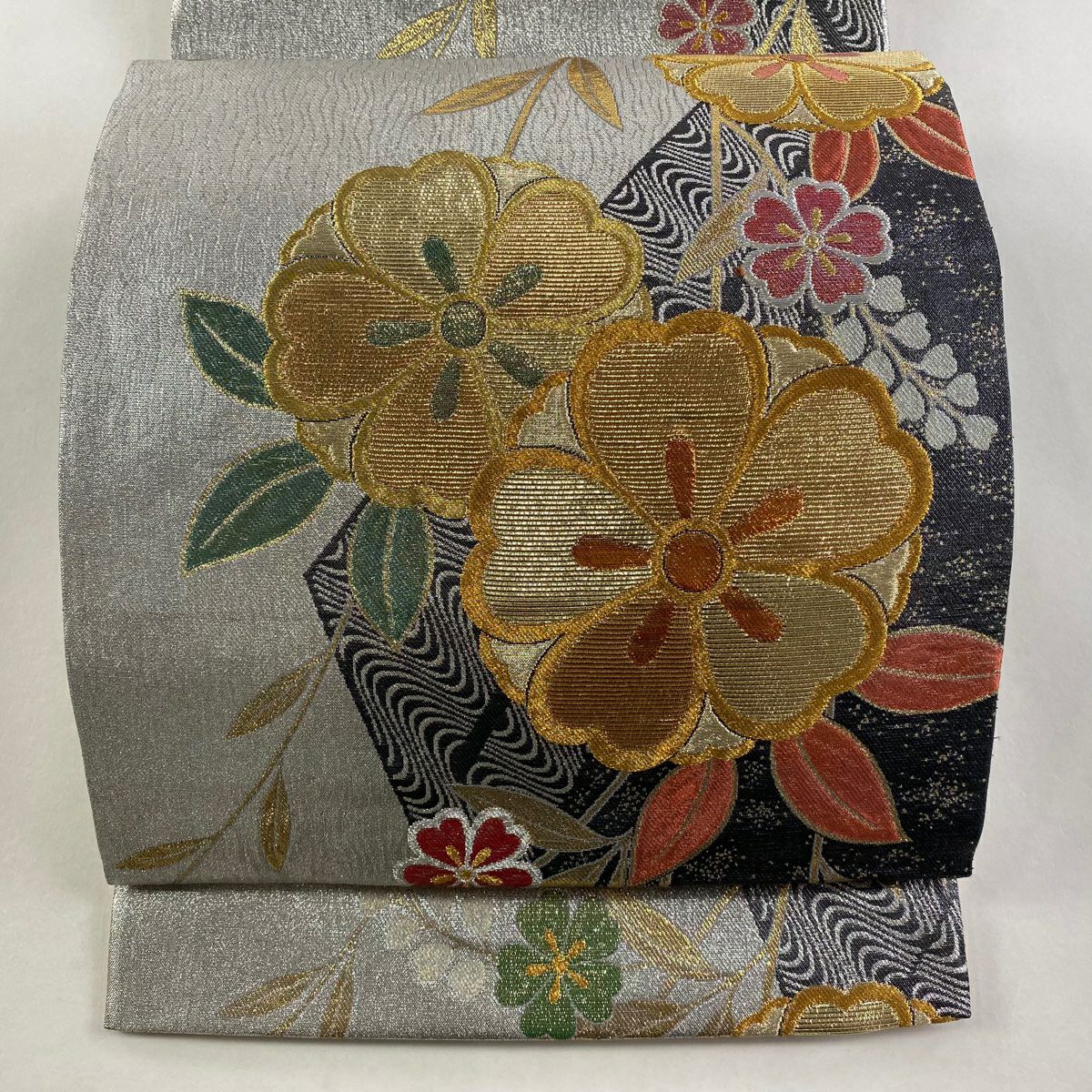 【在庫一掃】 【美品】 袋帯 秀品 草花 縞 箔 灰色 六通 正絹