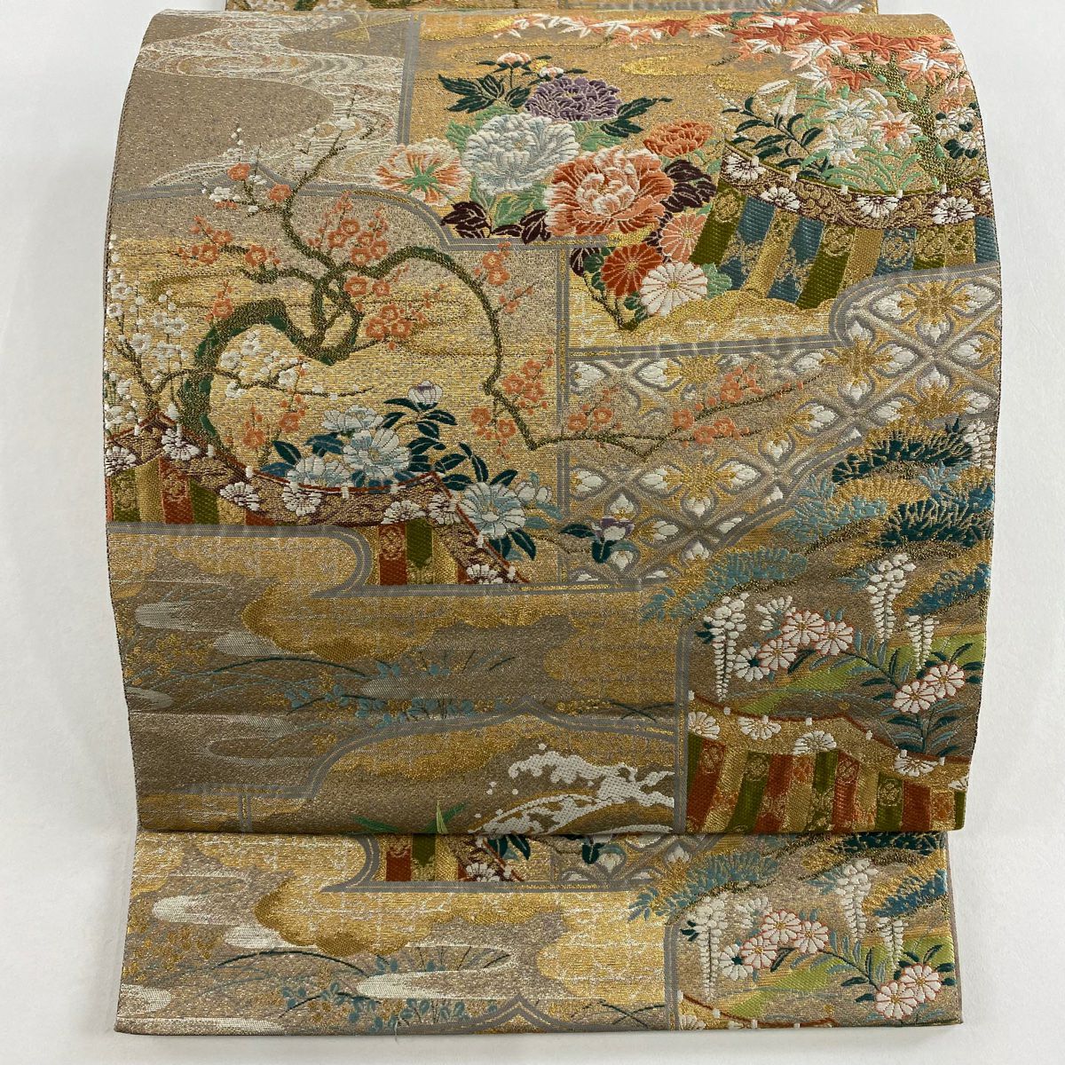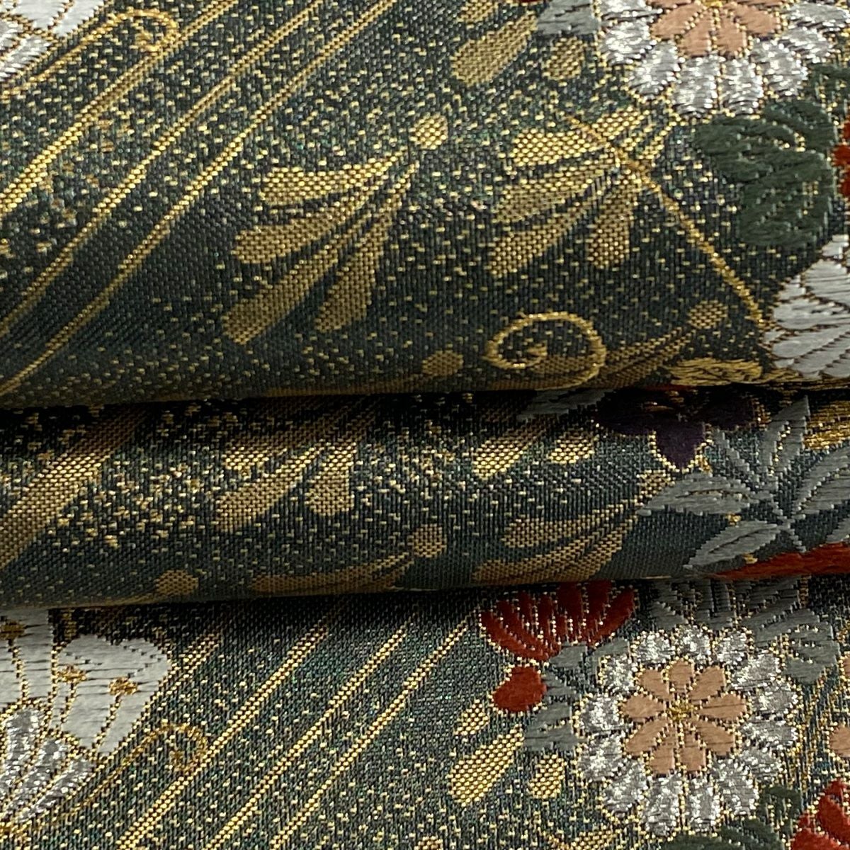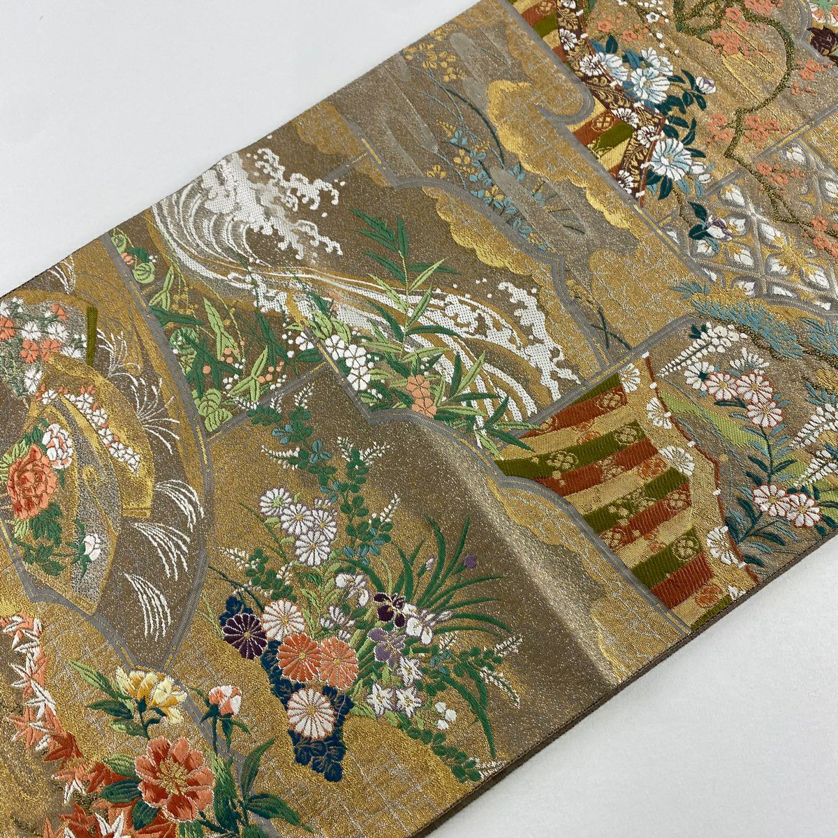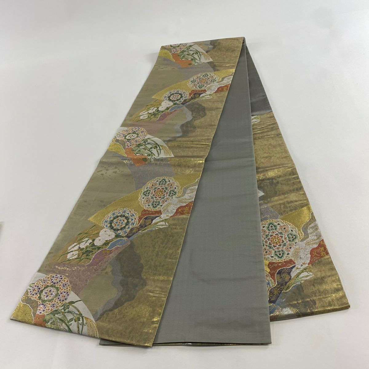 【在庫一掃】 袋帯 秀品 草花 流水 唐織 箔 灰緑 六通 正絹