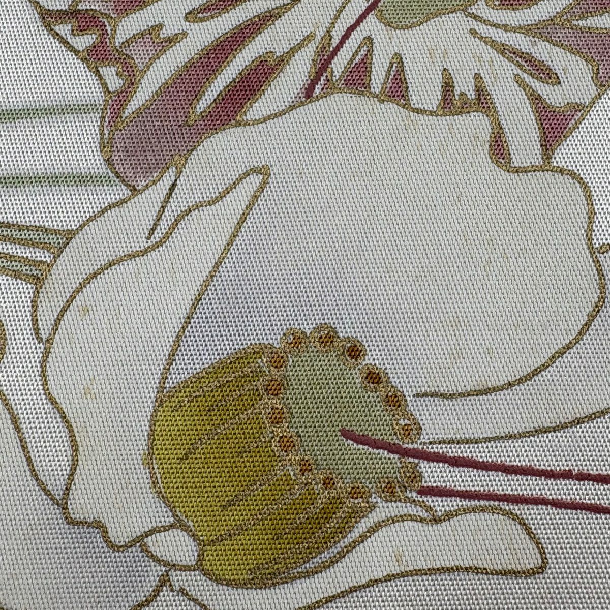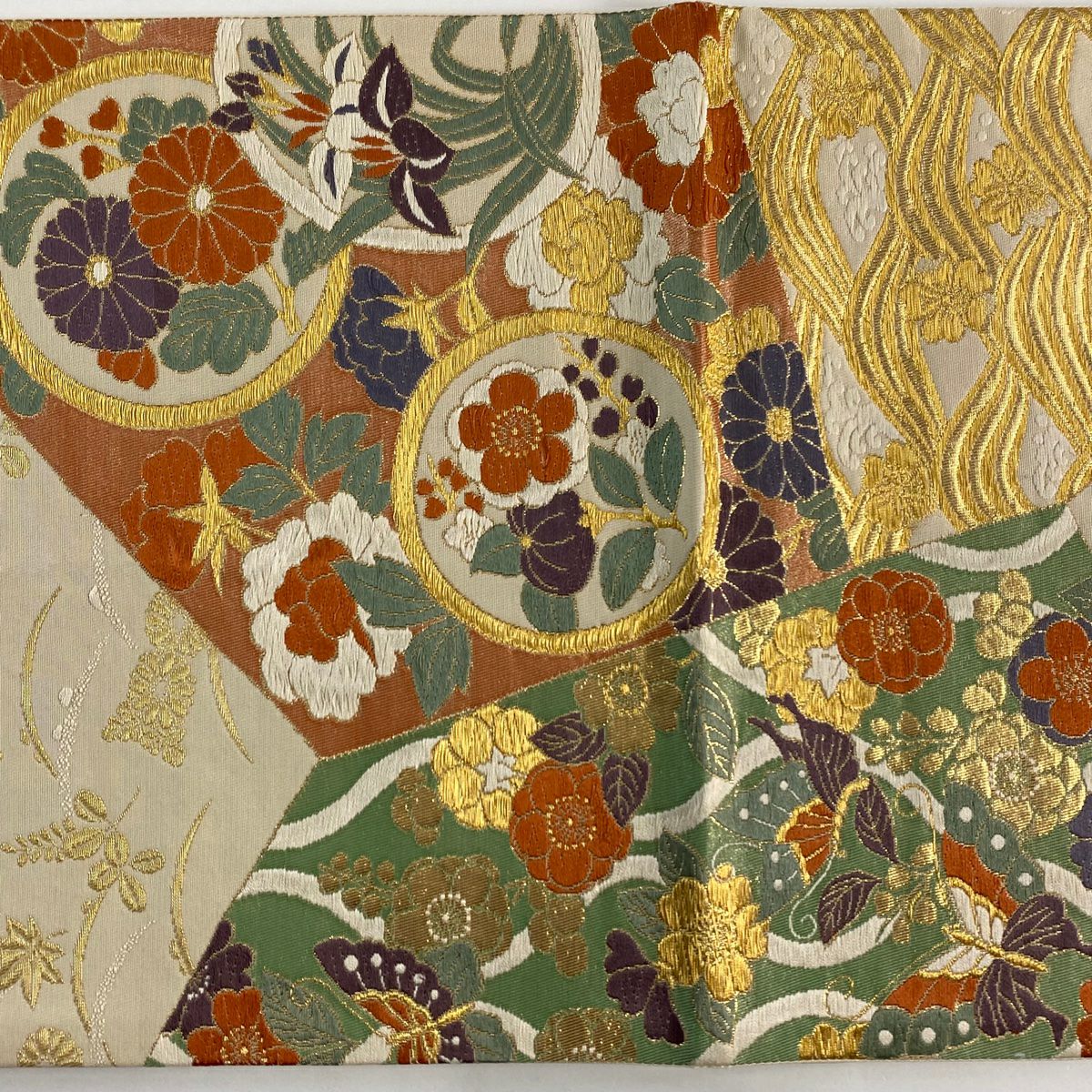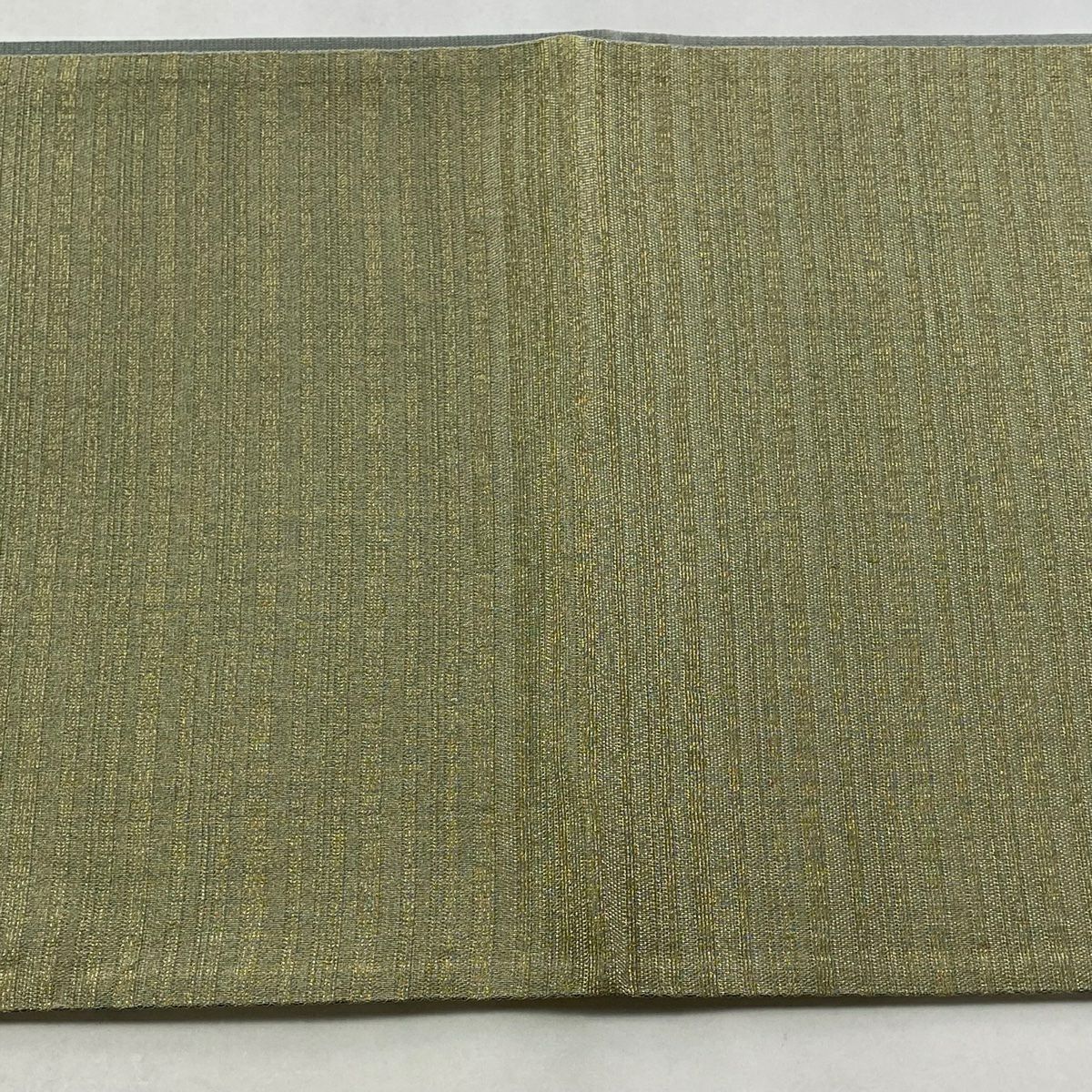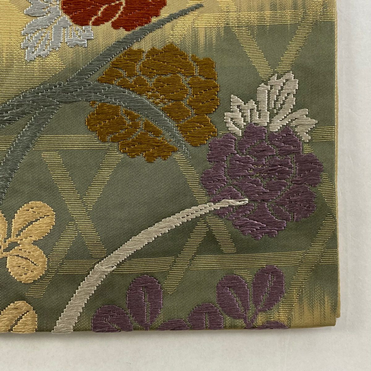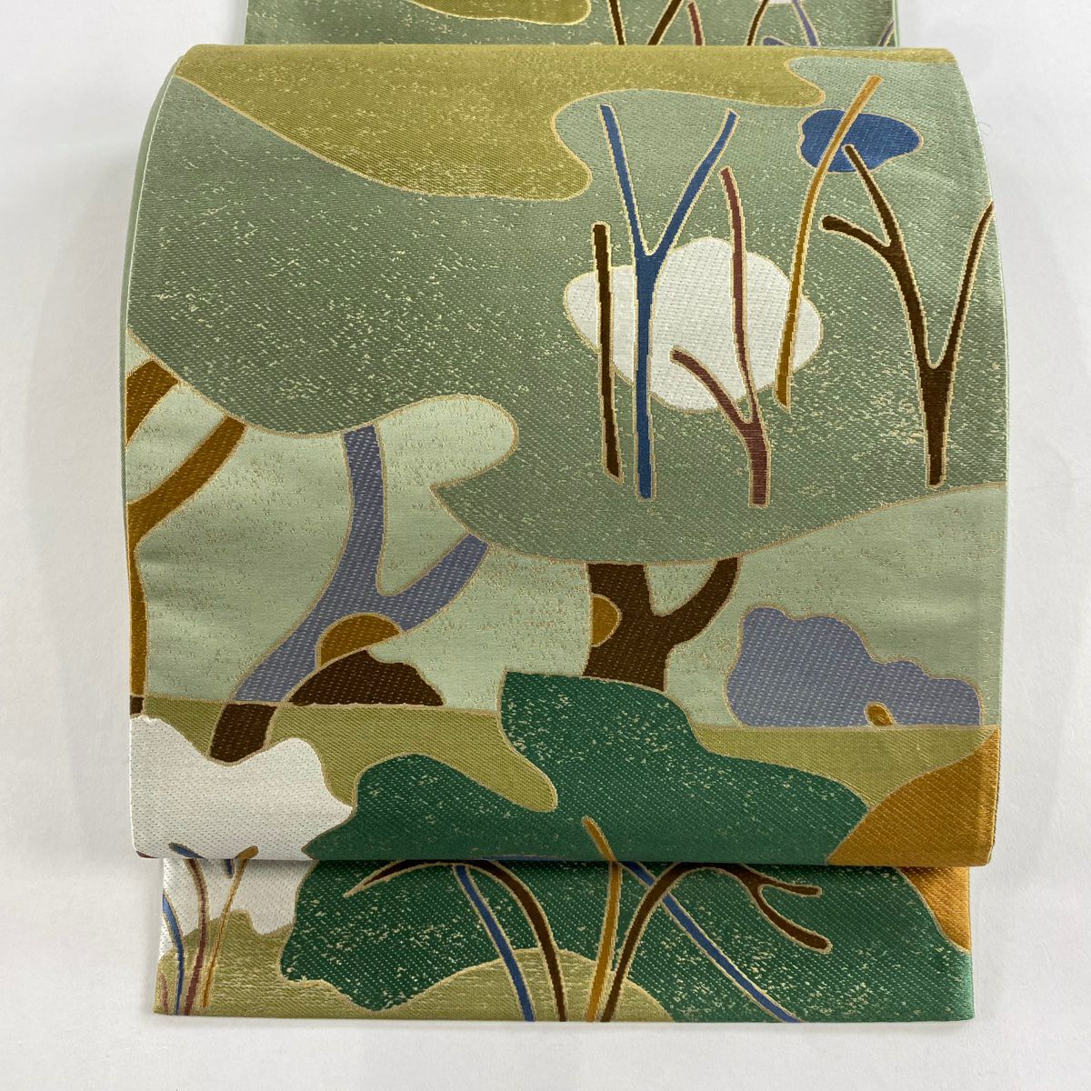 【在庫一掃】 袋帯 秀品 草花 流水 唐織 箔 灰緑 六通 正絹