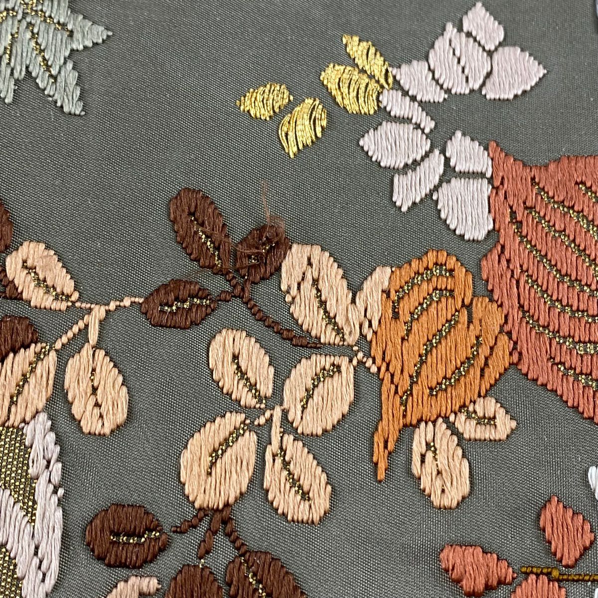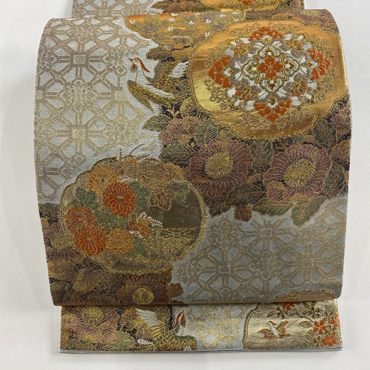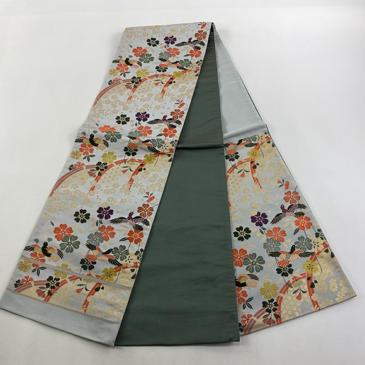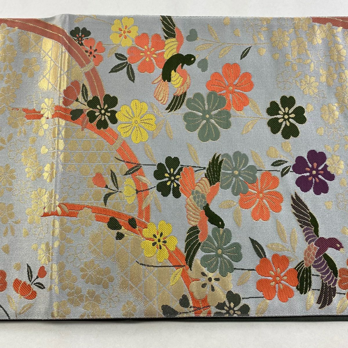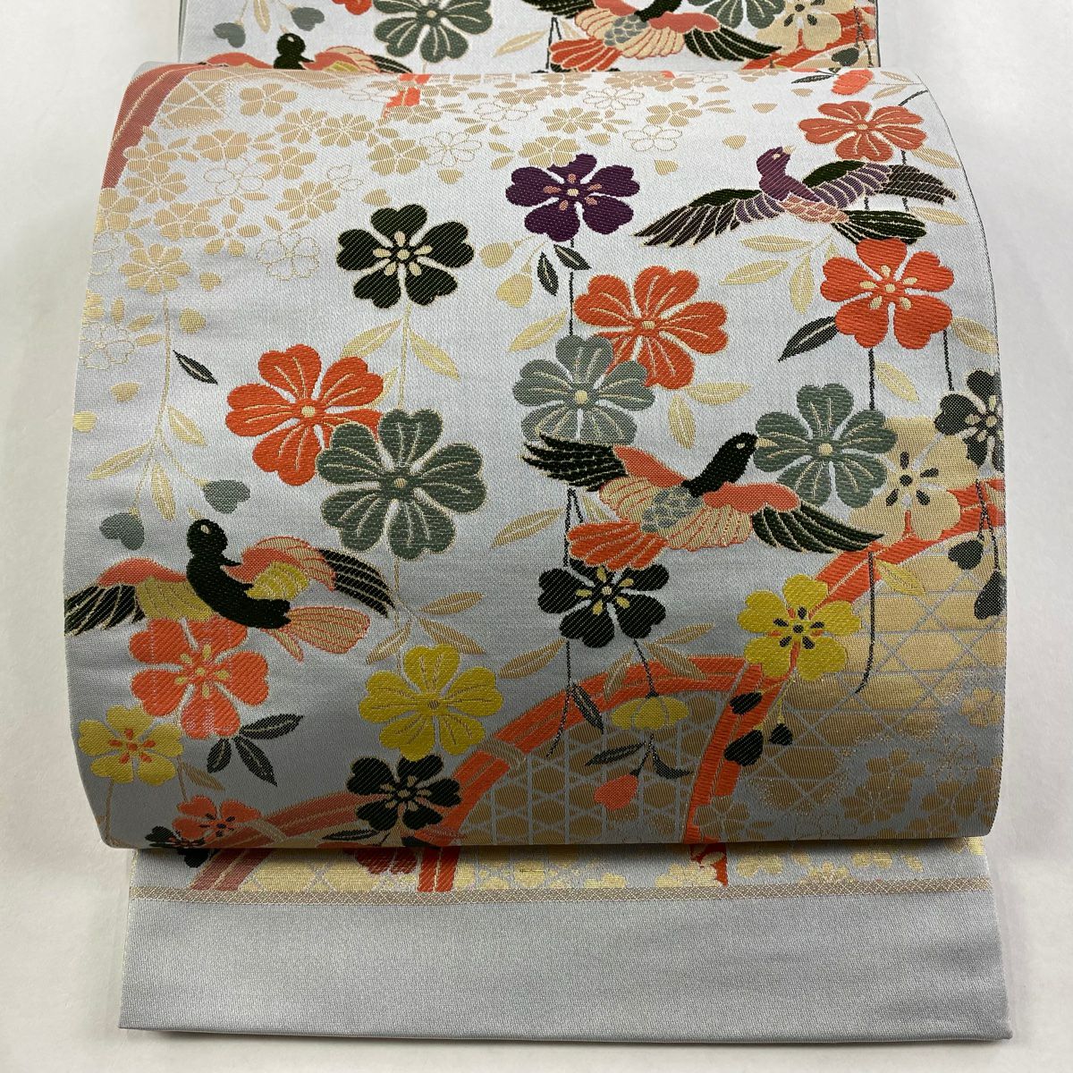 【在庫一掃】 【美品】 袋帯 秀品 草花 鳥 箔 灰色 六通 正絹