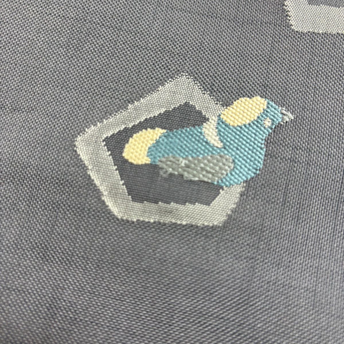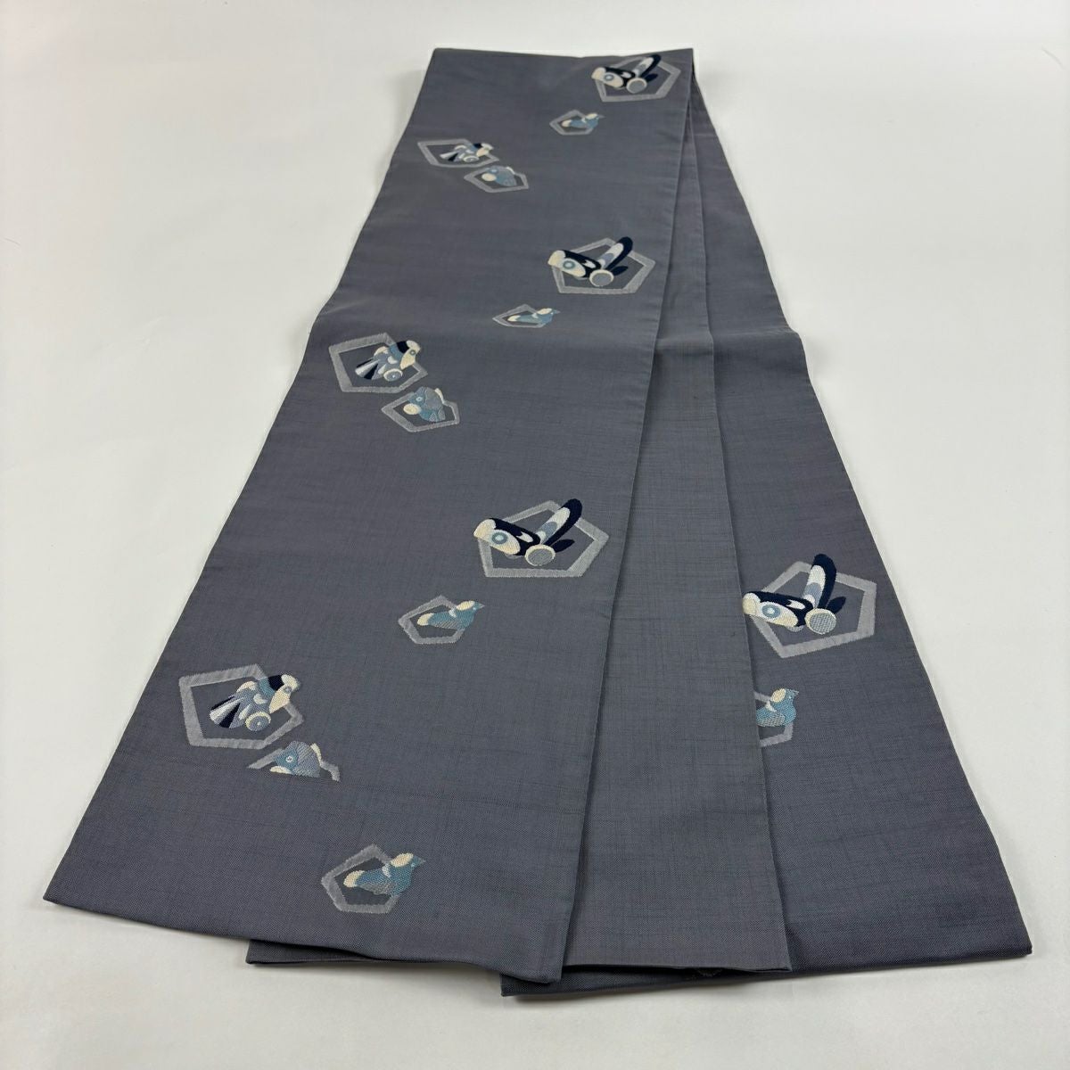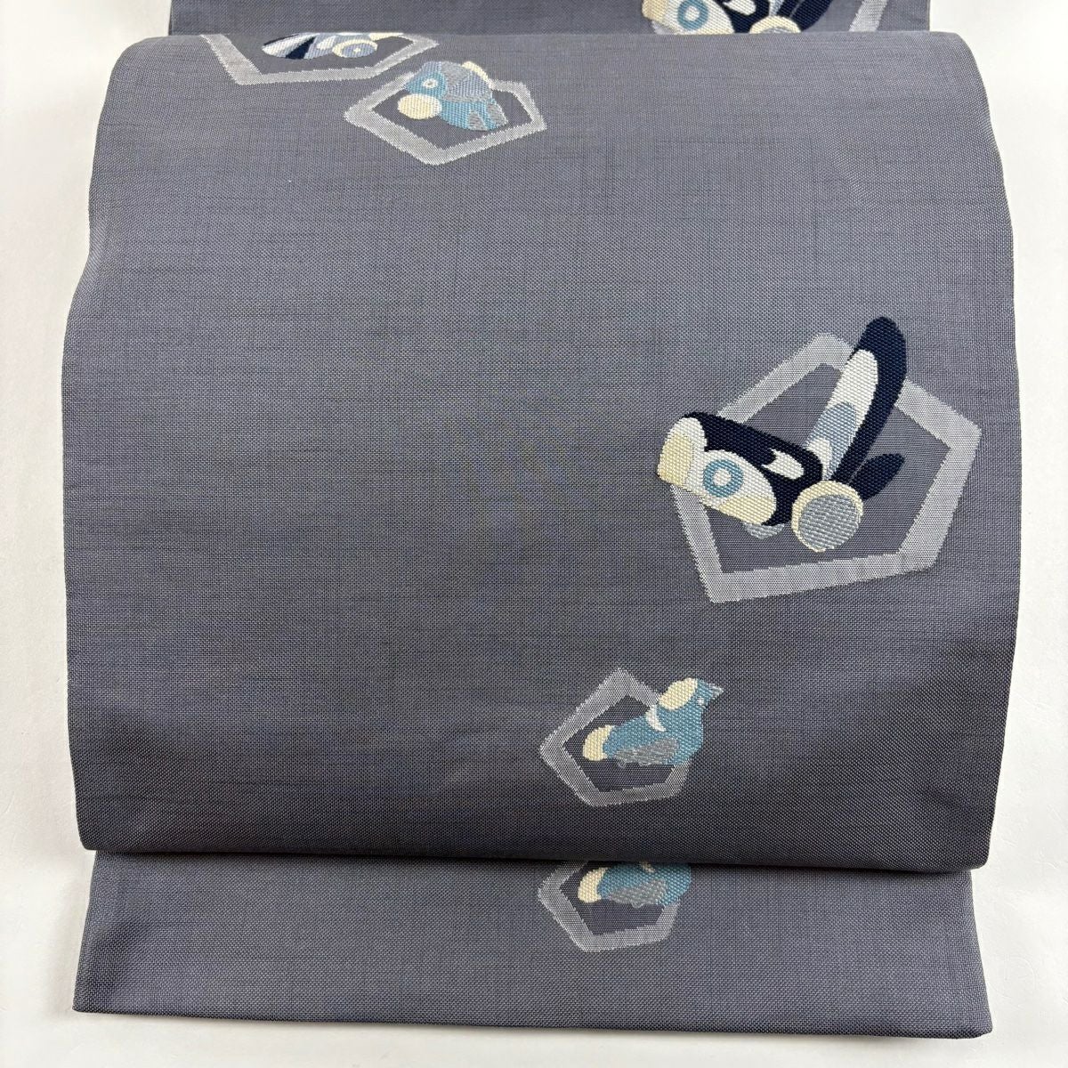 【在庫一掃】 袋帯 秀品 紬地 玩具 幾何学 青灰色 六通 正絹
