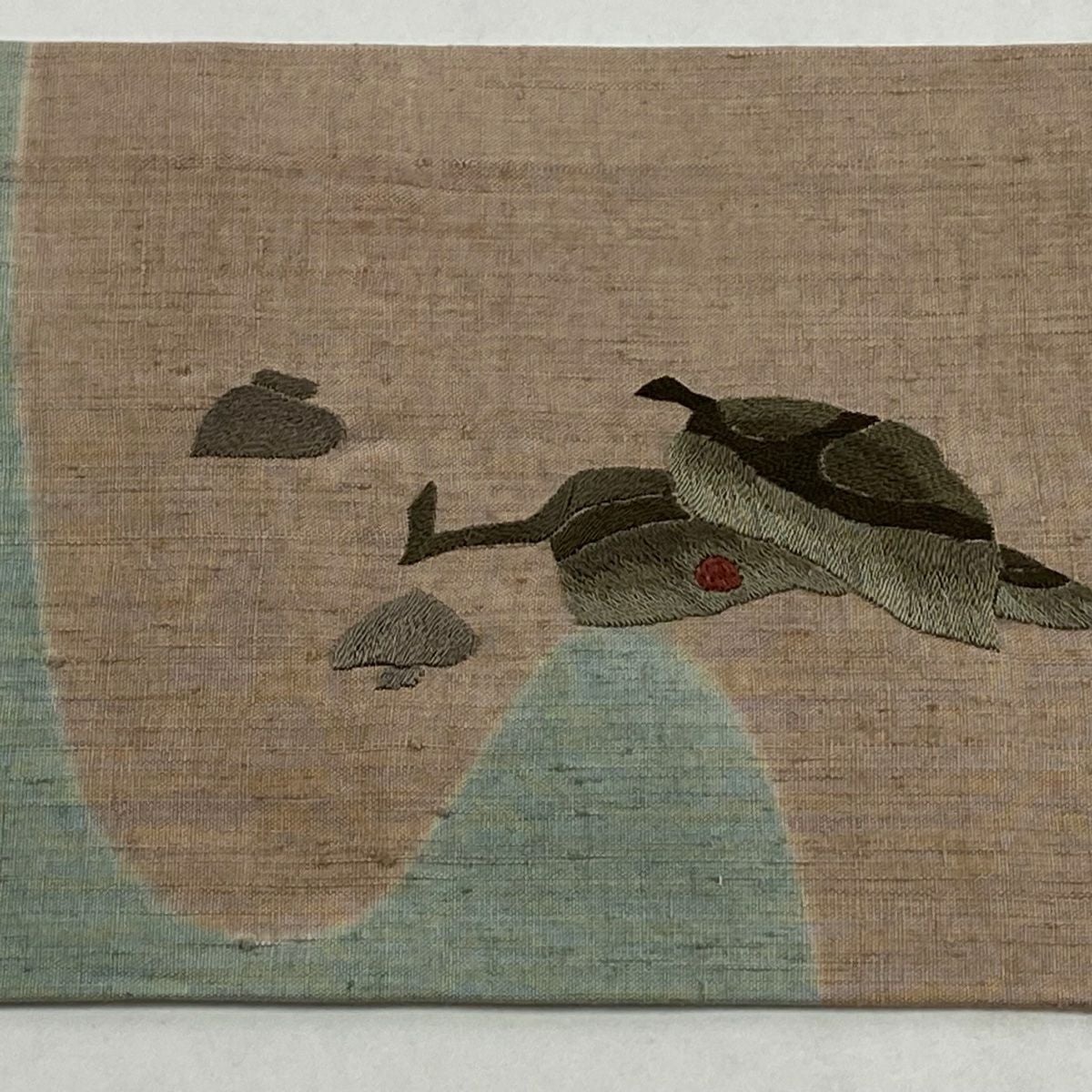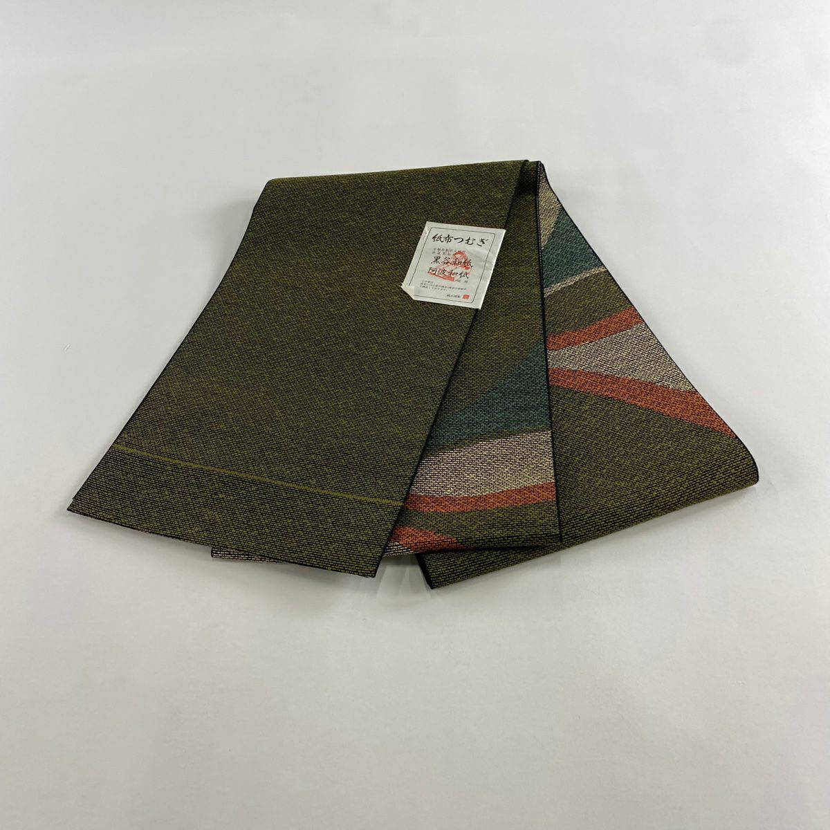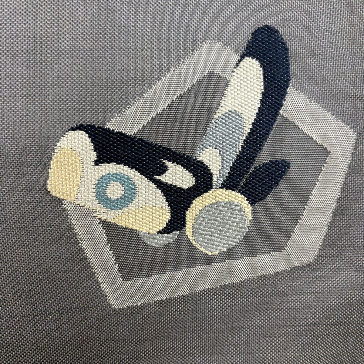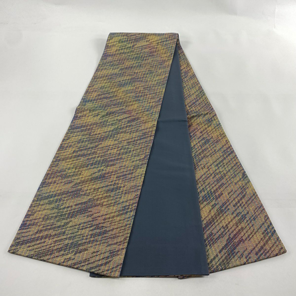 【在庫一掃】 袋帯 秀品 紬地 玩具 幾何学 青灰色 六通 正絹