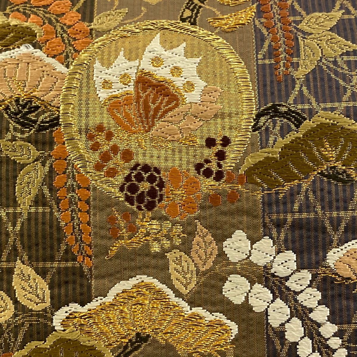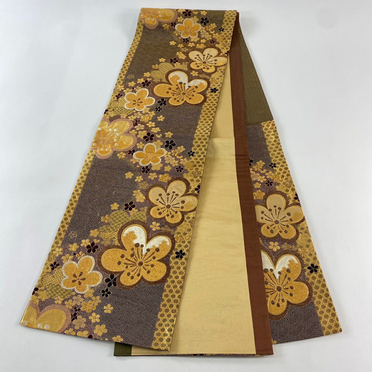 【在庫一掃】 袋帯 秀品 幾何学 金糸 箔 茶色 お太鼓柄 正絹
