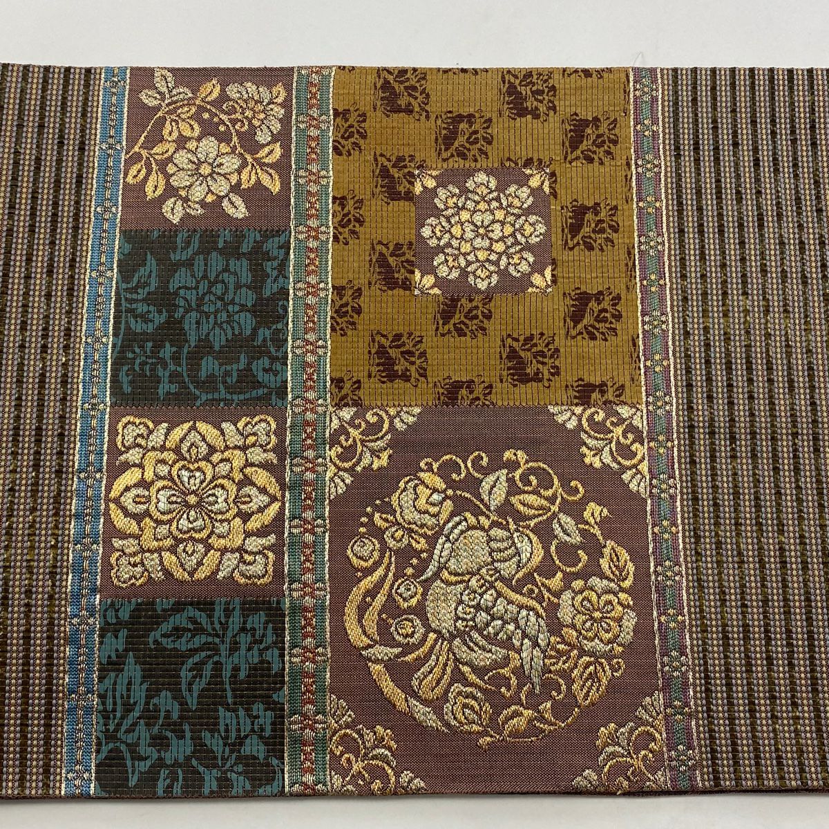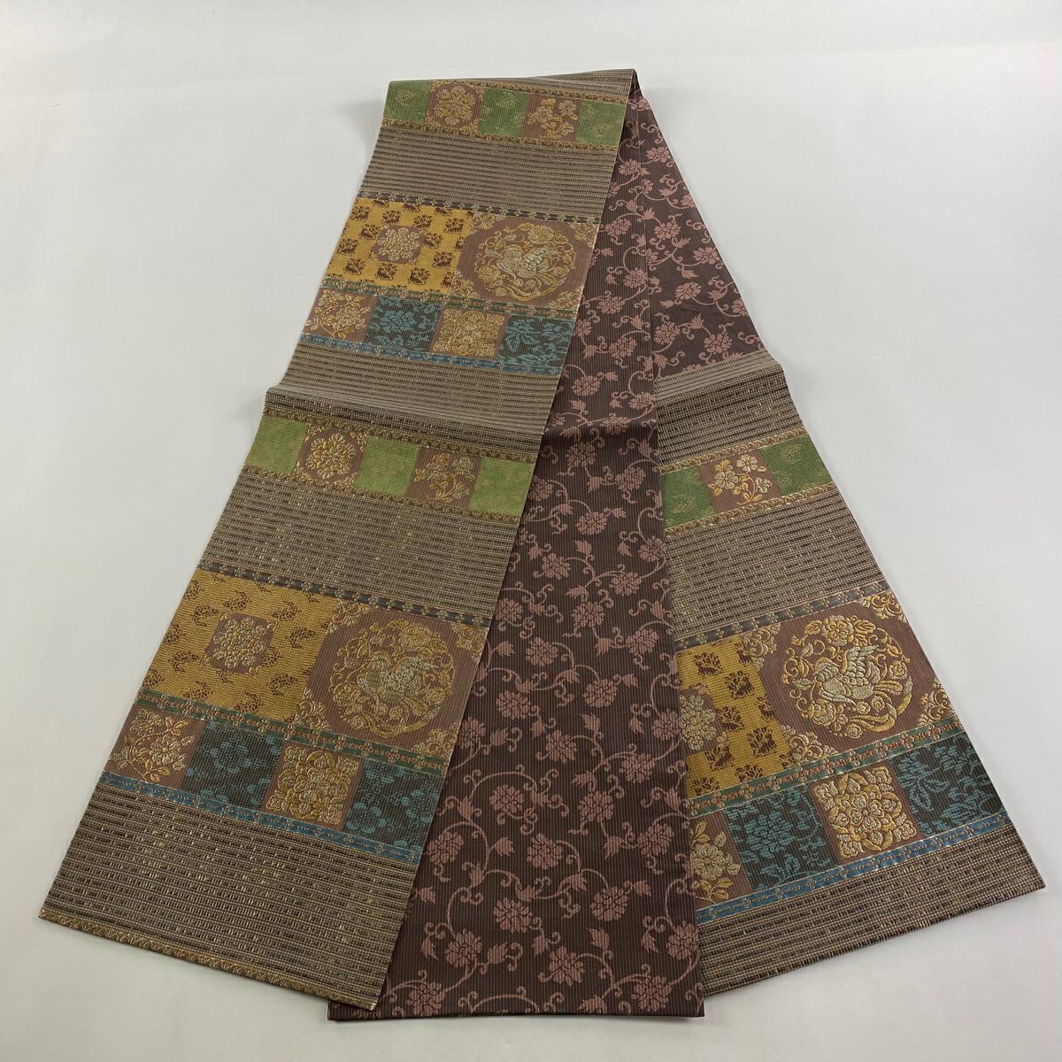 【在庫一掃】 袋帯 秀品 鳥 華文 金糸 箔 小豆色 六通 正絹