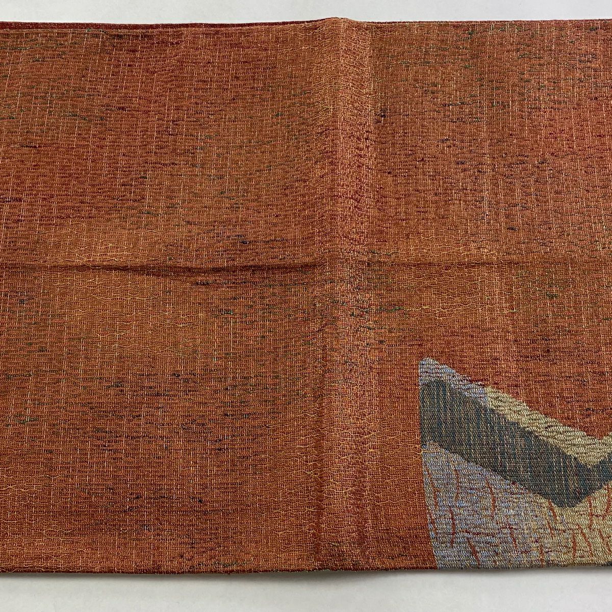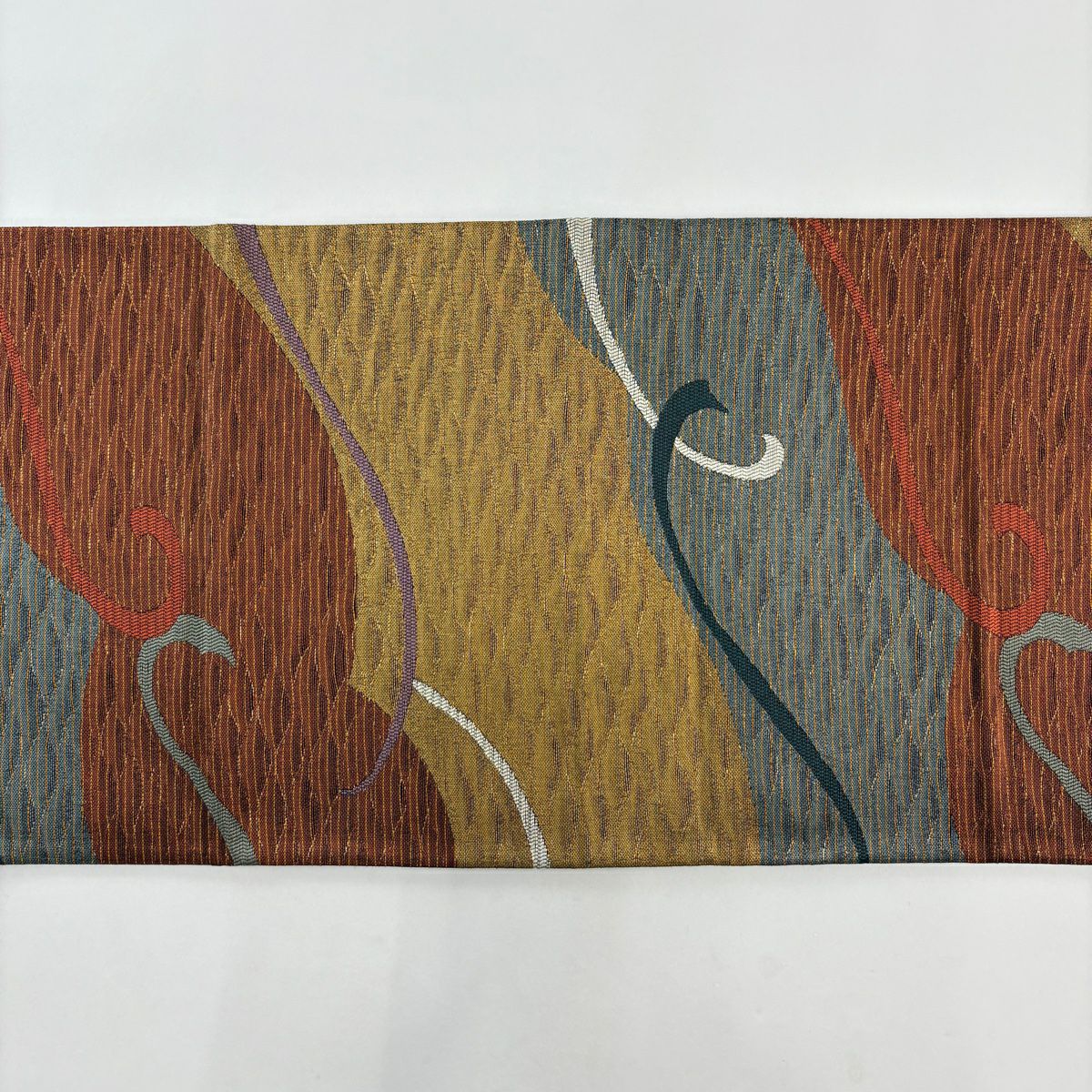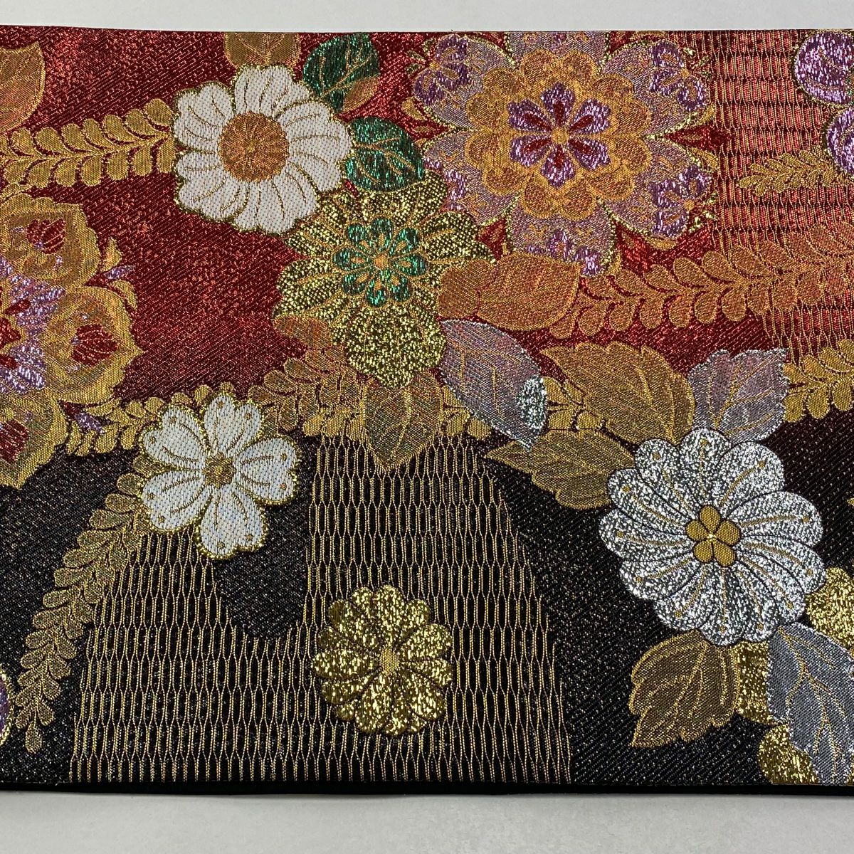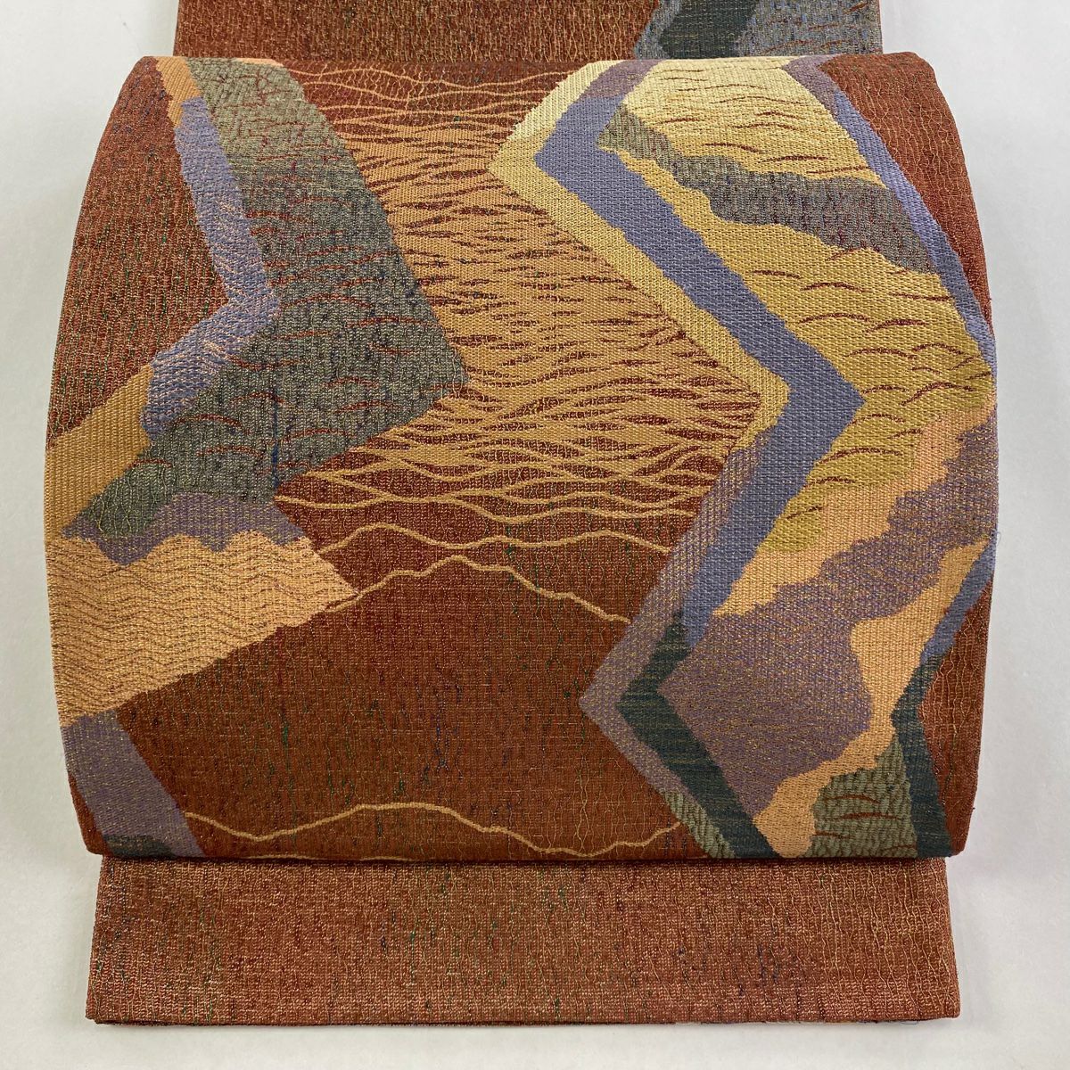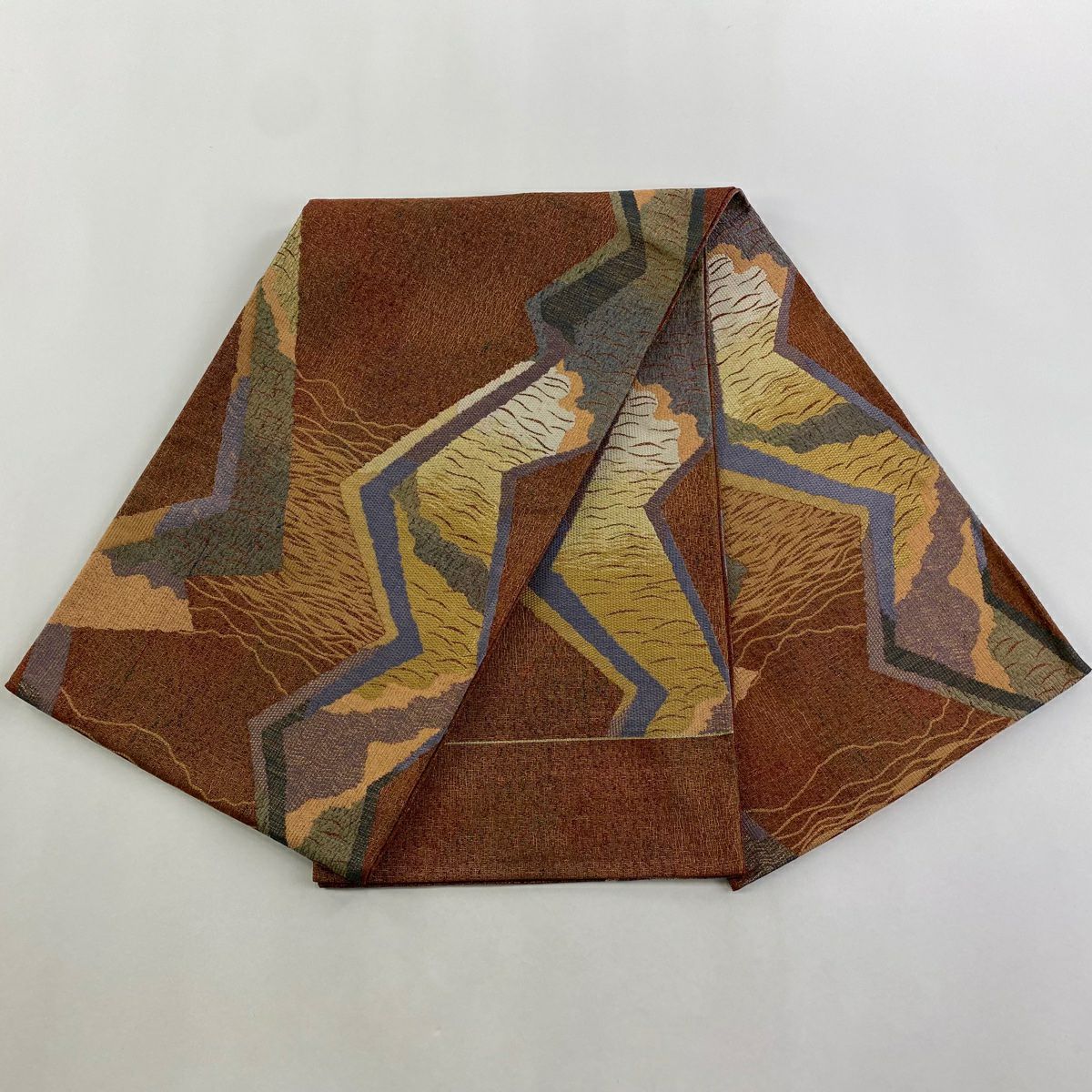 【在庫一掃】 袋帯 秀品 幾何学模様 金糸 箔 赤茶 六通 正絹
