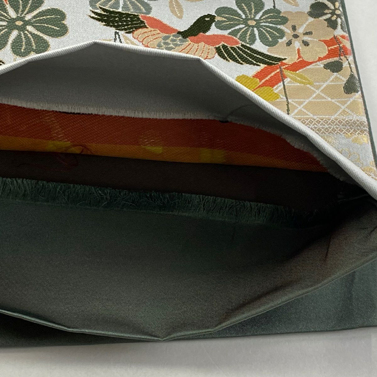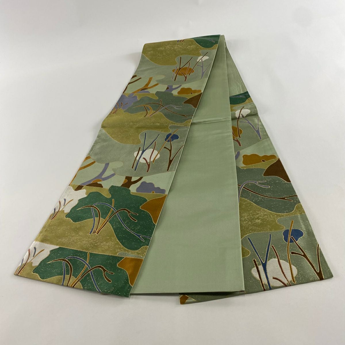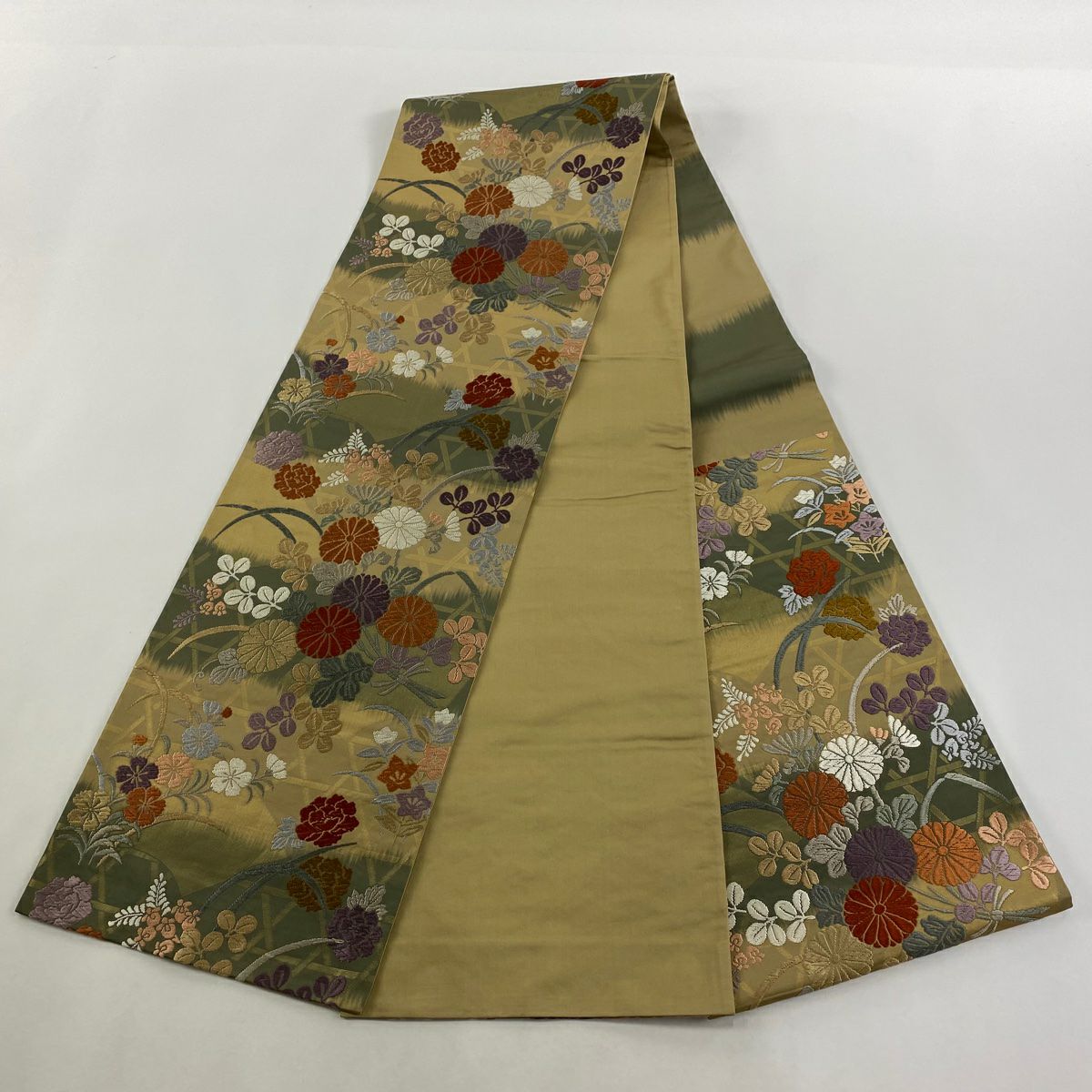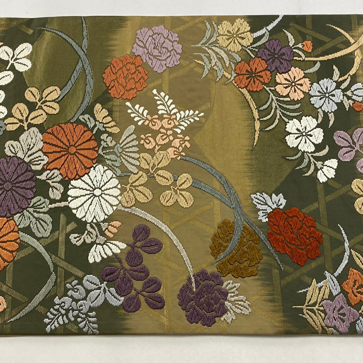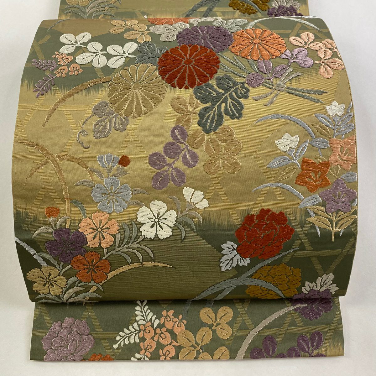 【在庫一掃】 袋帯 秀品 関西仕立て 秋草 箔 鶯色 六通 正絹