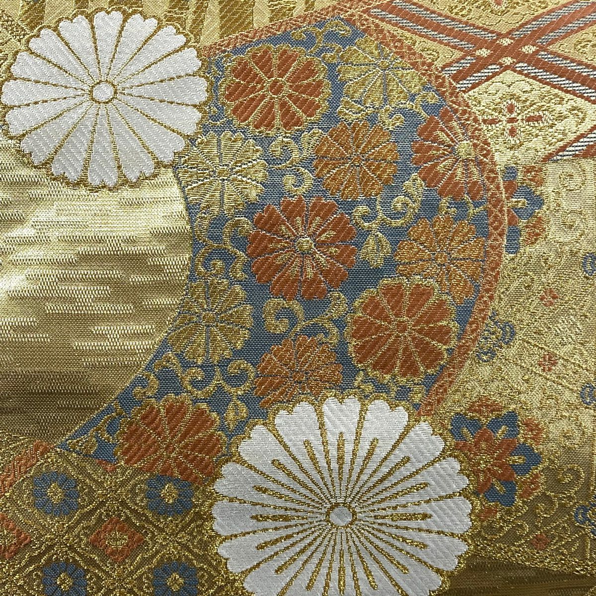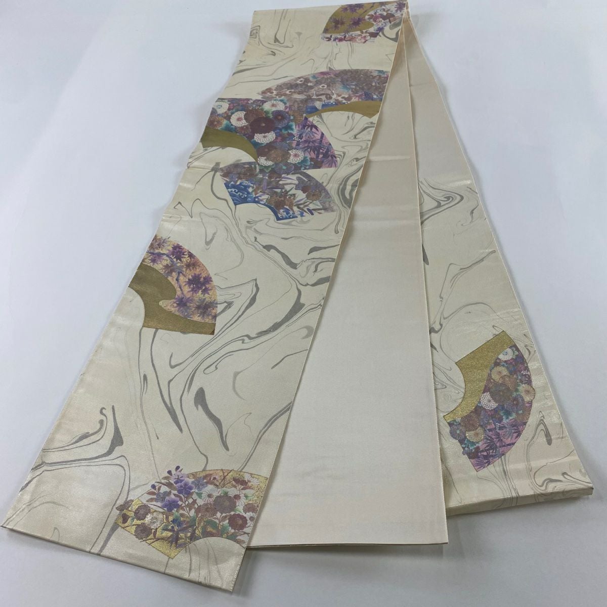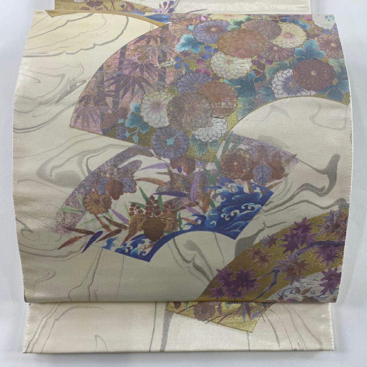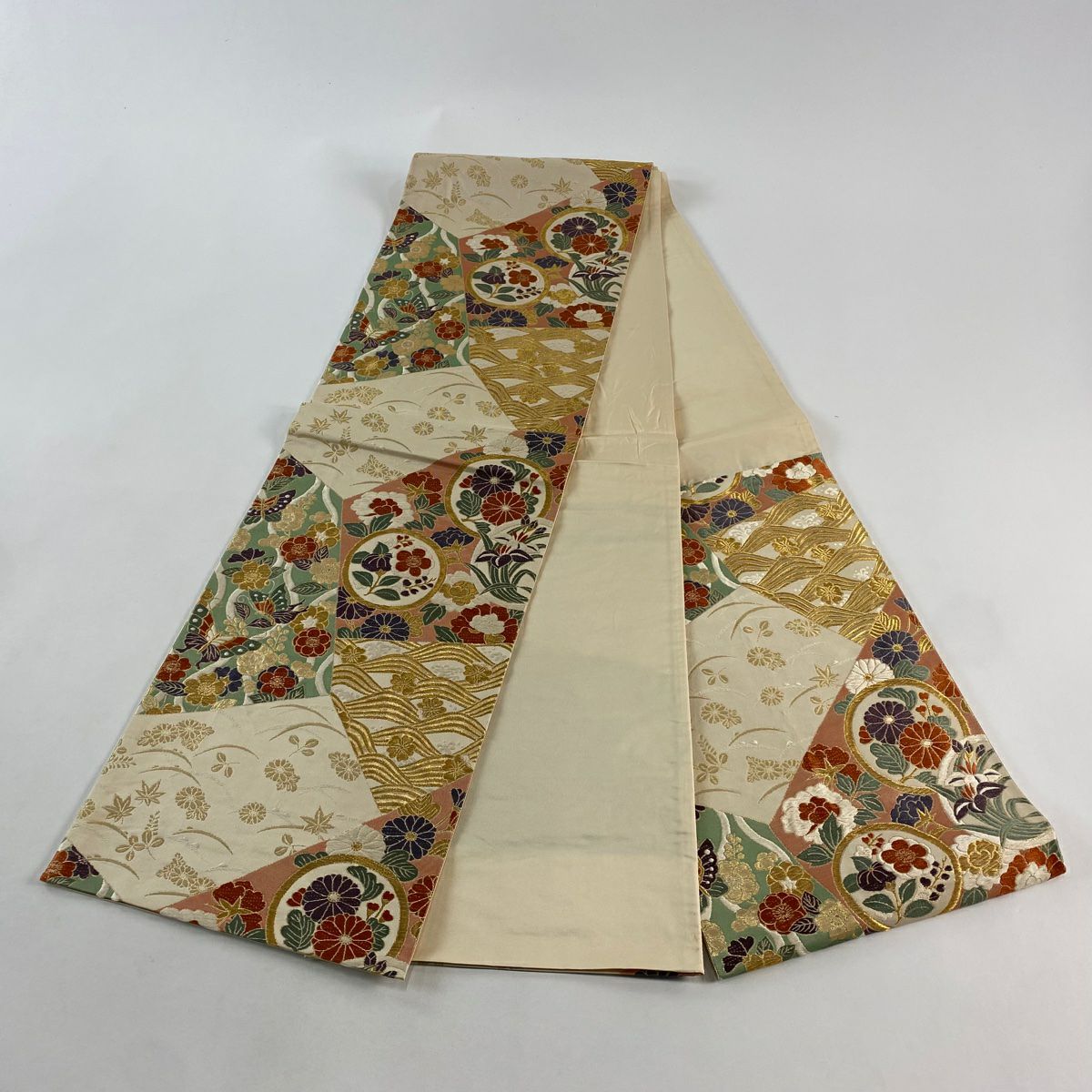【在庫一掃】 袋帯 秀品 扇面 菊 箔 クリーム お太鼓柄 正絹