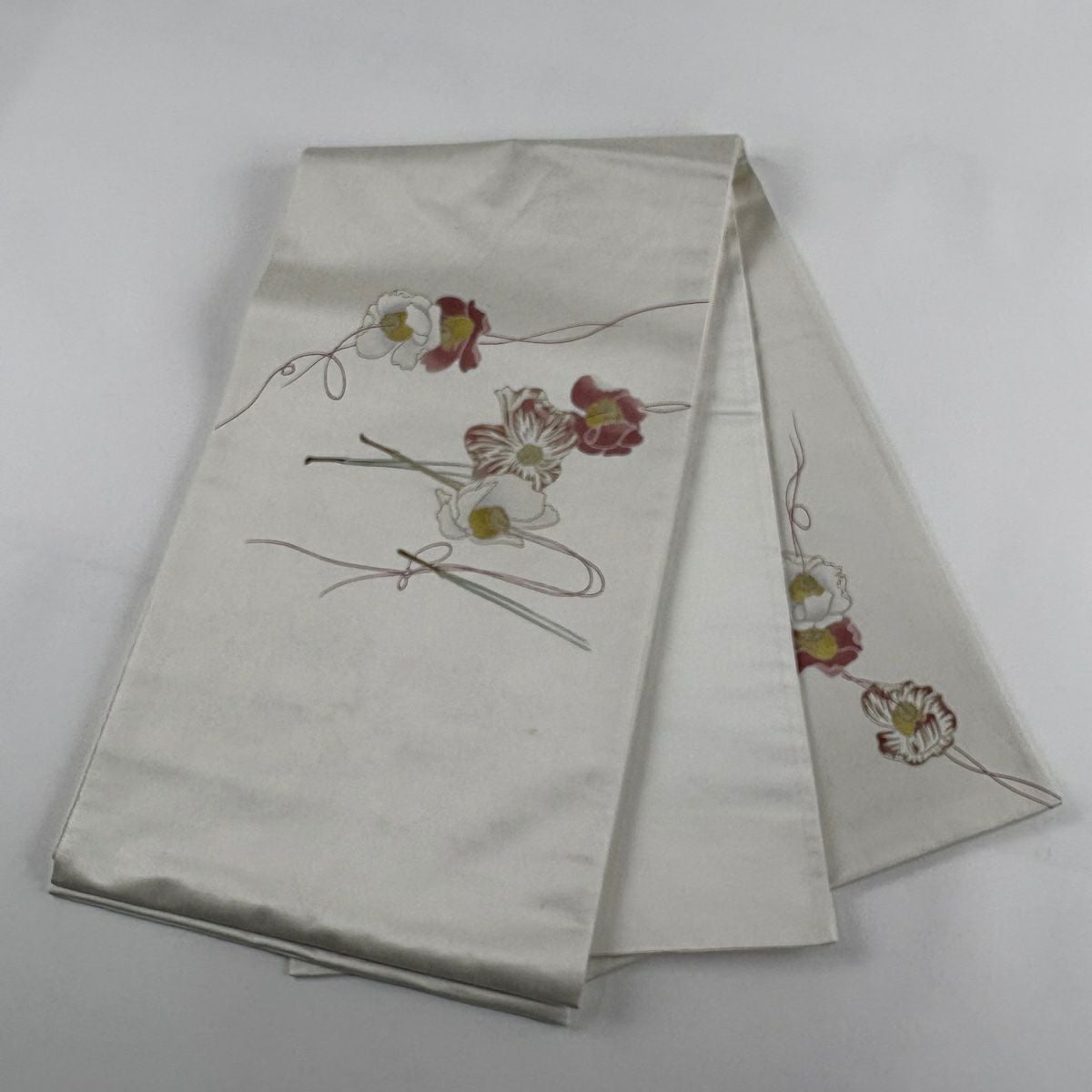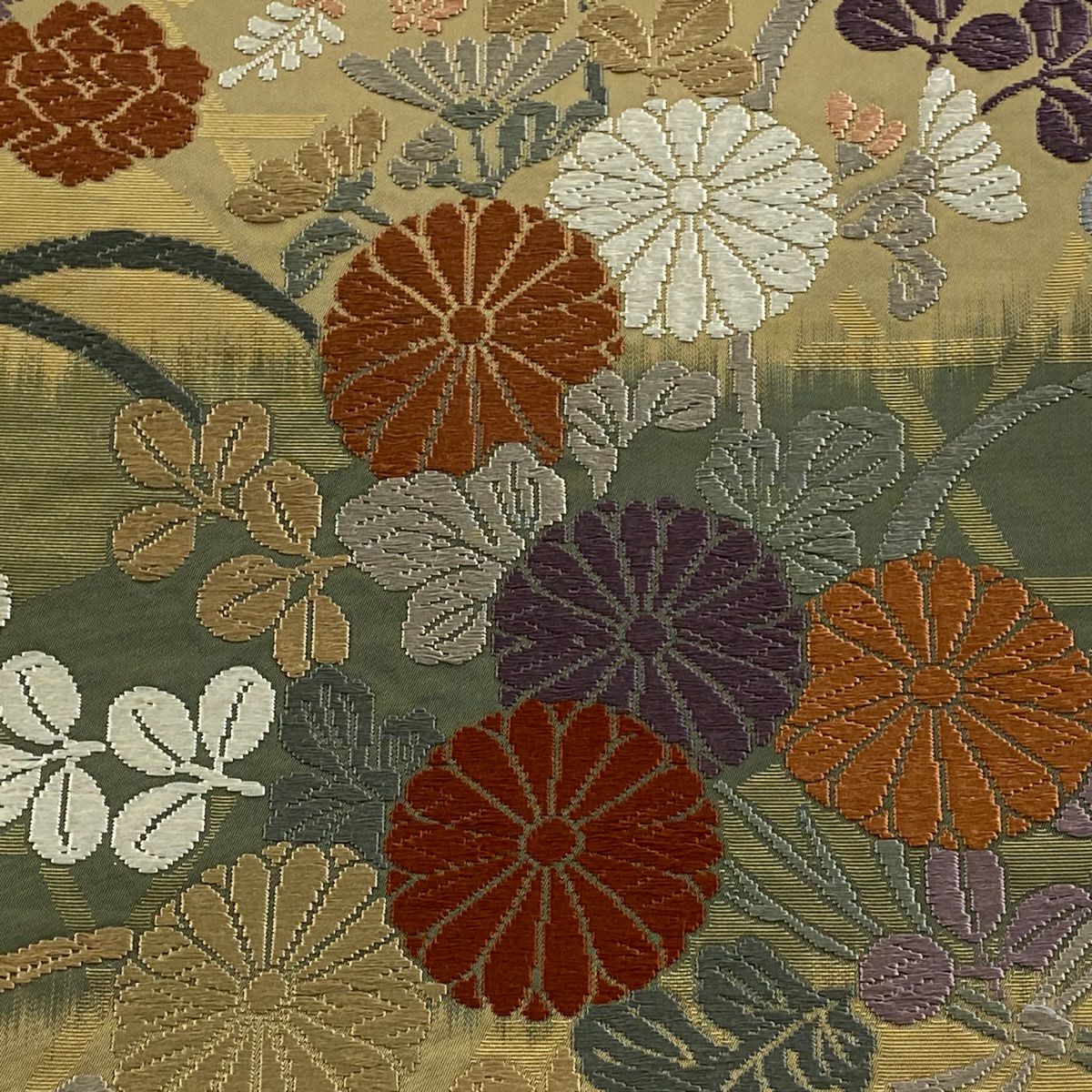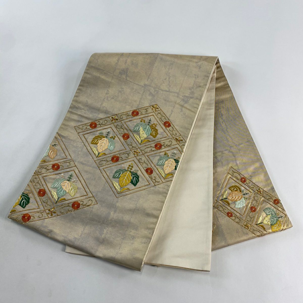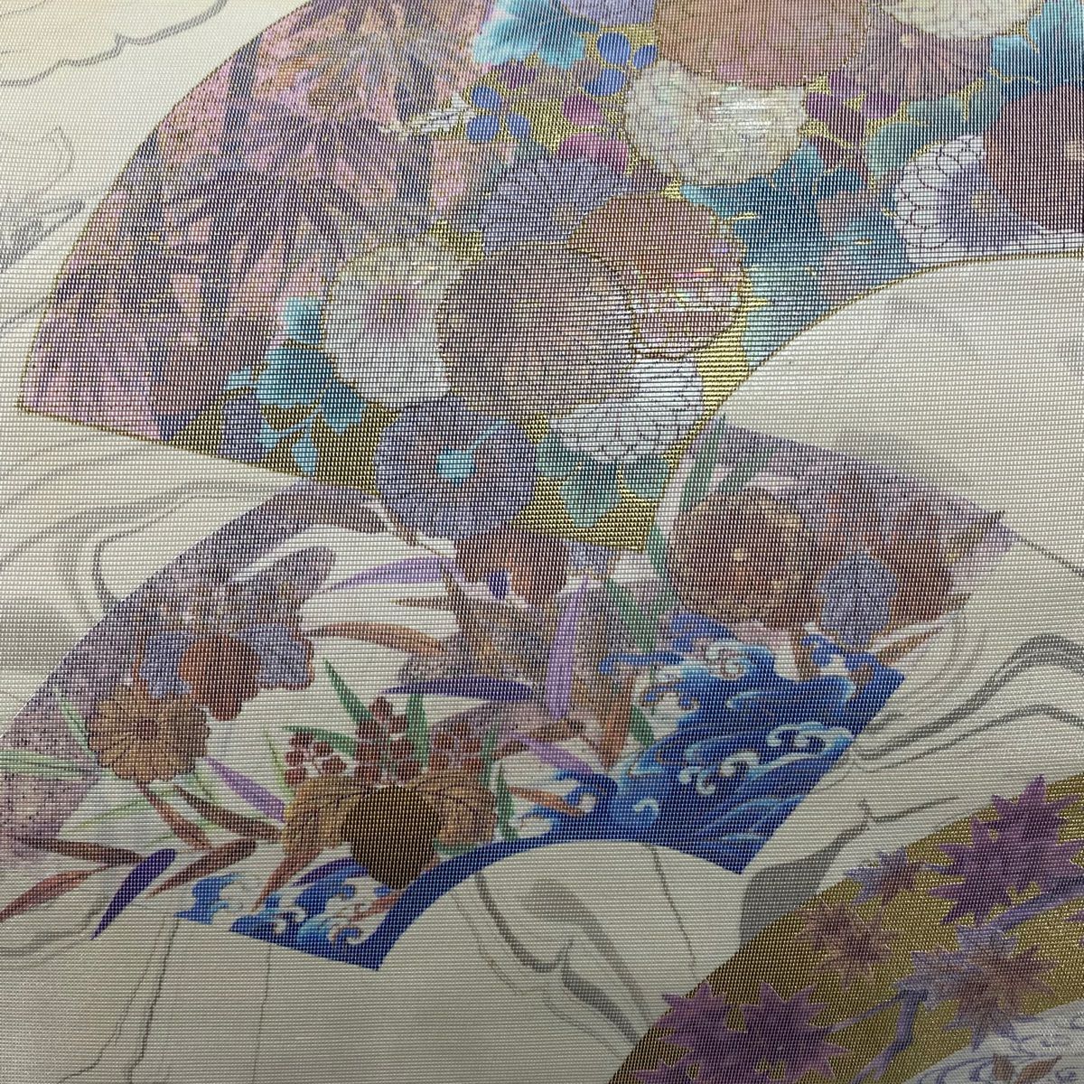 【在庫一掃】 袋帯 秀品 扇面 菊 箔 クリーム お太鼓柄 正絹