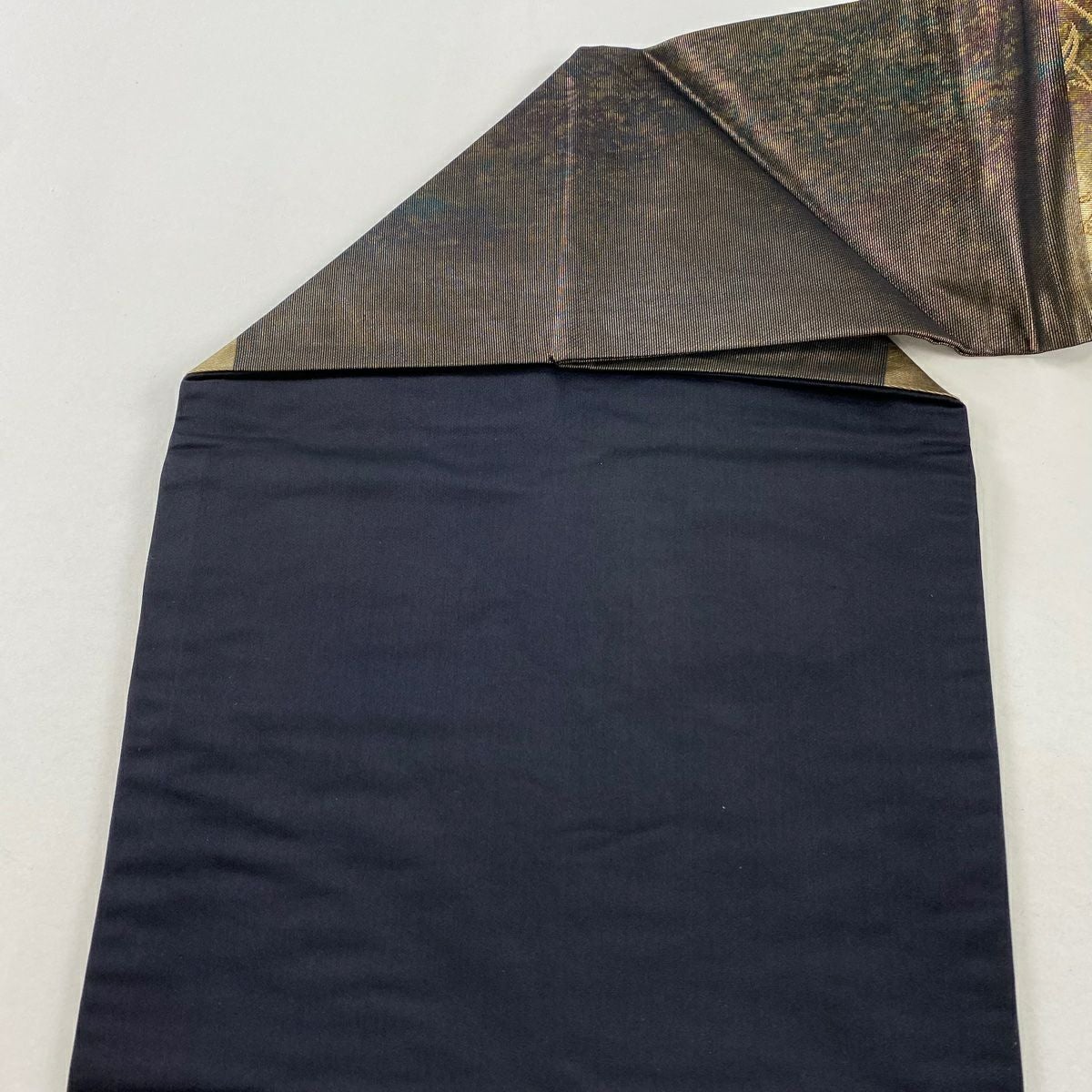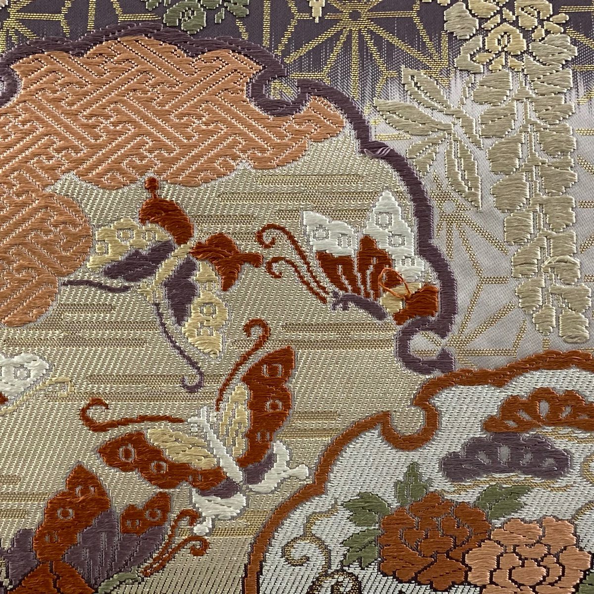【在庫一掃】 袋帯 秀品 笠松 蝶 唐織 箔 焦茶色 六通 正絹