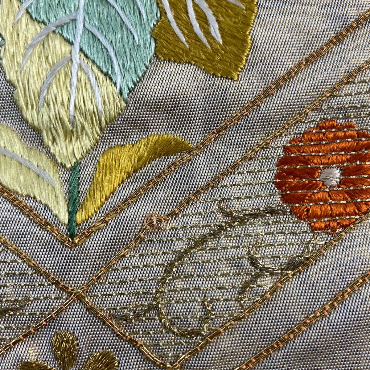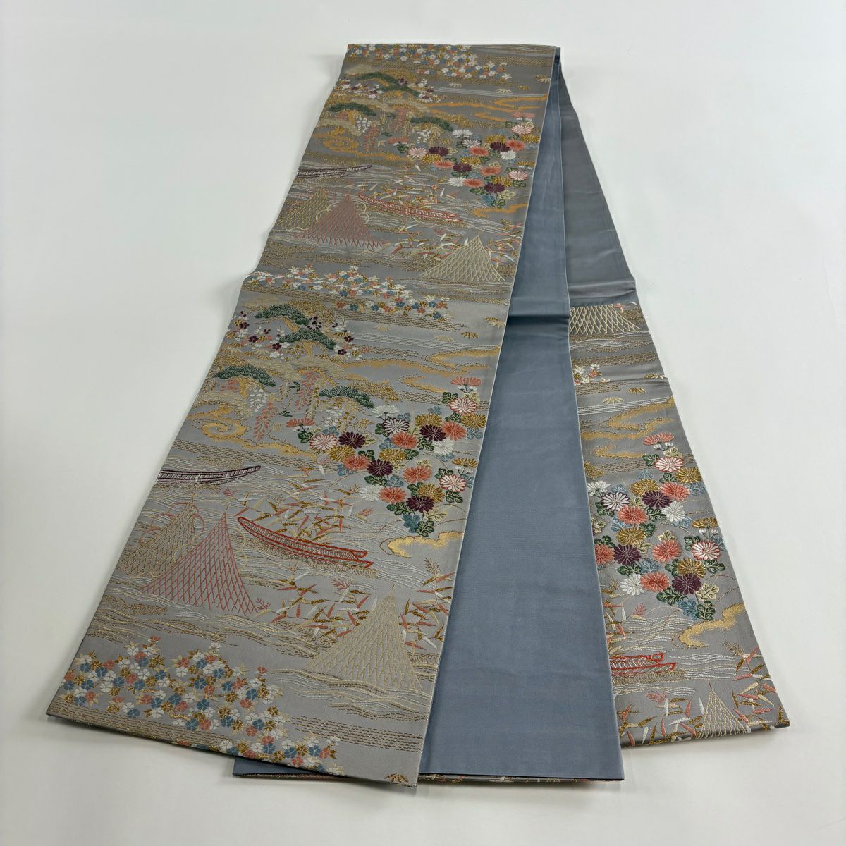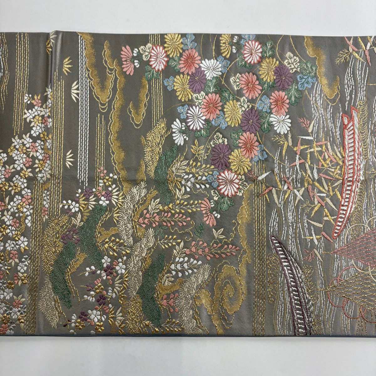 【在庫一掃】 袋帯 秀品 草花 舟 刺繍 金糸 灰色 六通 正絹