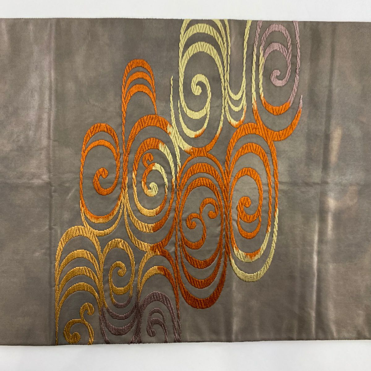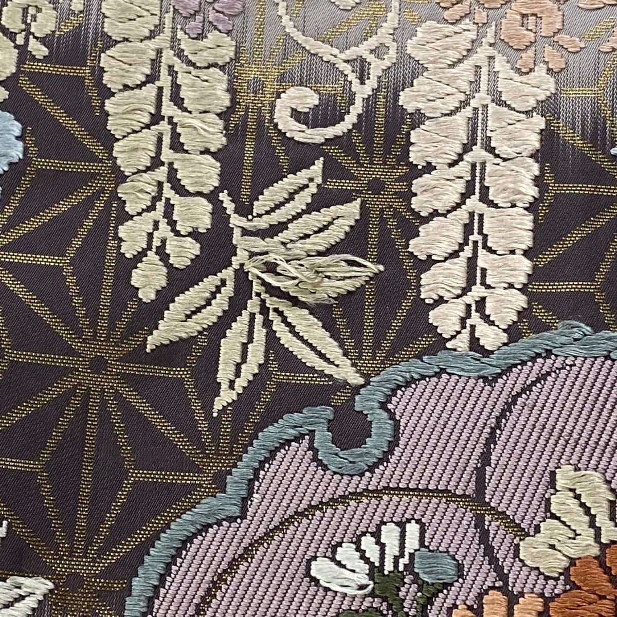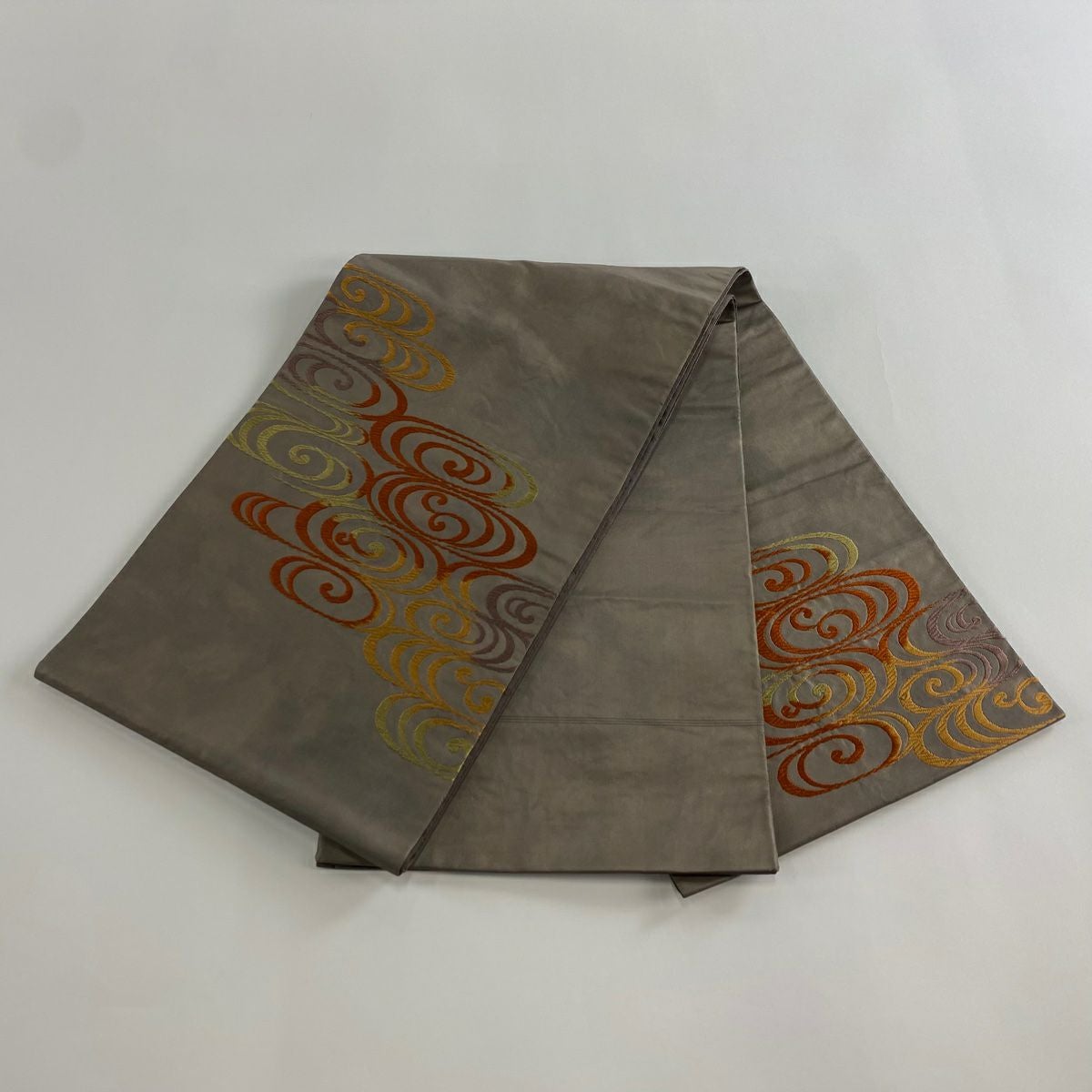【在庫一掃】 袋帯 秀品 草花 舟 刺繍 金糸 灰色 六通 正絹