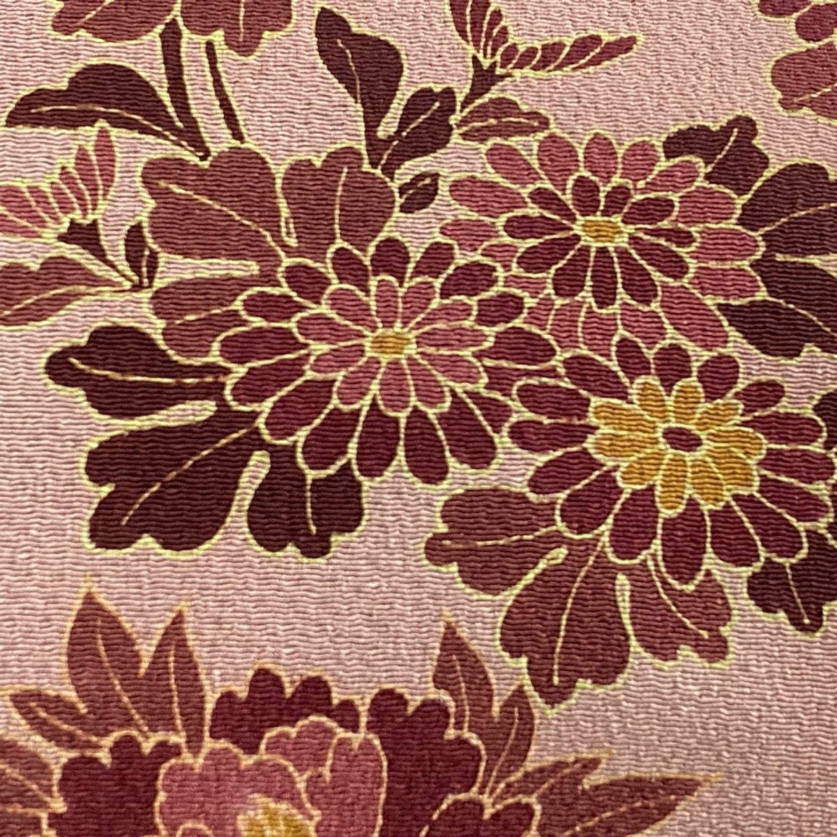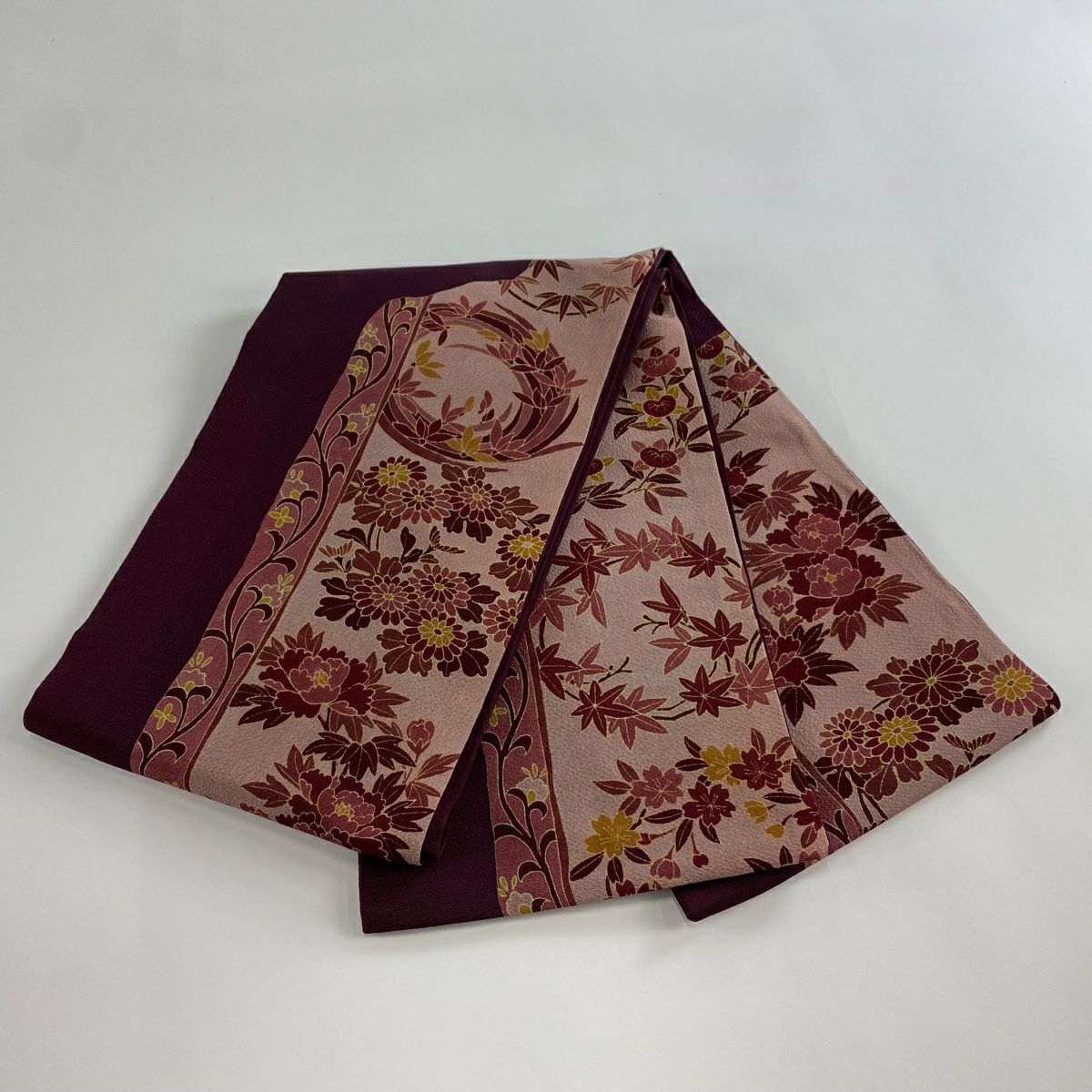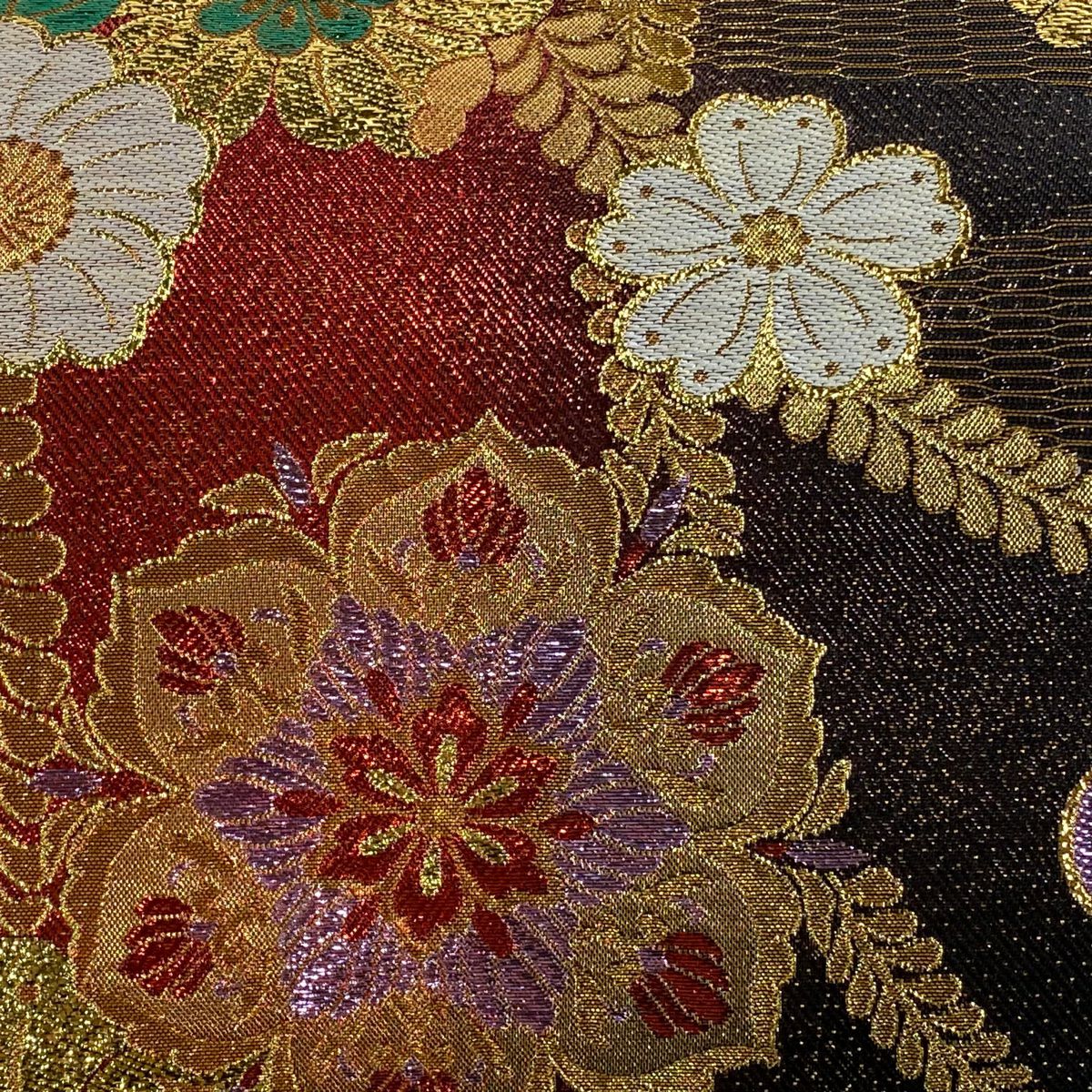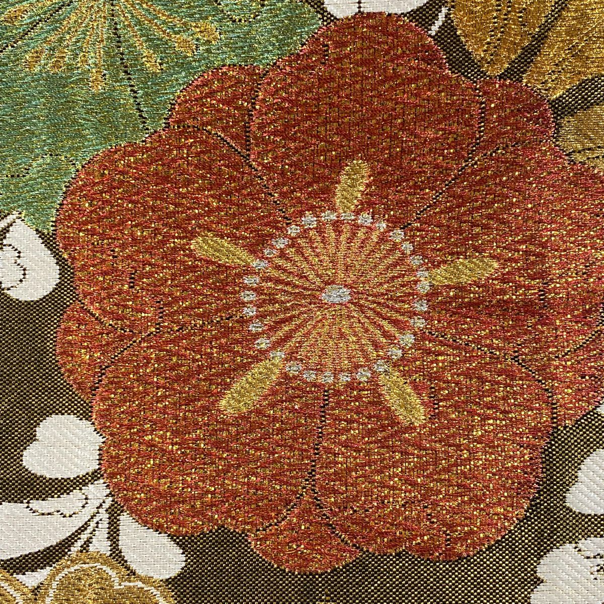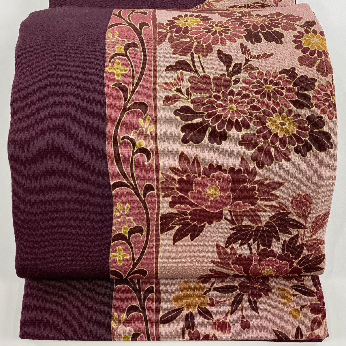 【在庫一掃】 袋帯 秀品 菊 牡丹 縮緬 薄小豆 お太鼓柄 正絹