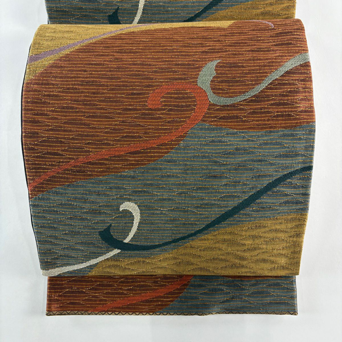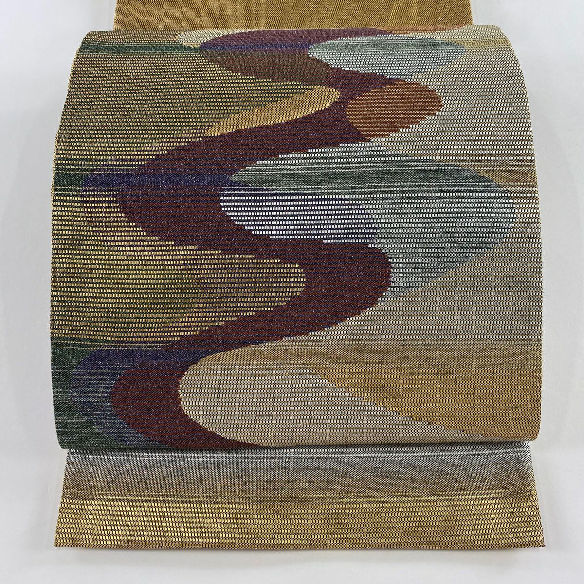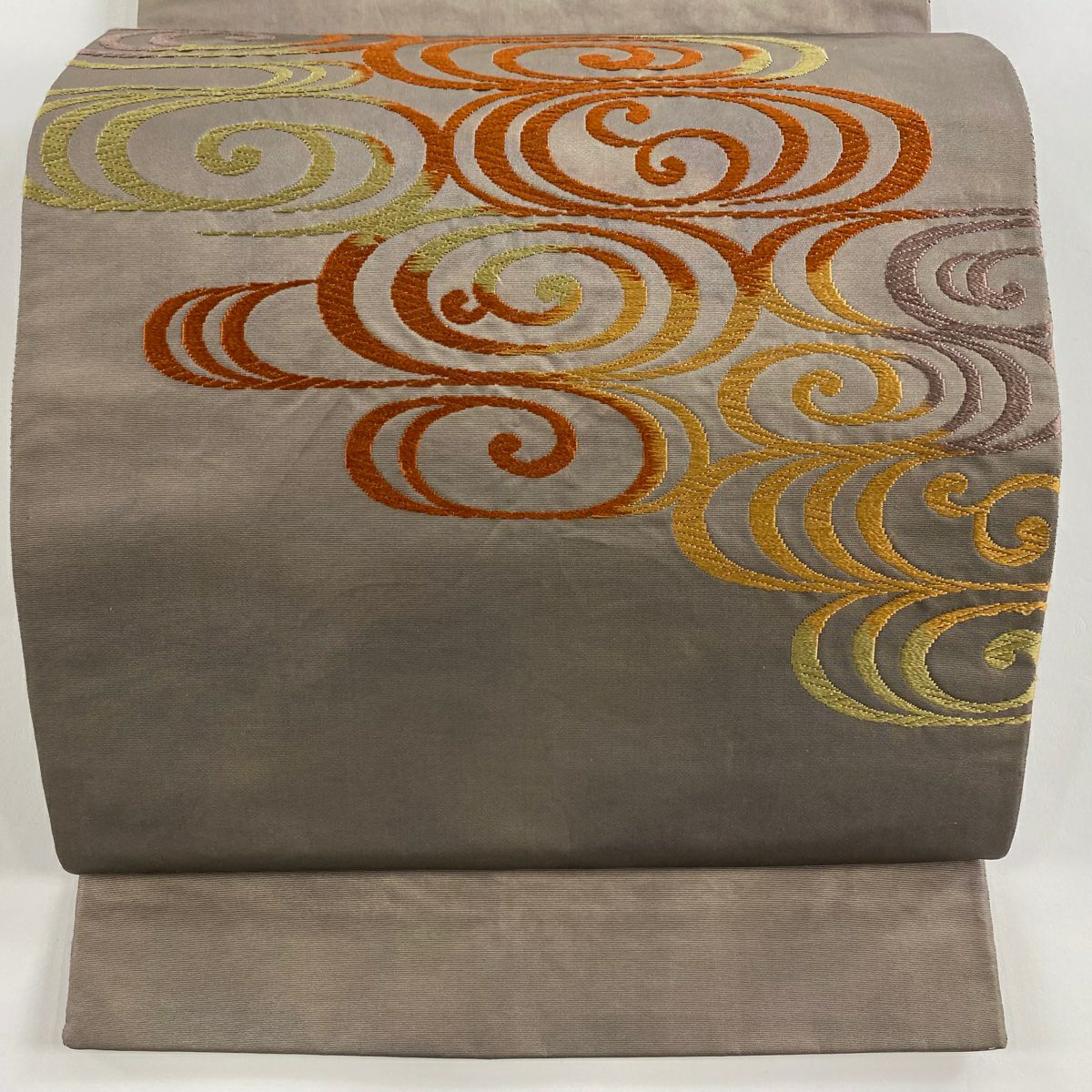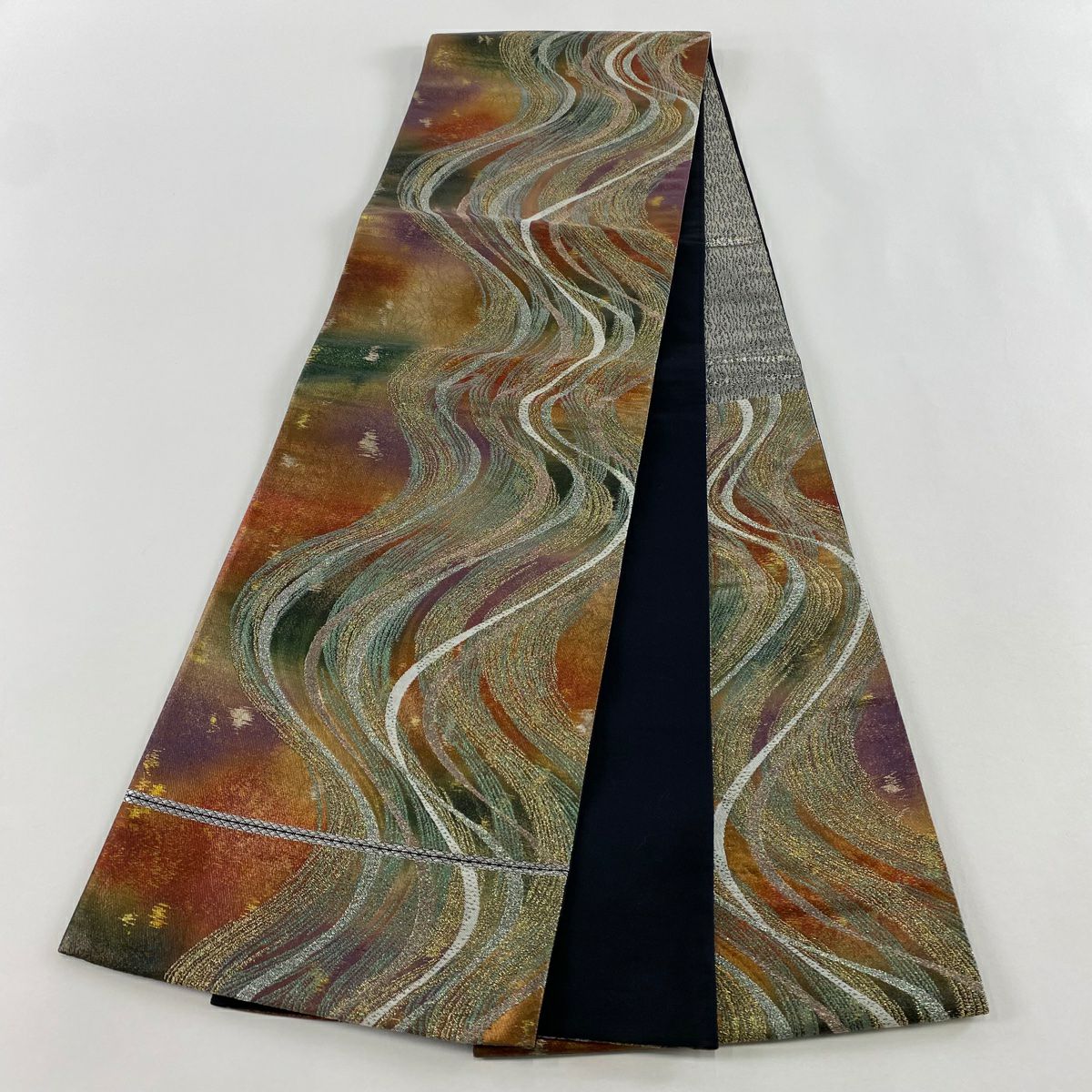 【在庫一掃】 袋帯 秀品 観世水 唐織 箔 灰茶 お太鼓柄 正絹