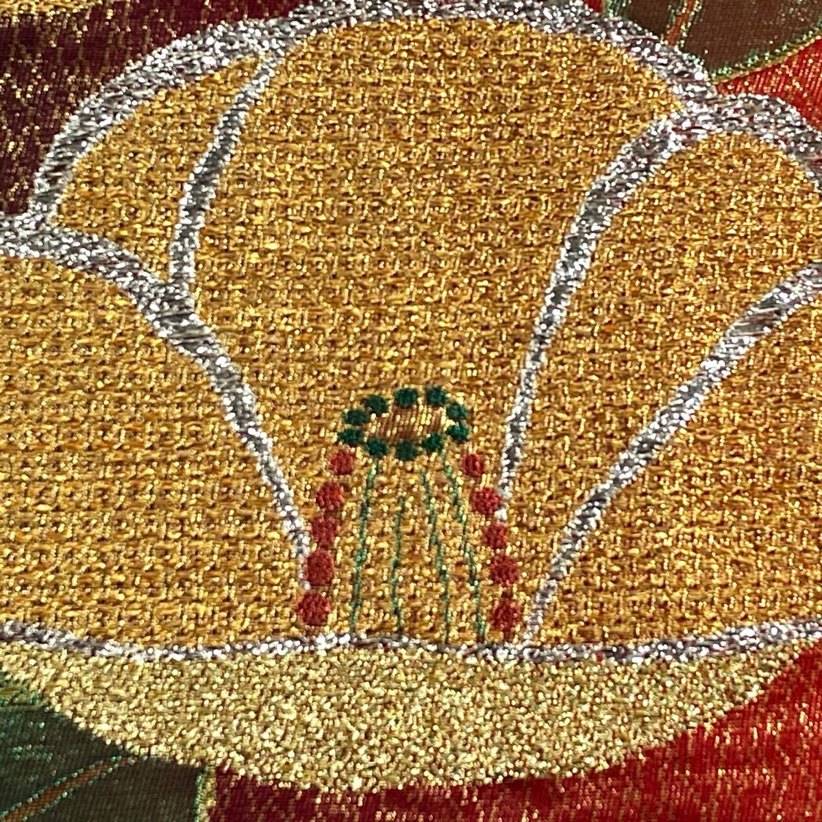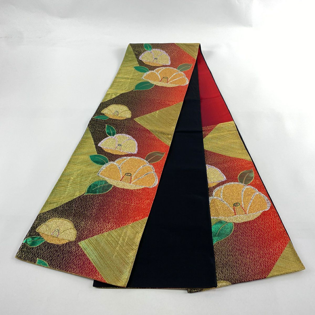 【在庫一掃】 袋帯 秀品 振袖向き 椿 箔 金糸 赤 六通 正絹