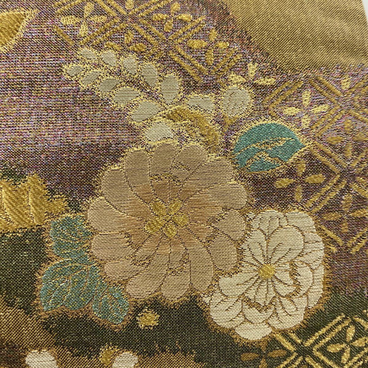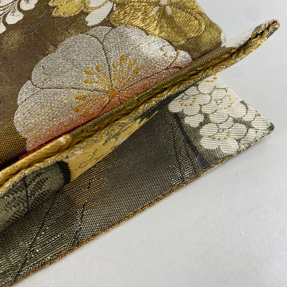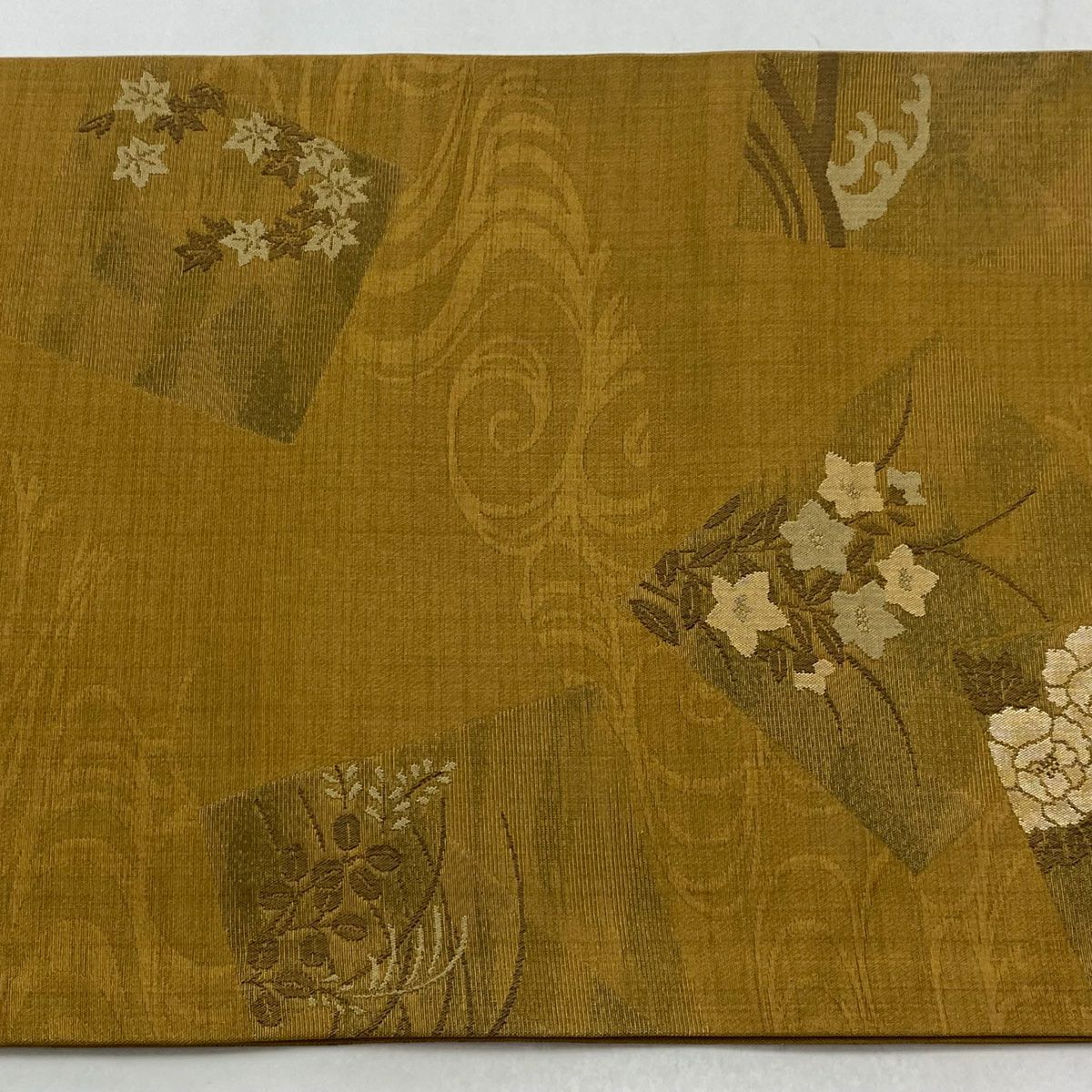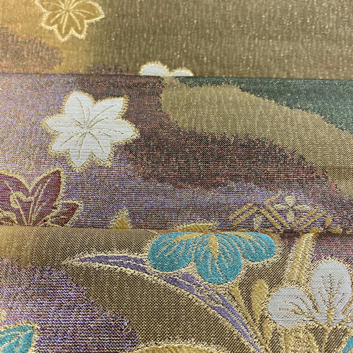 【在庫一掃】 袋帯 秀品 秋草 籠目 唐織 箔 金色 六通 正絹