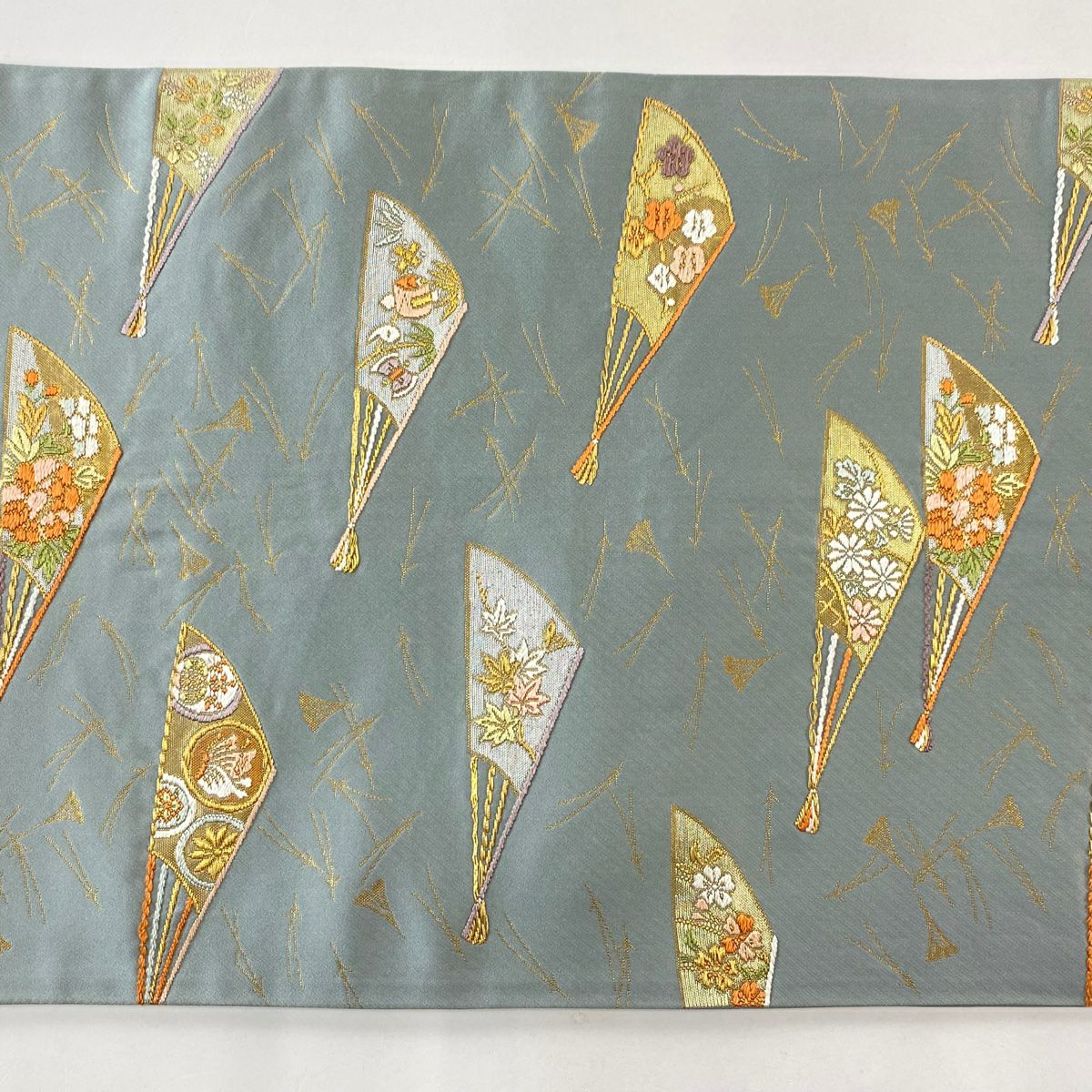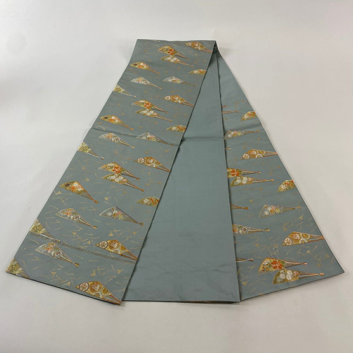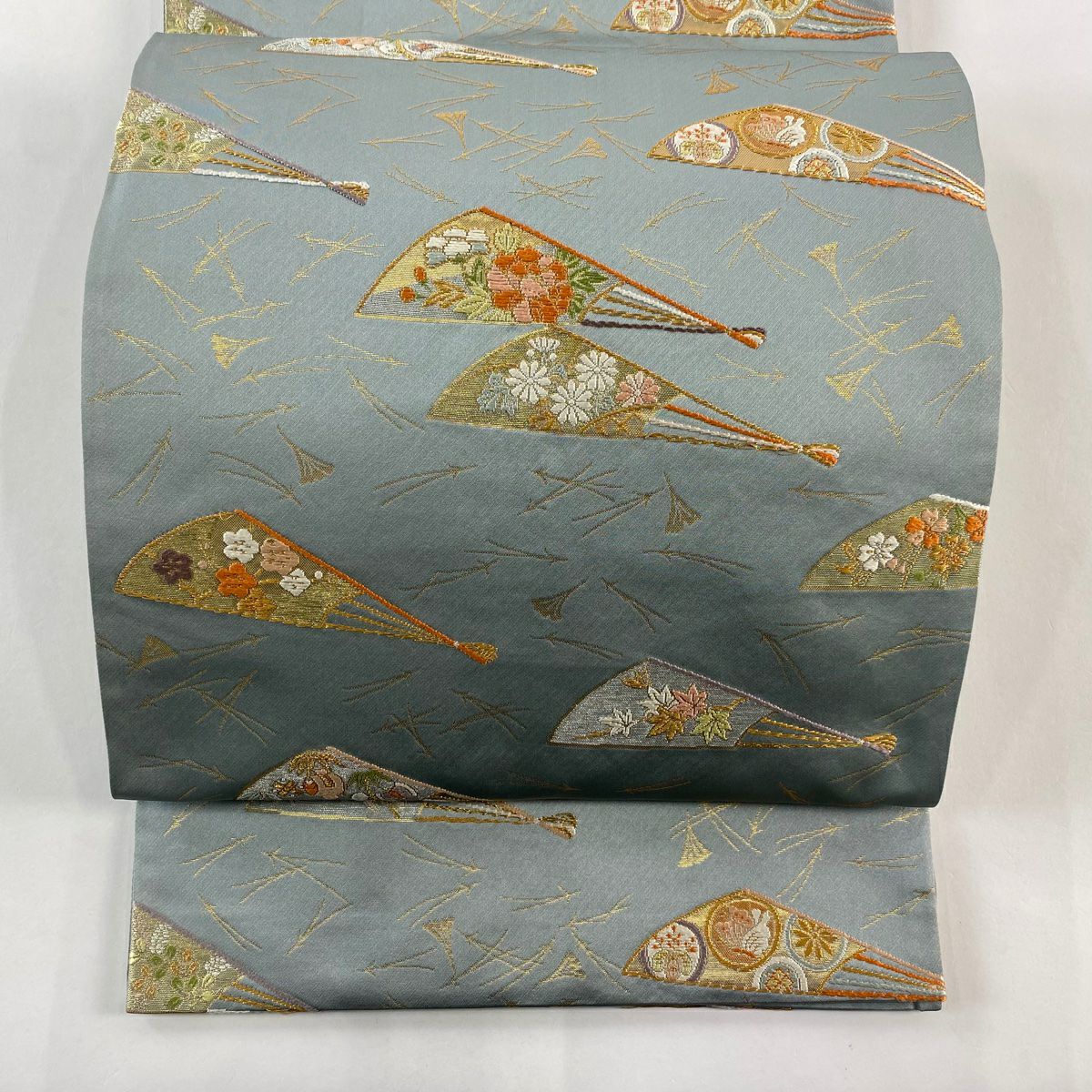 【在庫一掃】 袋帯 秀品 扇 松葉 金銀糸 箔 灰緑 六通 正絹