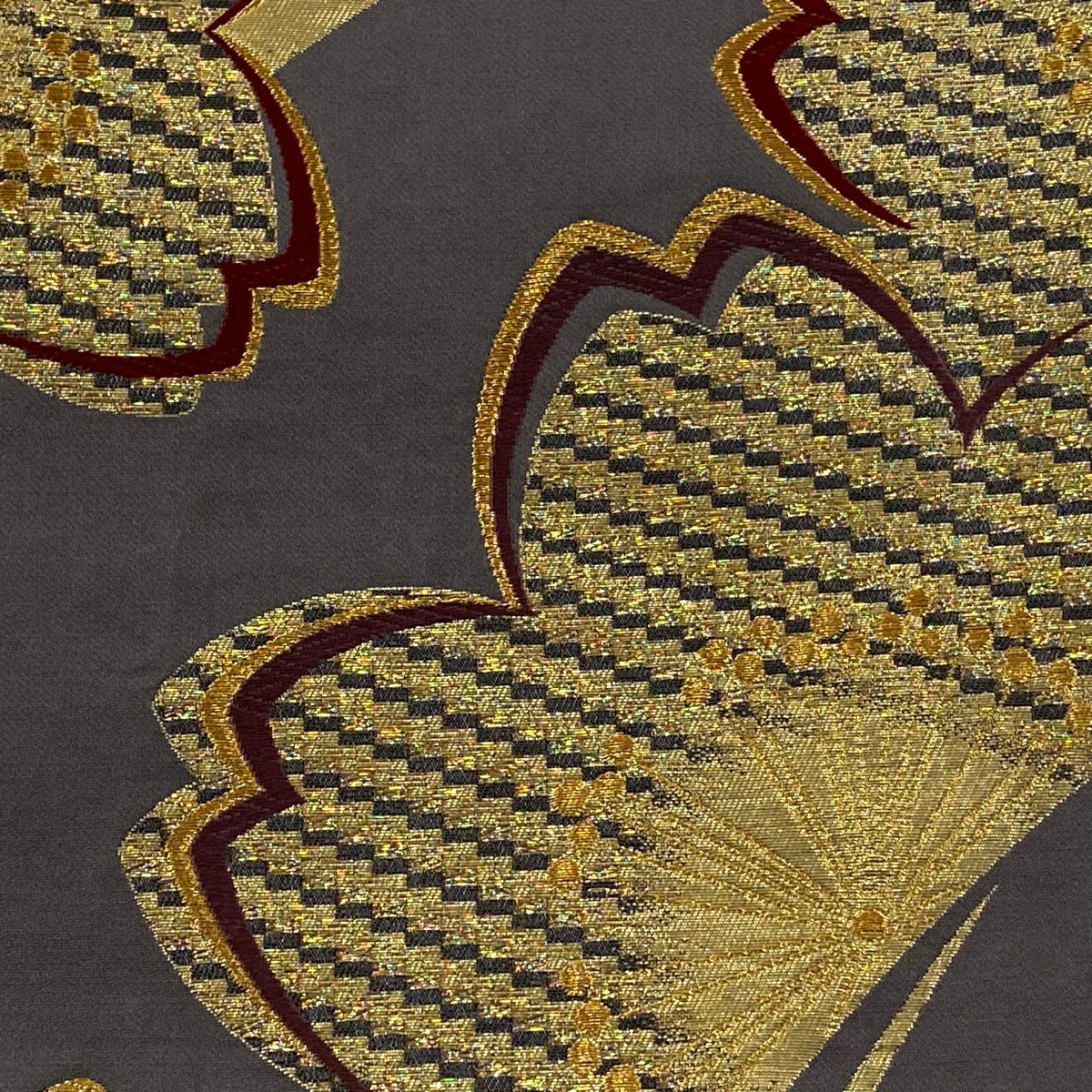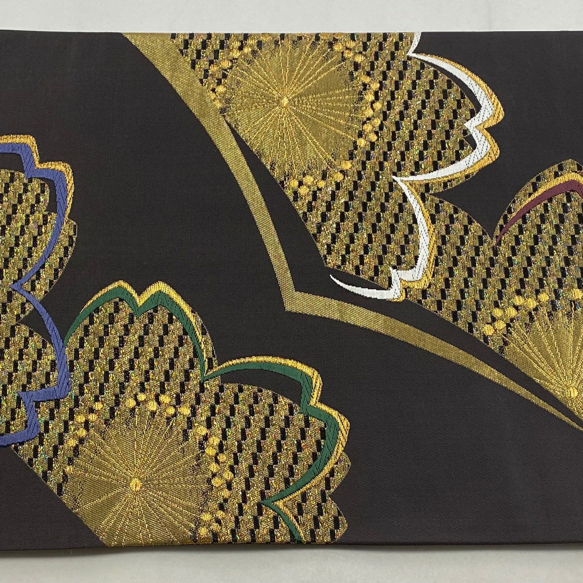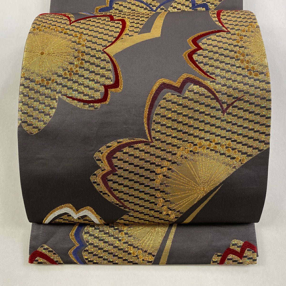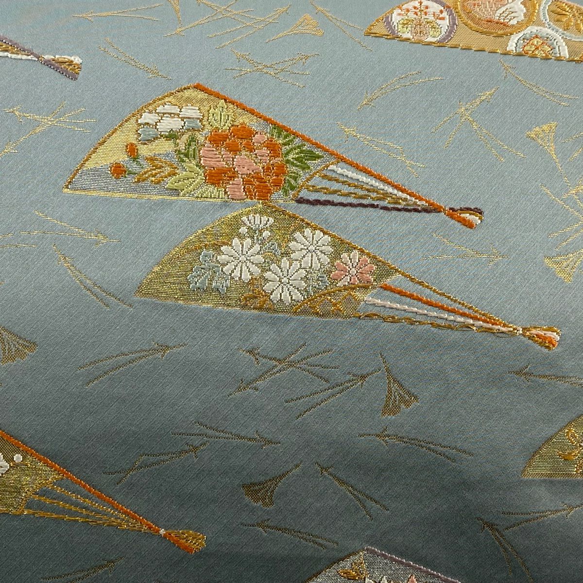 【在庫一掃】 袋帯 秀品 扇 松葉 金銀糸 箔 灰緑 六通 正絹