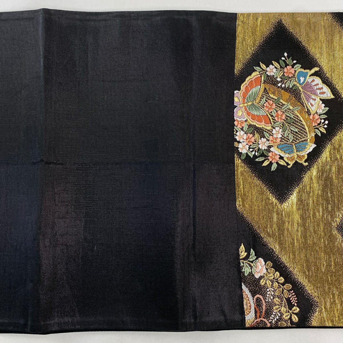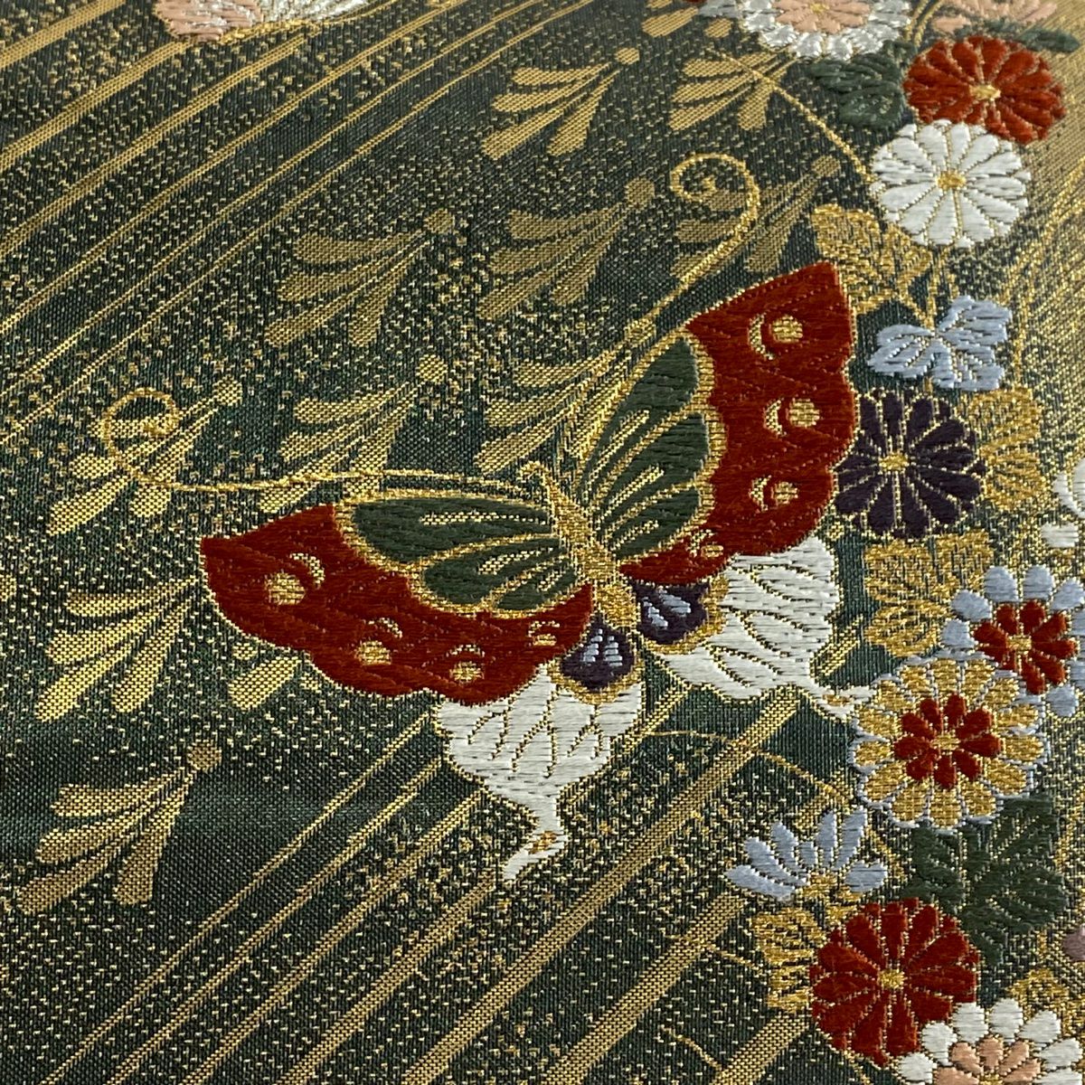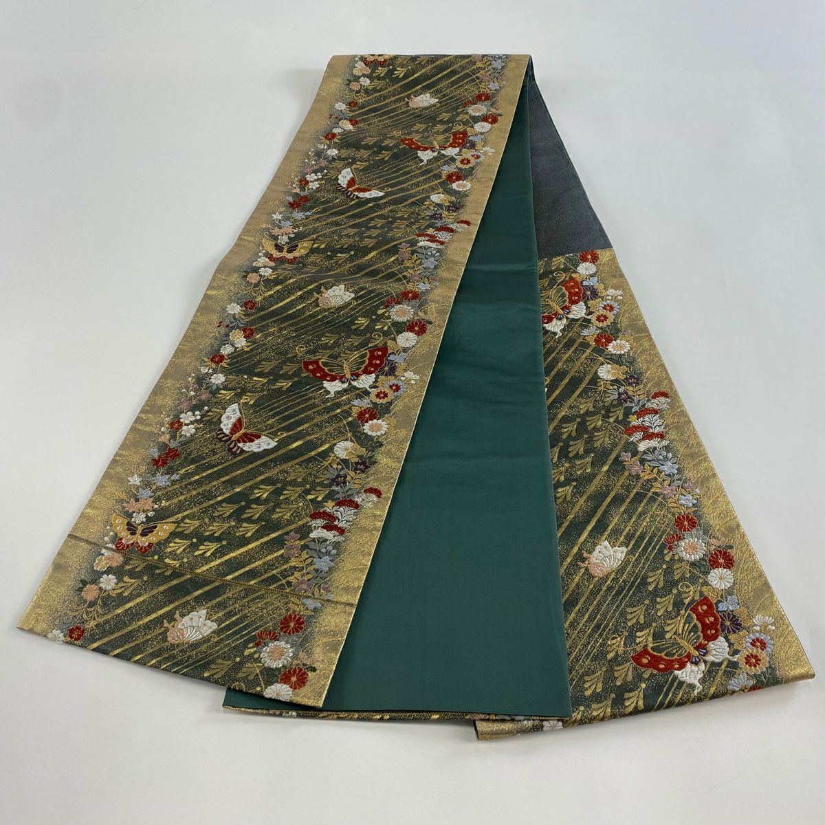 【在庫一掃】 袋帯 秀品 蝶 草花 金銀糸 箔 深緑 六通 正絹