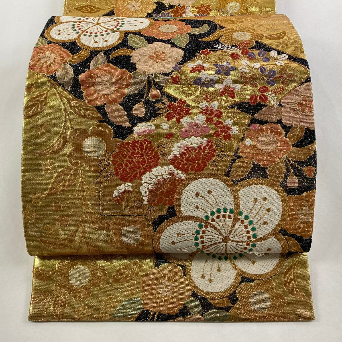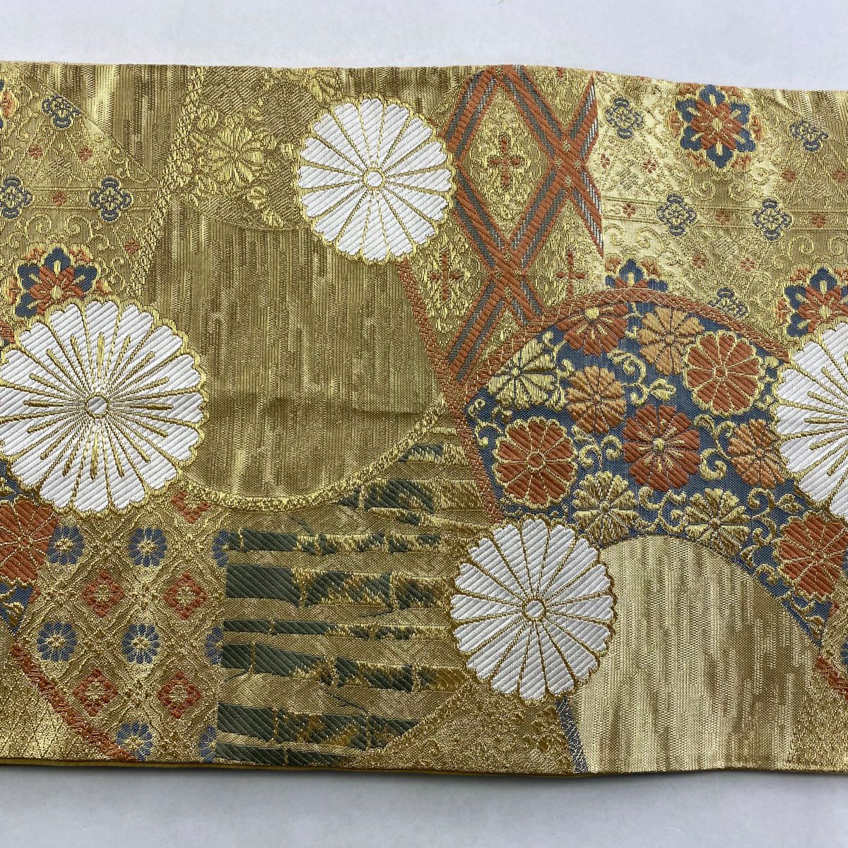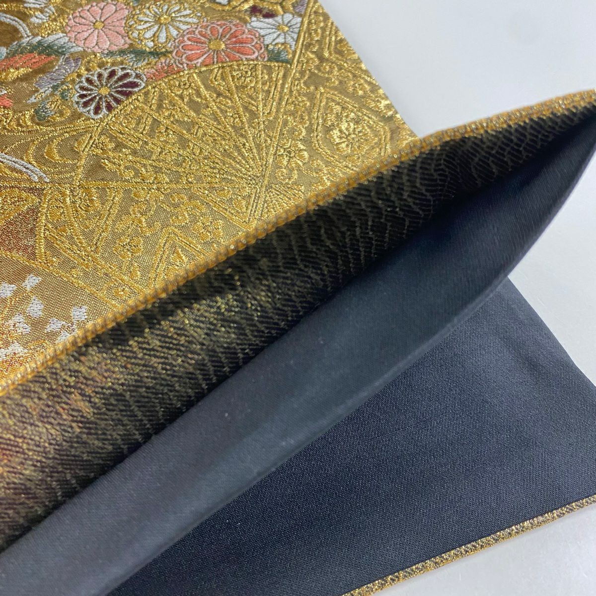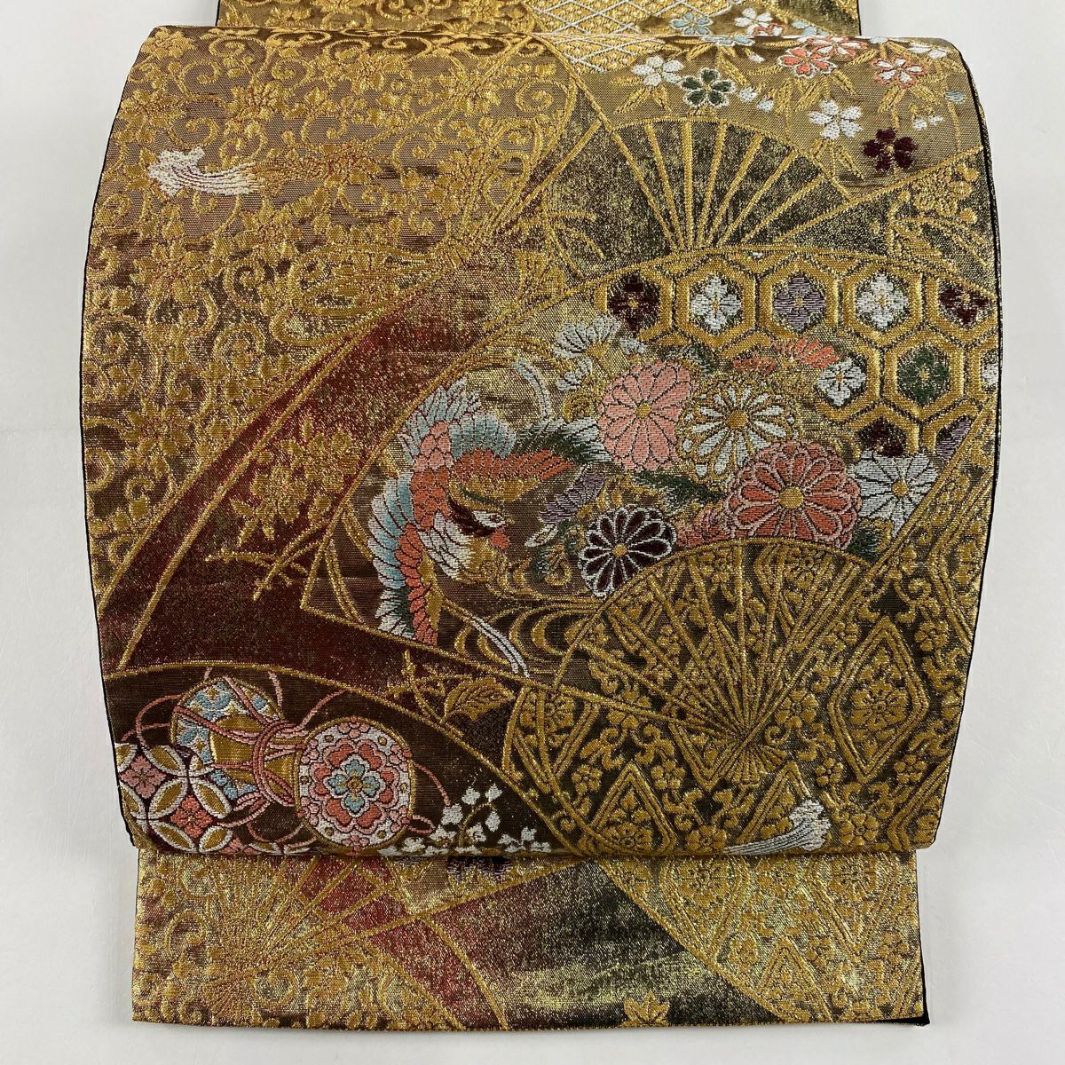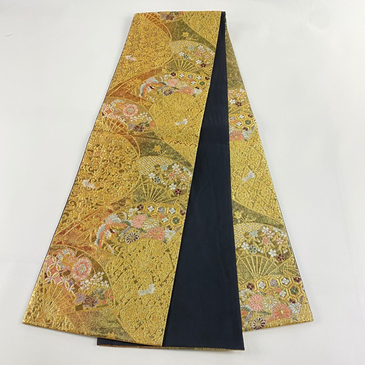 【在庫一掃】 【美品】 袋帯 秀品 扇 花鳥 箔 金色 六通 正絹