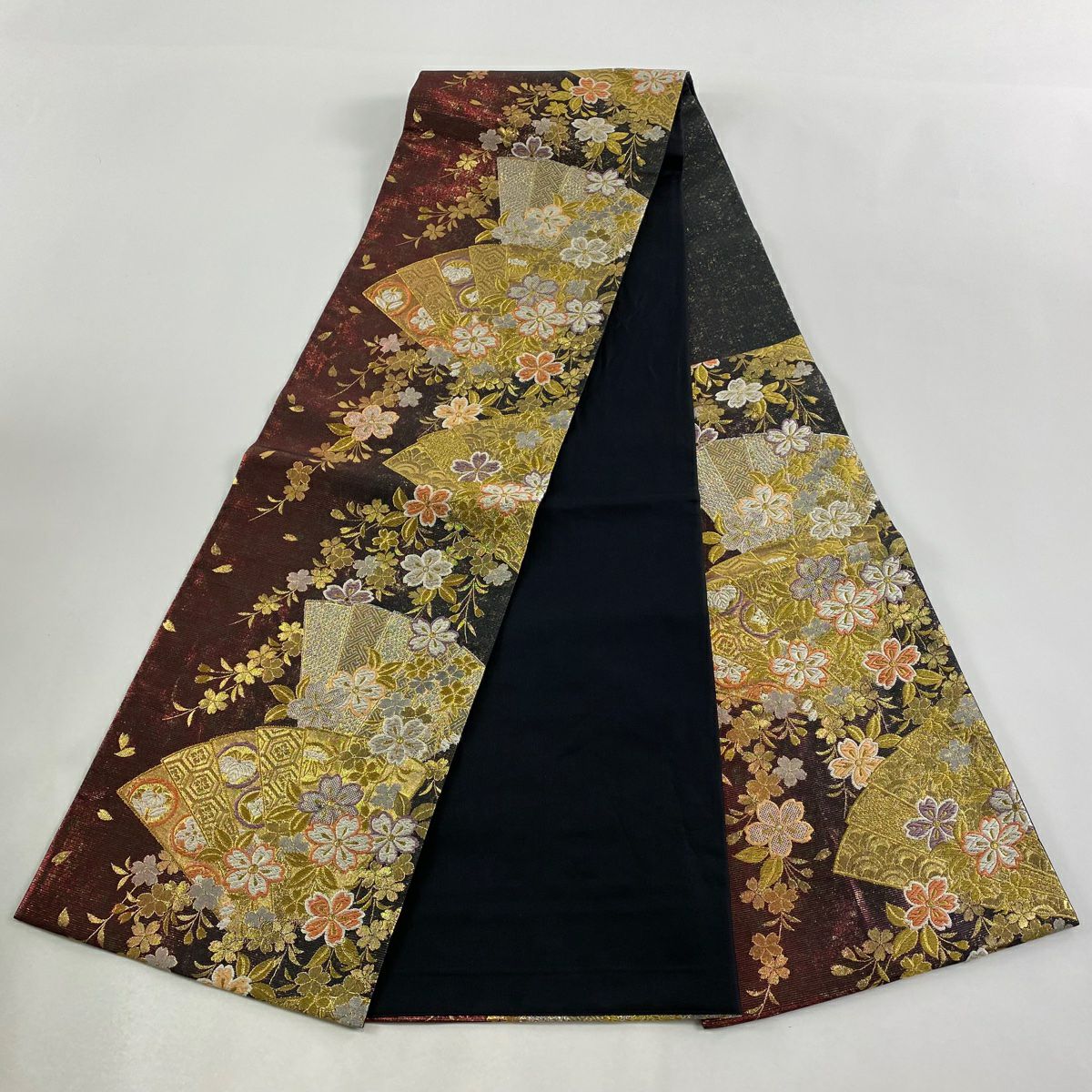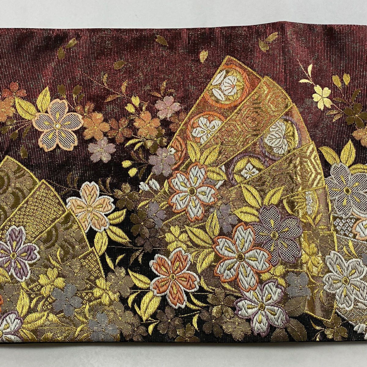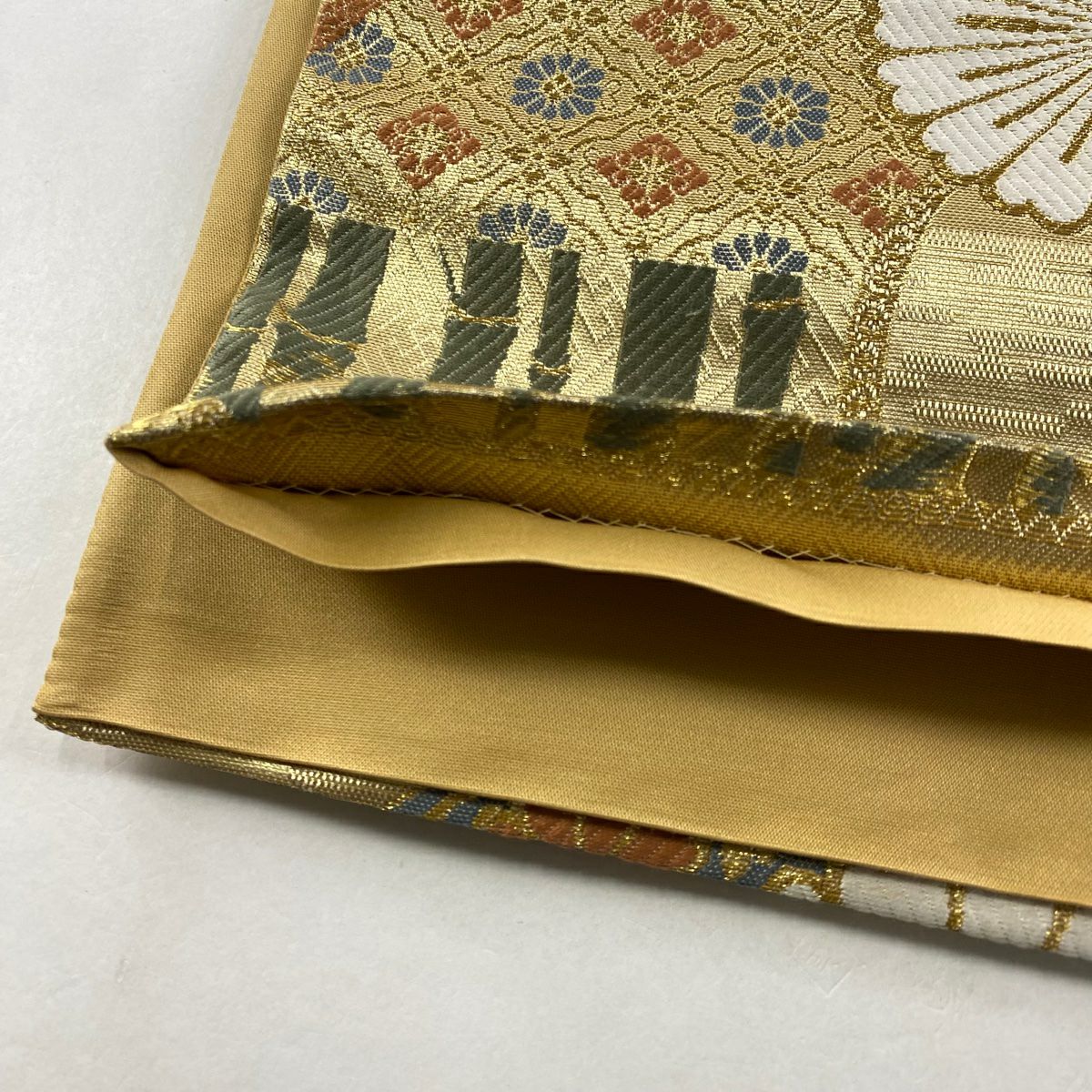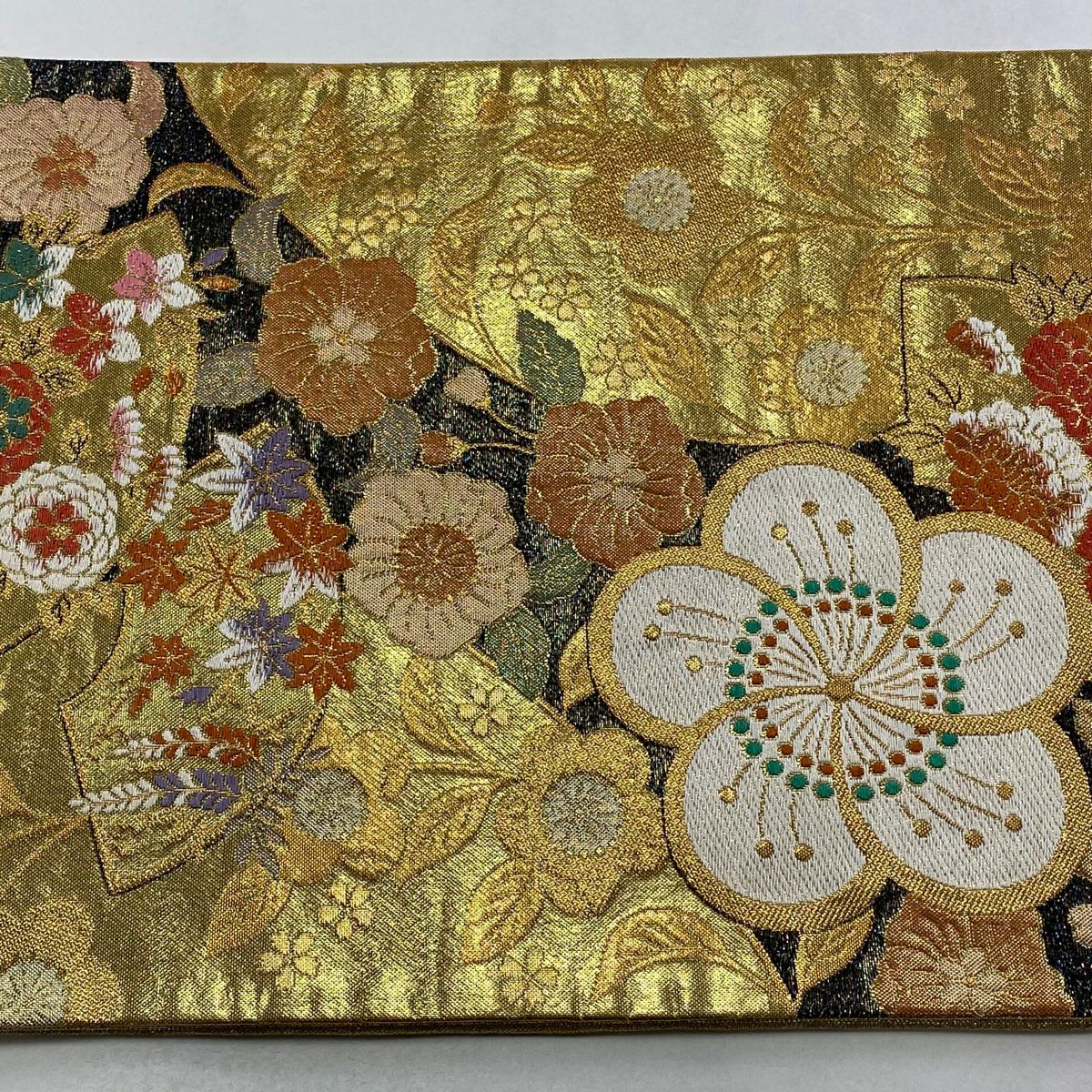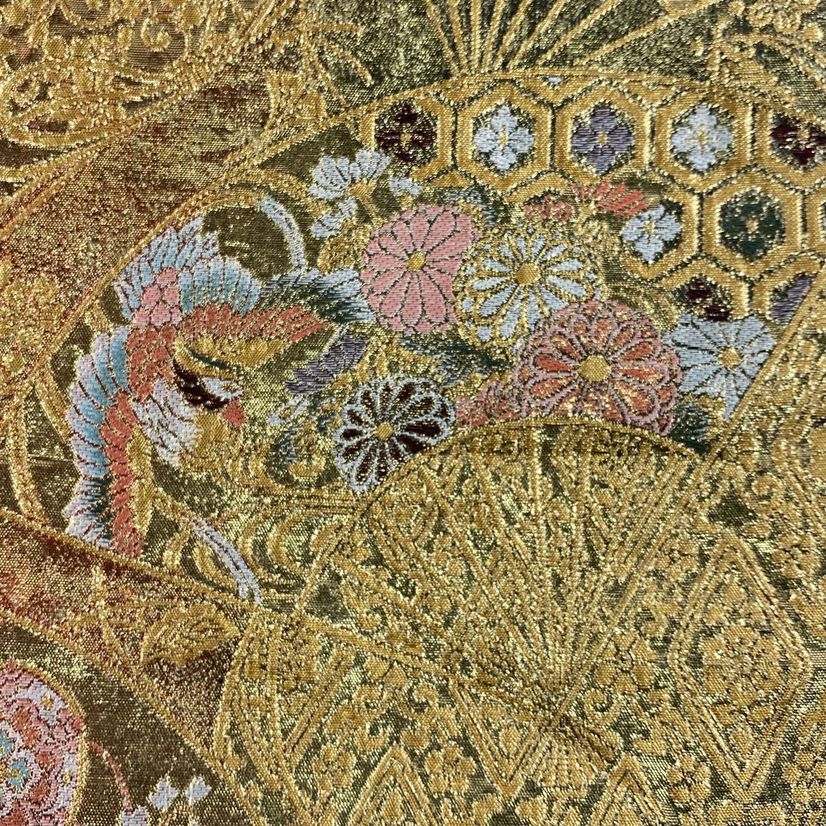 【在庫一掃】 【美品】 袋帯 秀品 扇 花鳥 箔 金色 六通 正絹