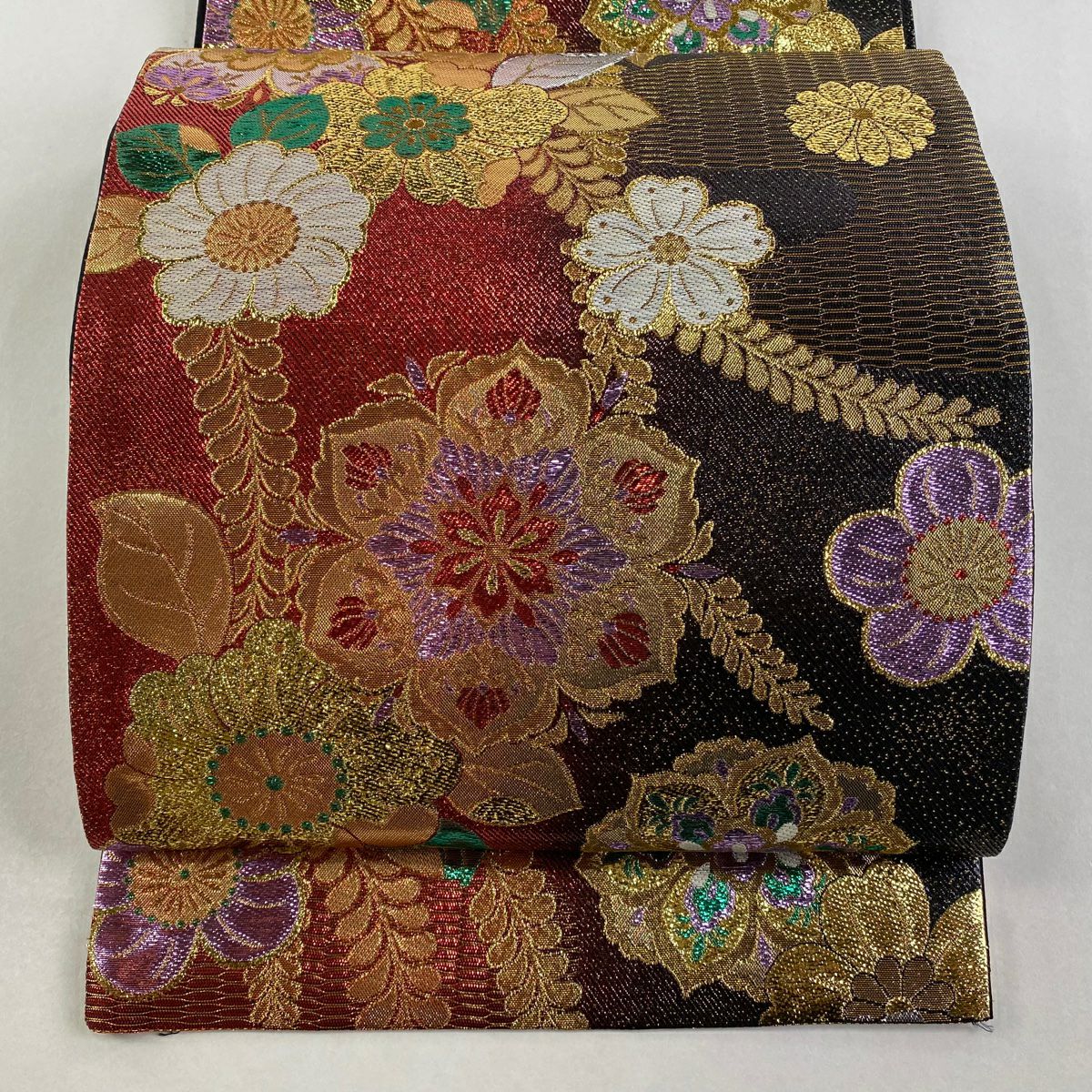 【在庫一掃】 袋帯 秀品 梅 籠目 金銀糸 箔 赤紫 六通 正絹