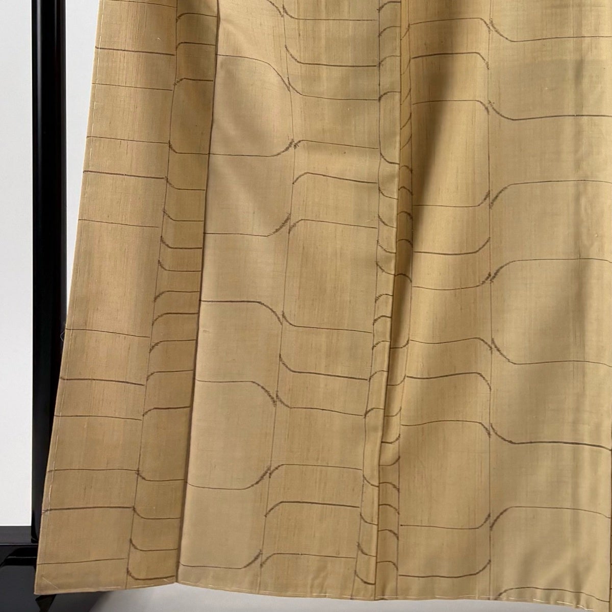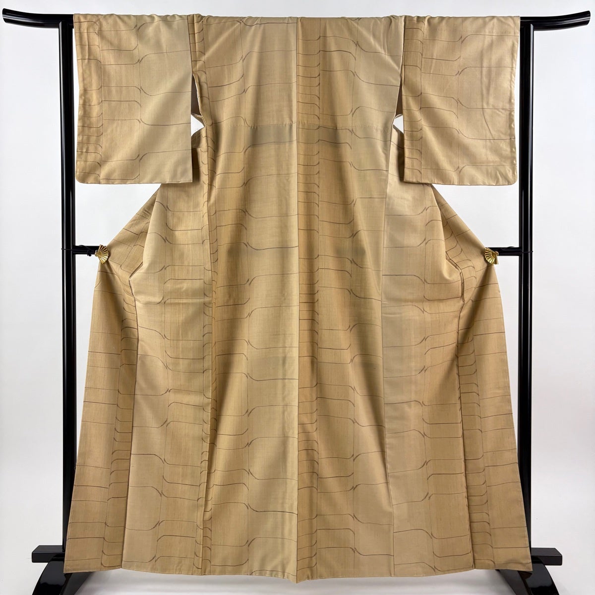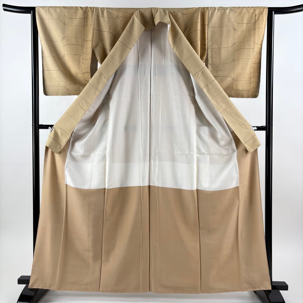 紬 身丈164cm 裄丈64cm M 袷 幾何学模様 薄茶色 正絹 秀品