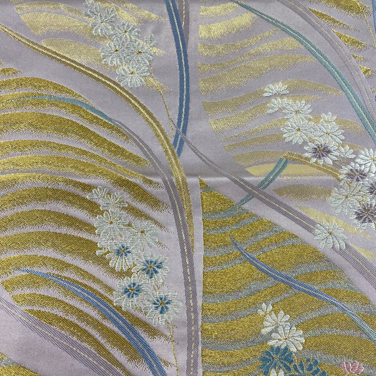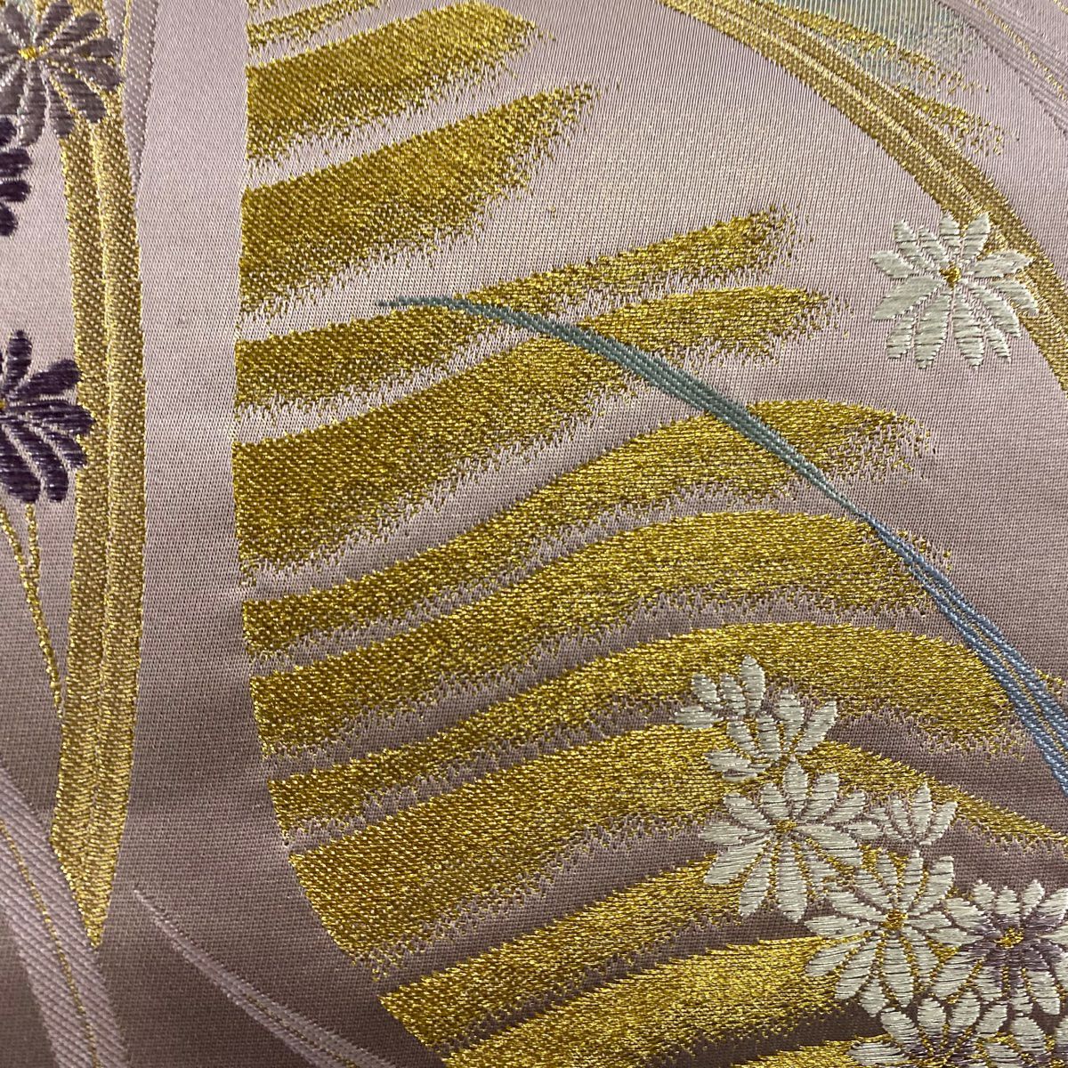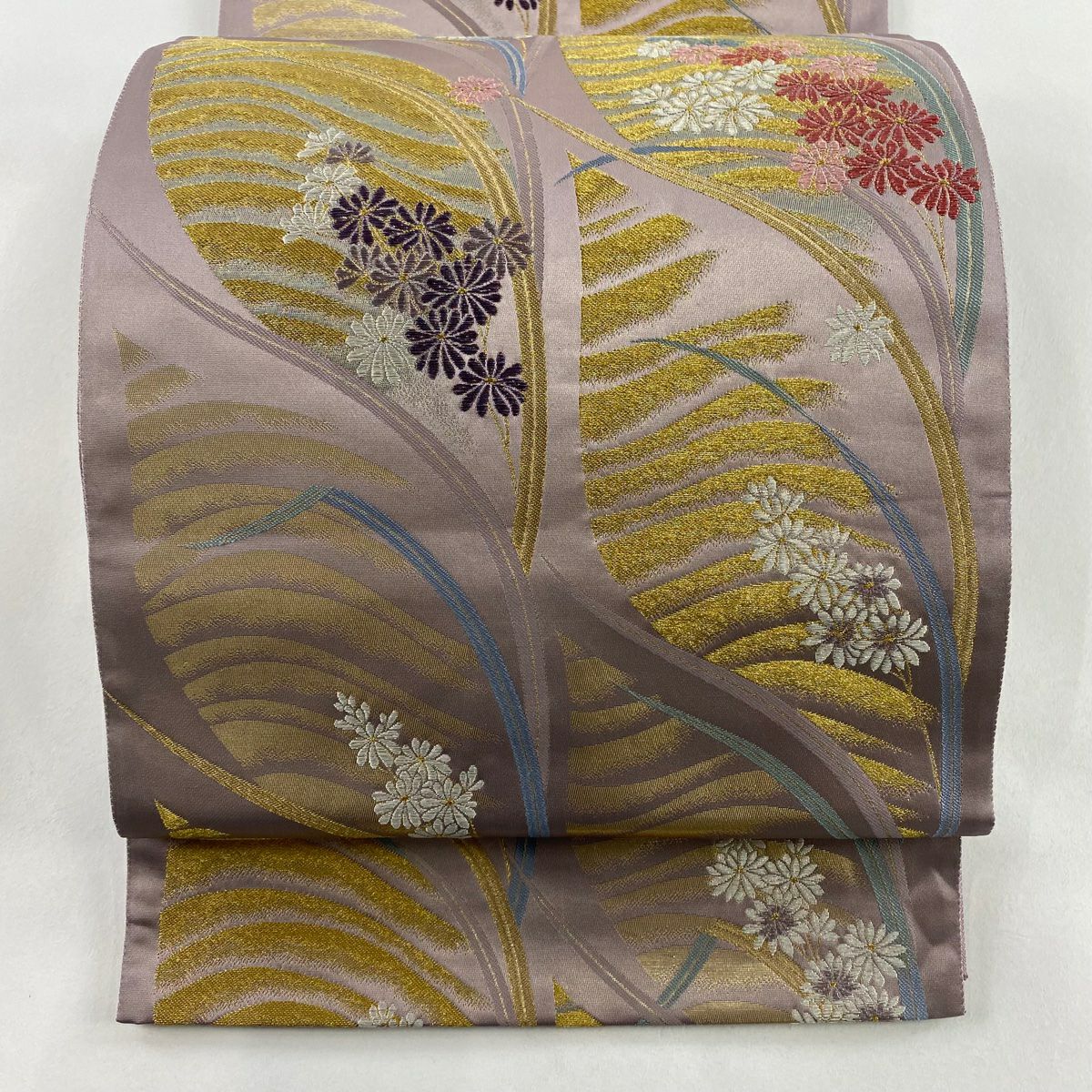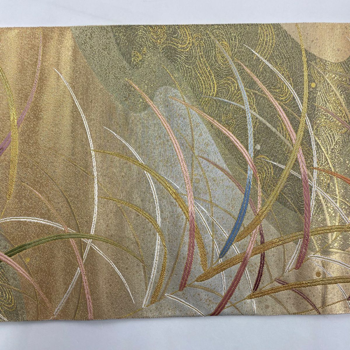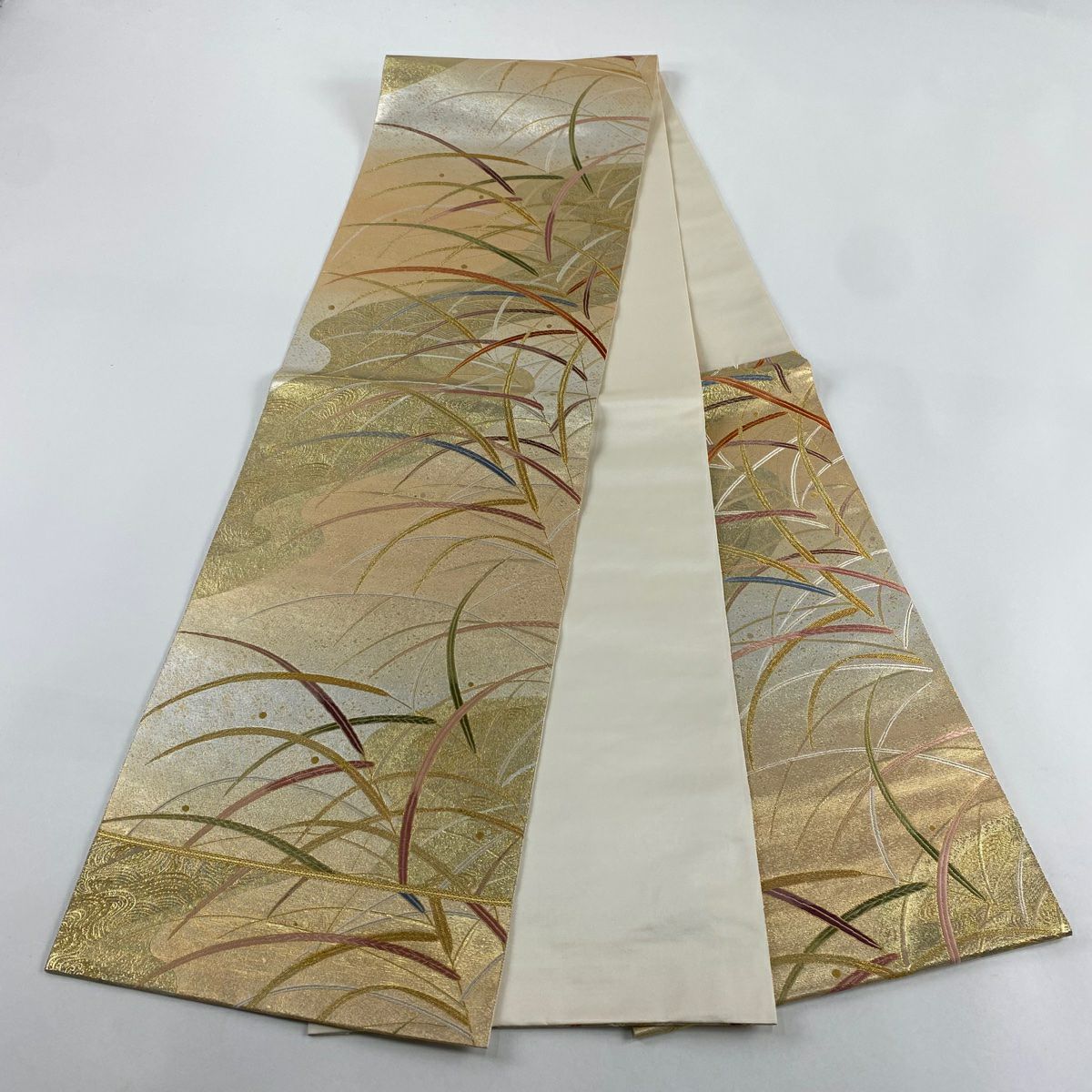 袋帯 秀品 草花 すすき 螺鈿 金彩 ベージュ お太鼓柄 正絹