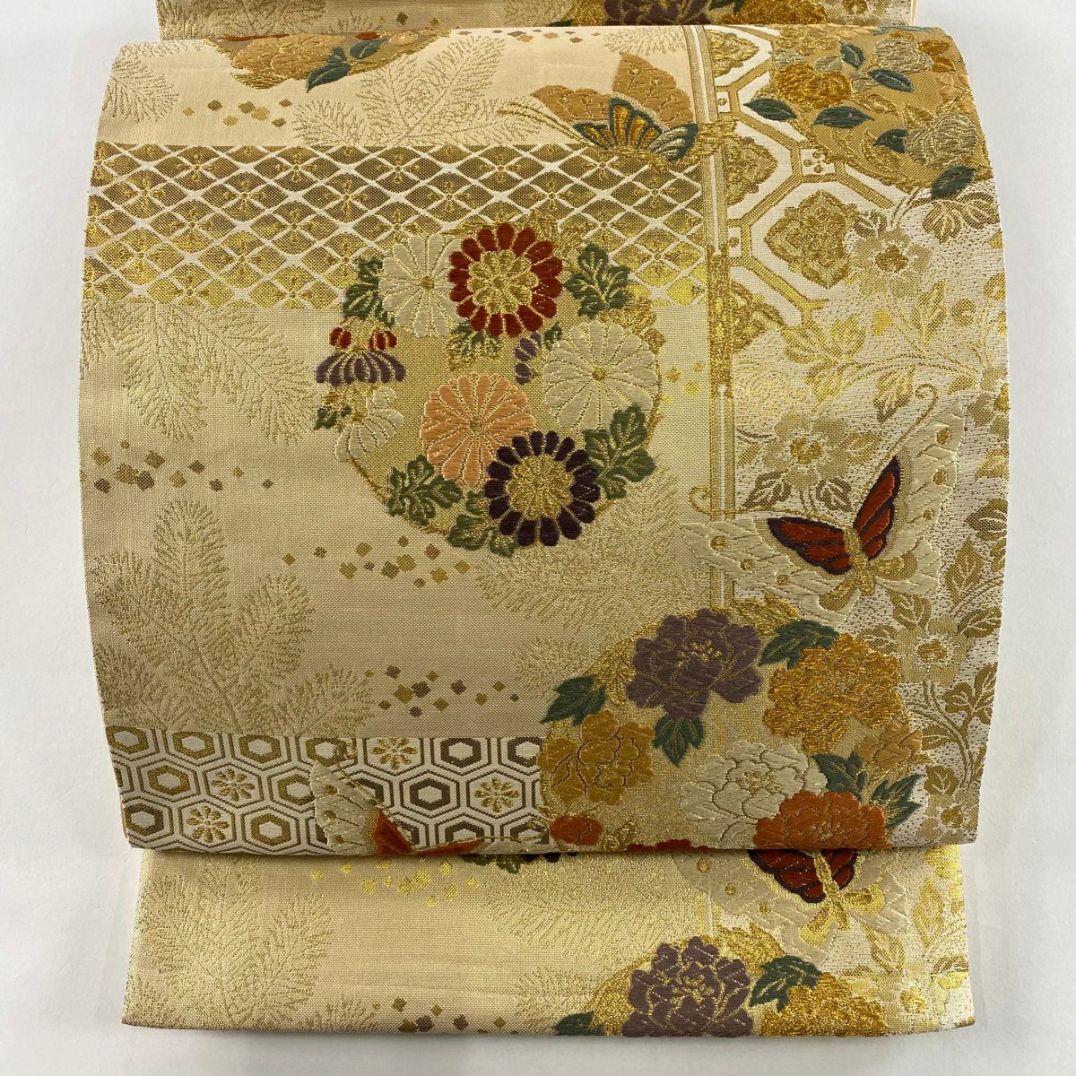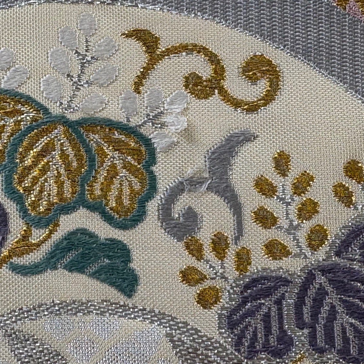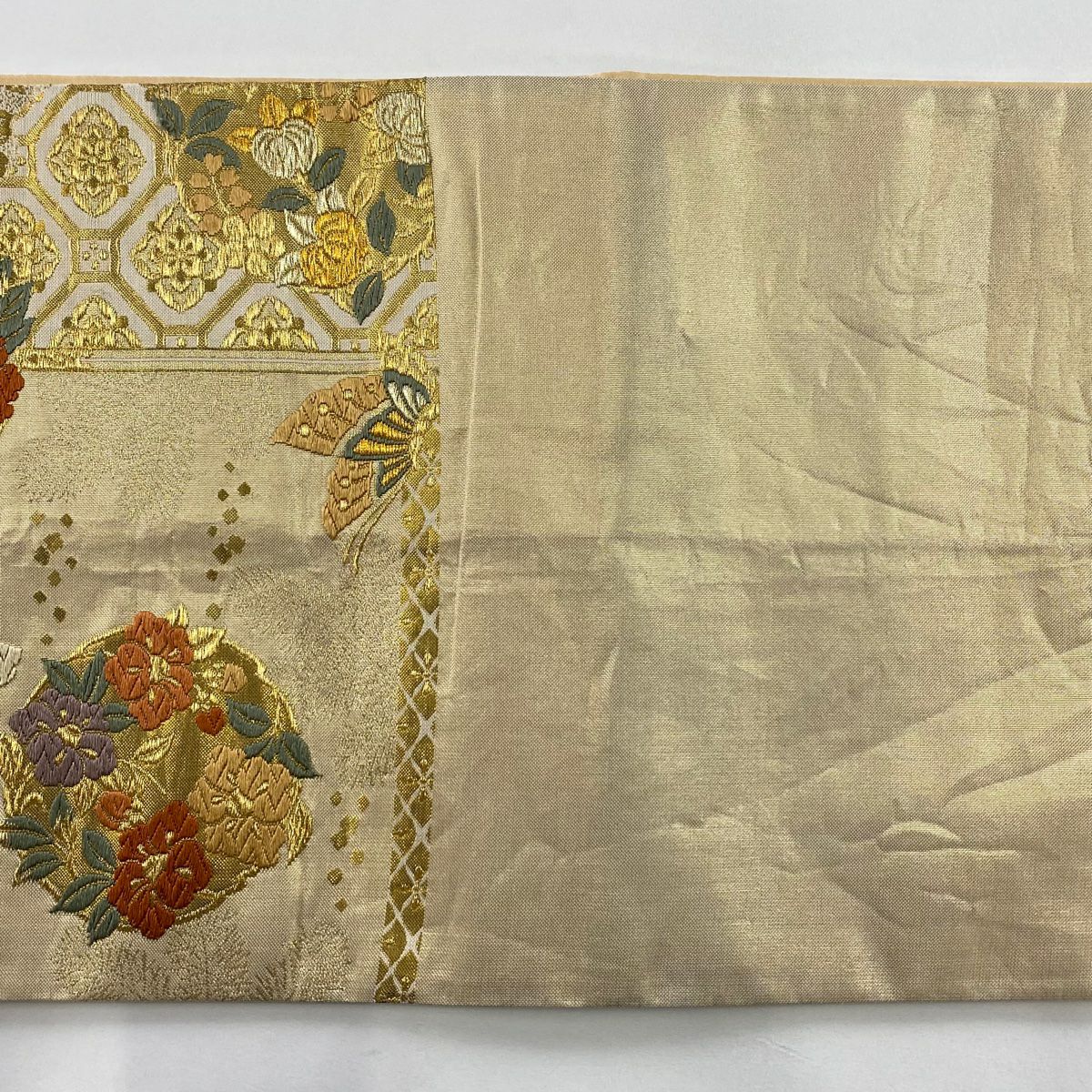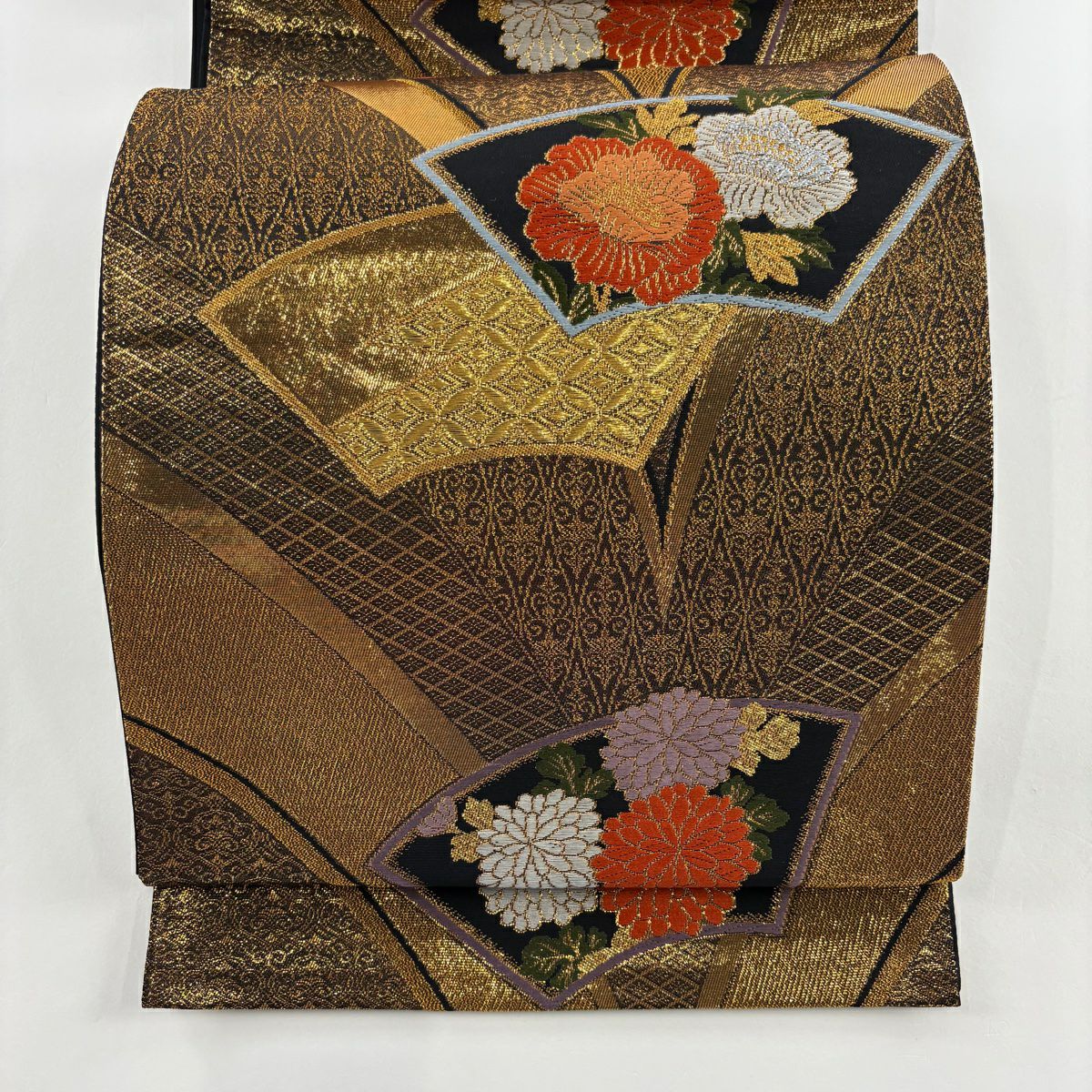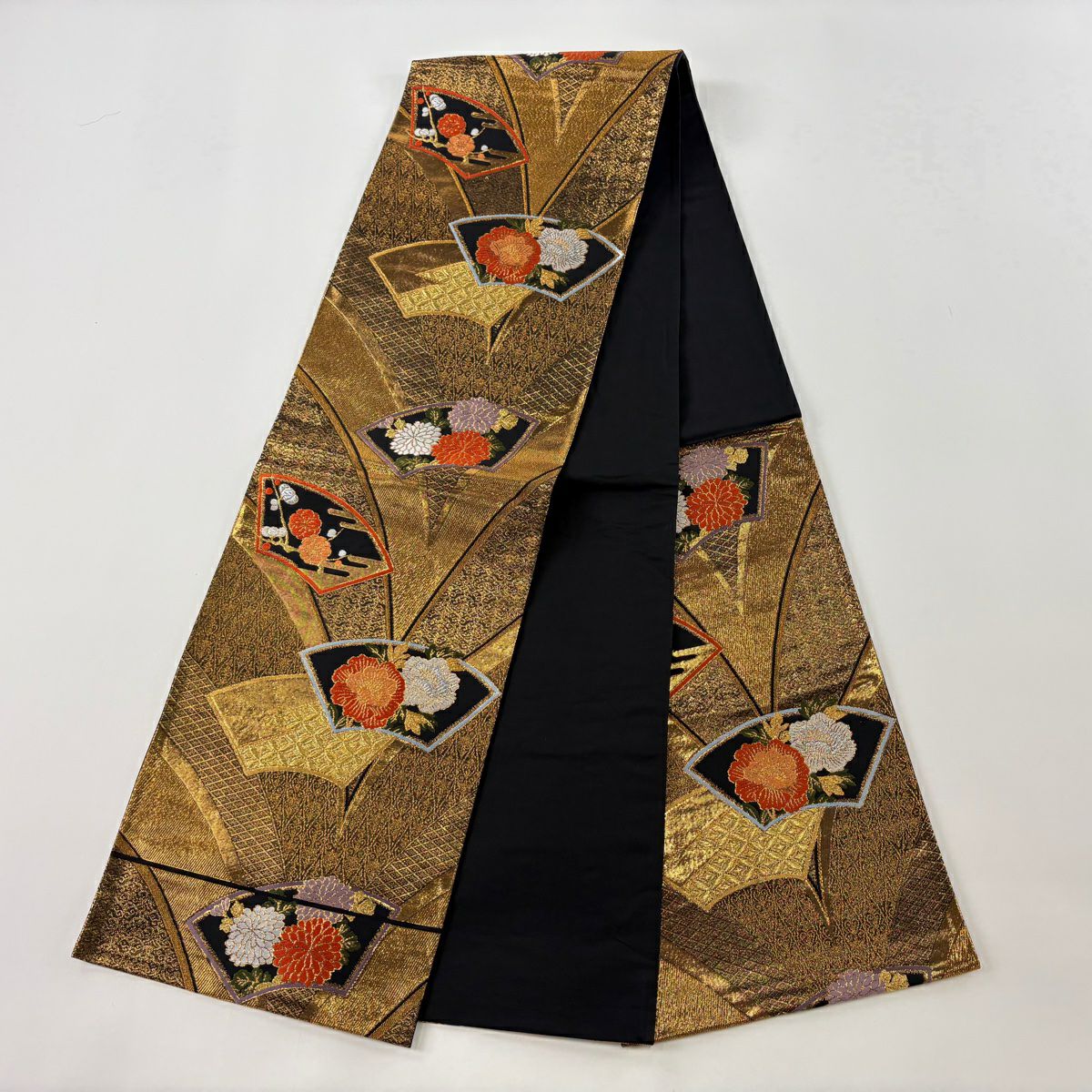 【在庫一掃】 袋帯 秀品 扇面 草花 金銀糸 箔 金色 六通 正絹