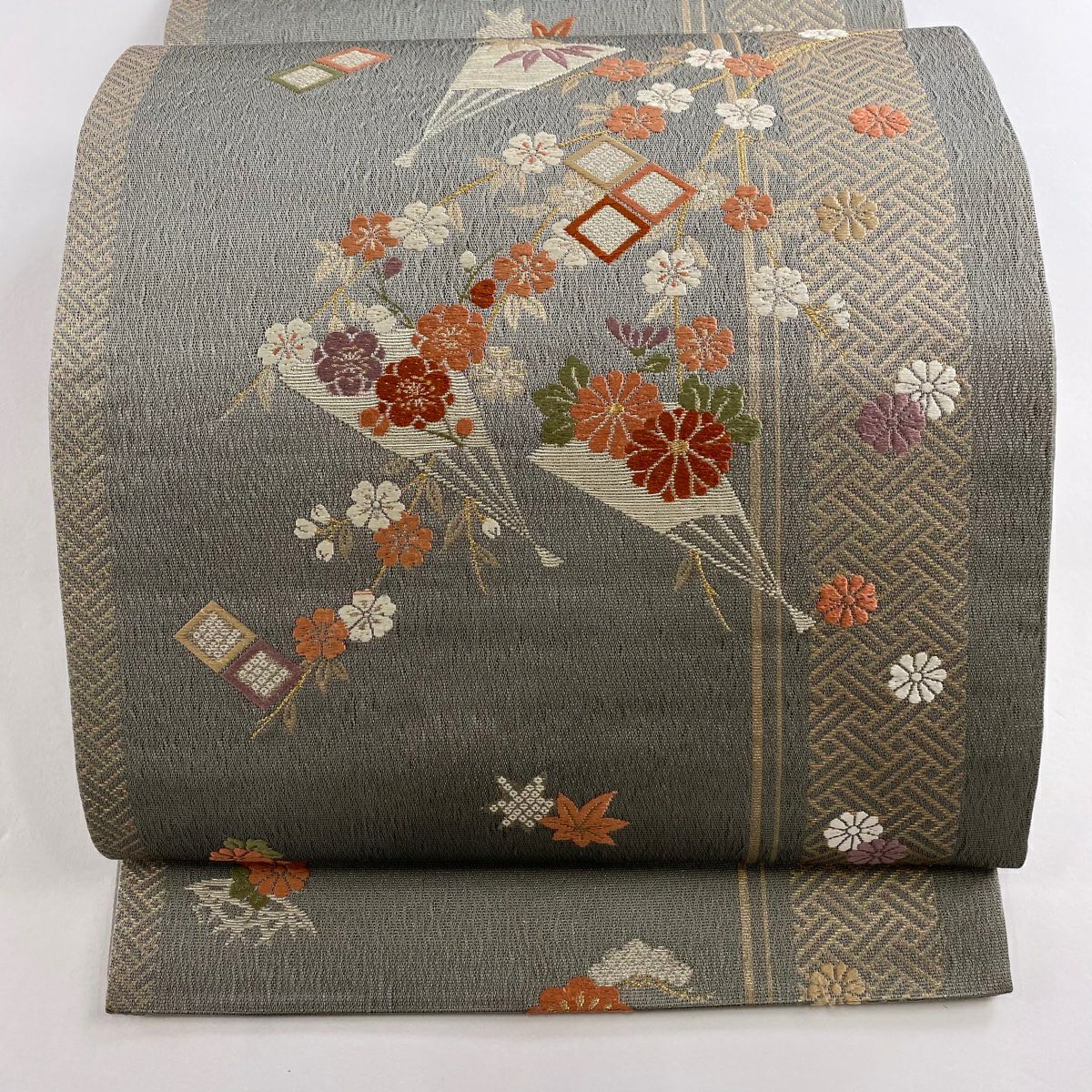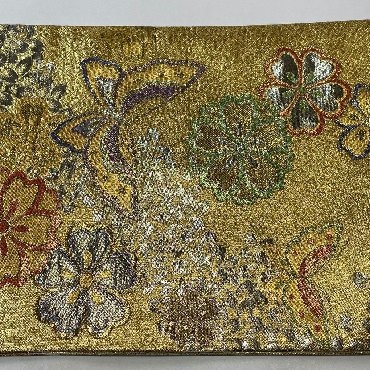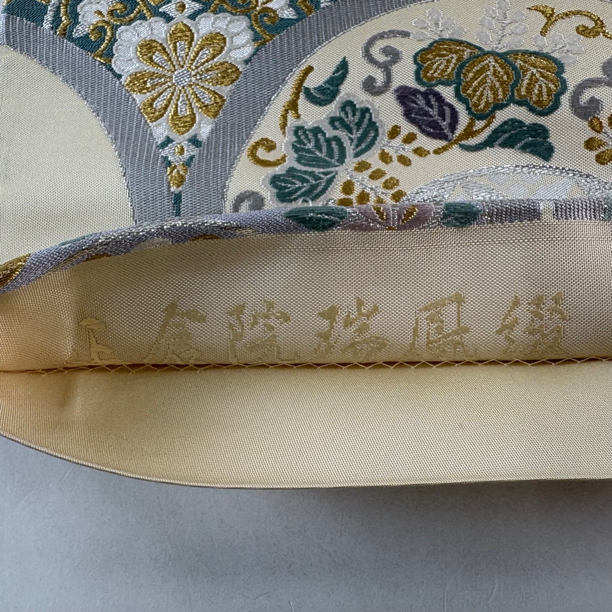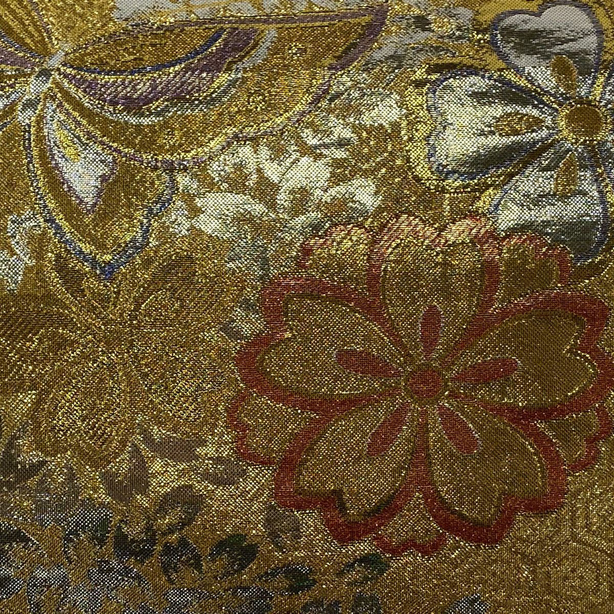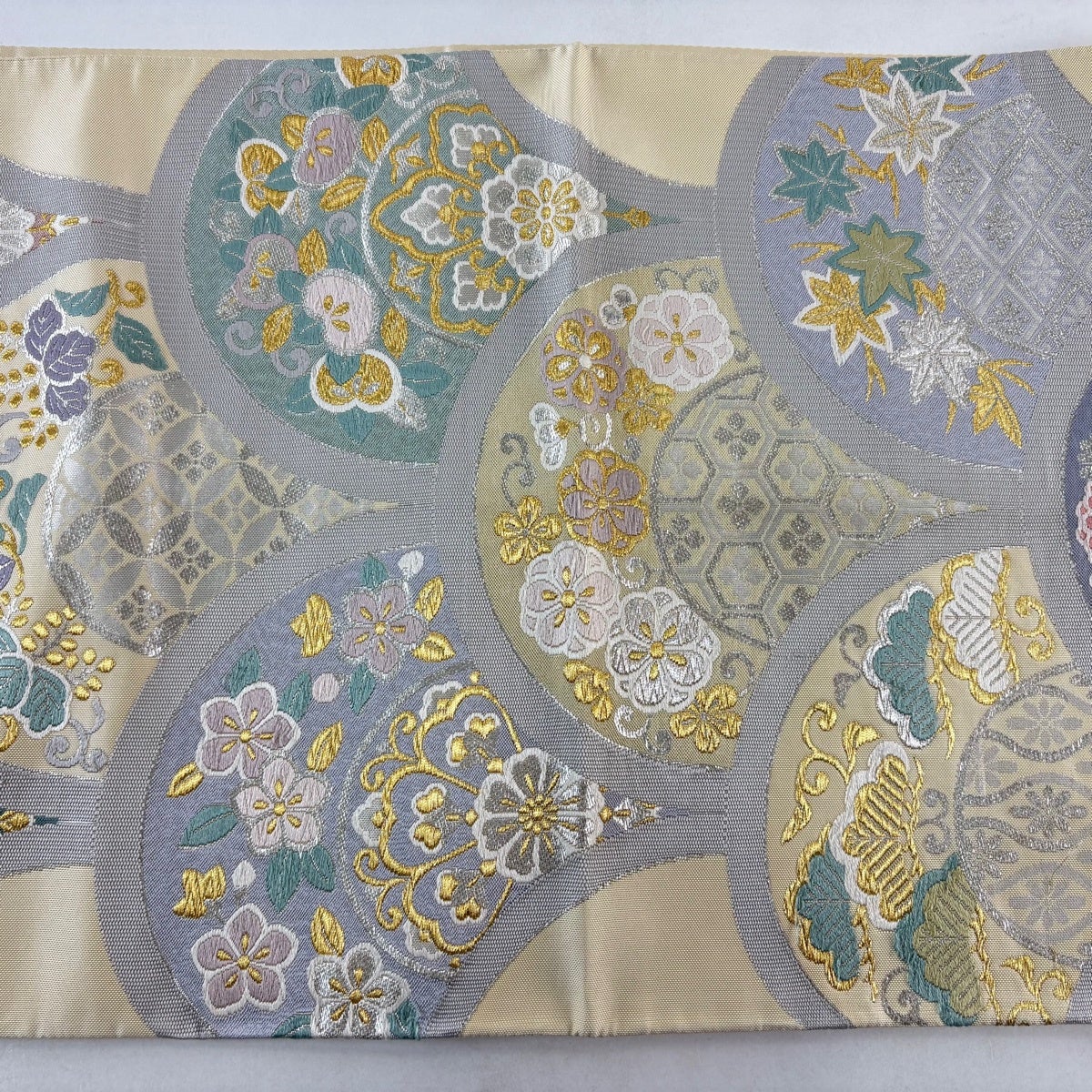 【在庫一掃】 袋帯 秀品 扇面 草花 金銀糸 箔 金色 六通 正絹