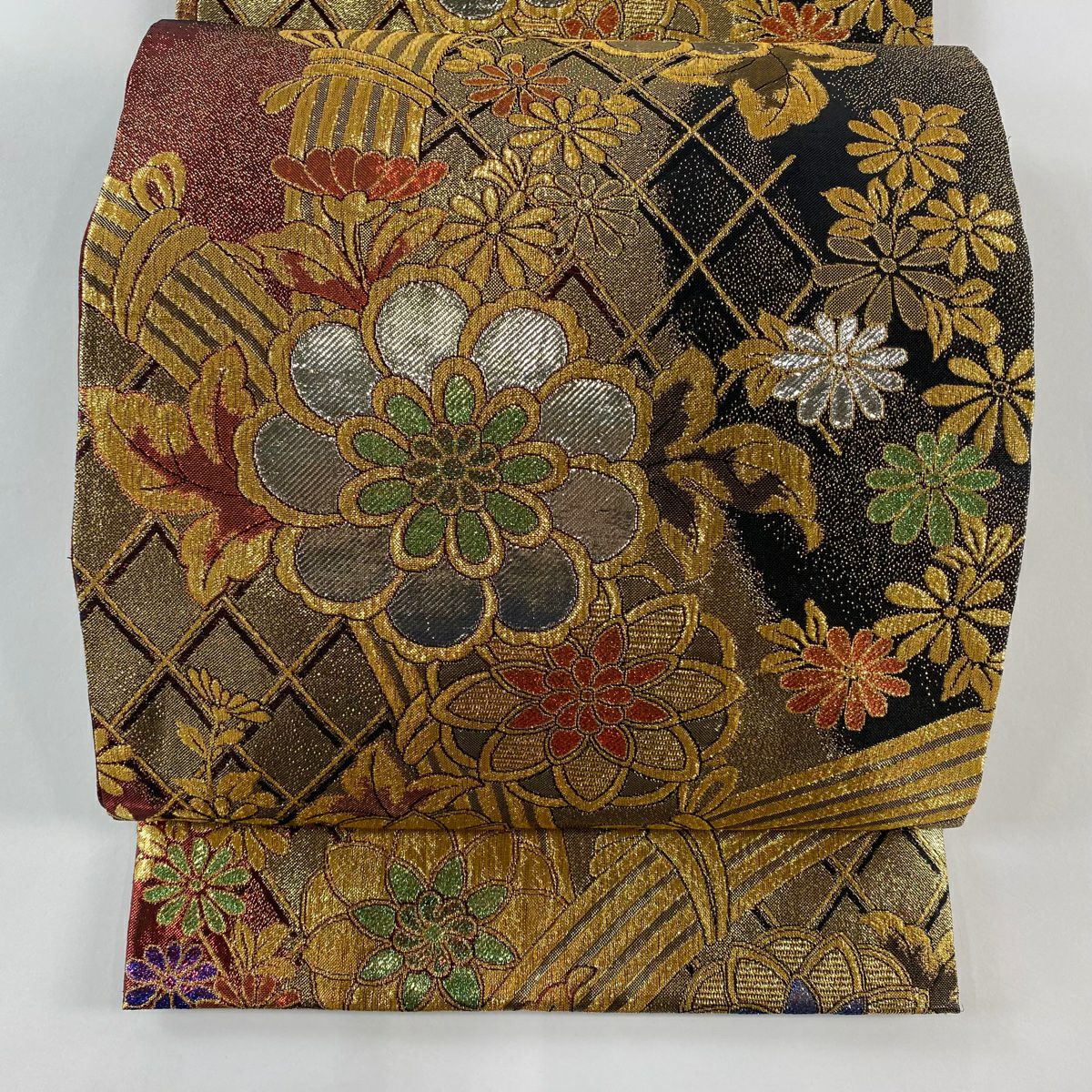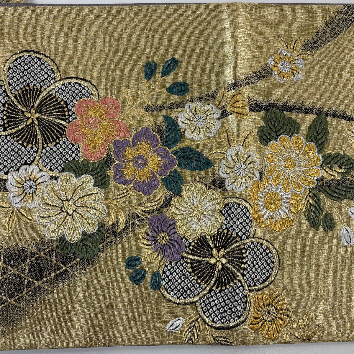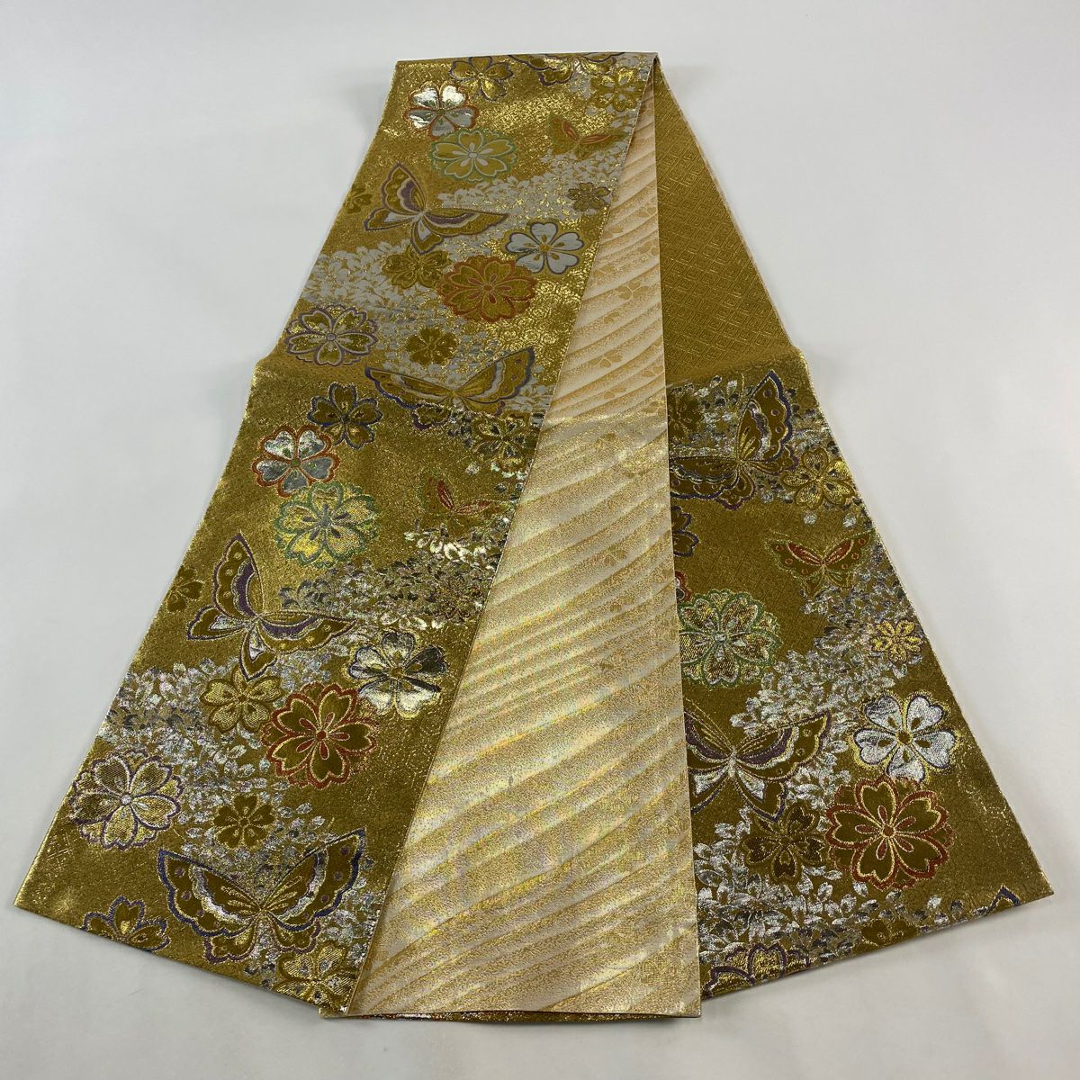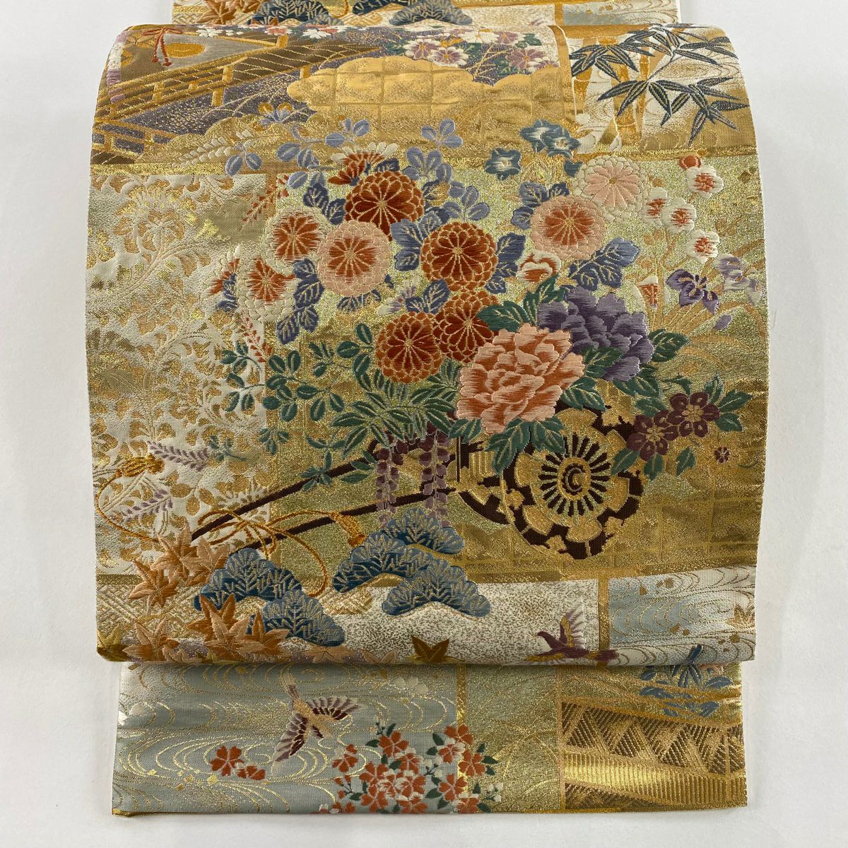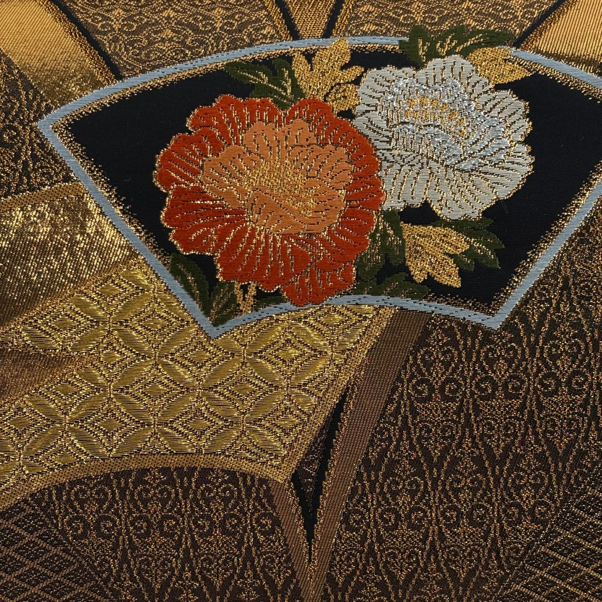【在庫一掃】 袋帯 秀品 扇面 草花 金銀糸 箔 金色 六通 正絹