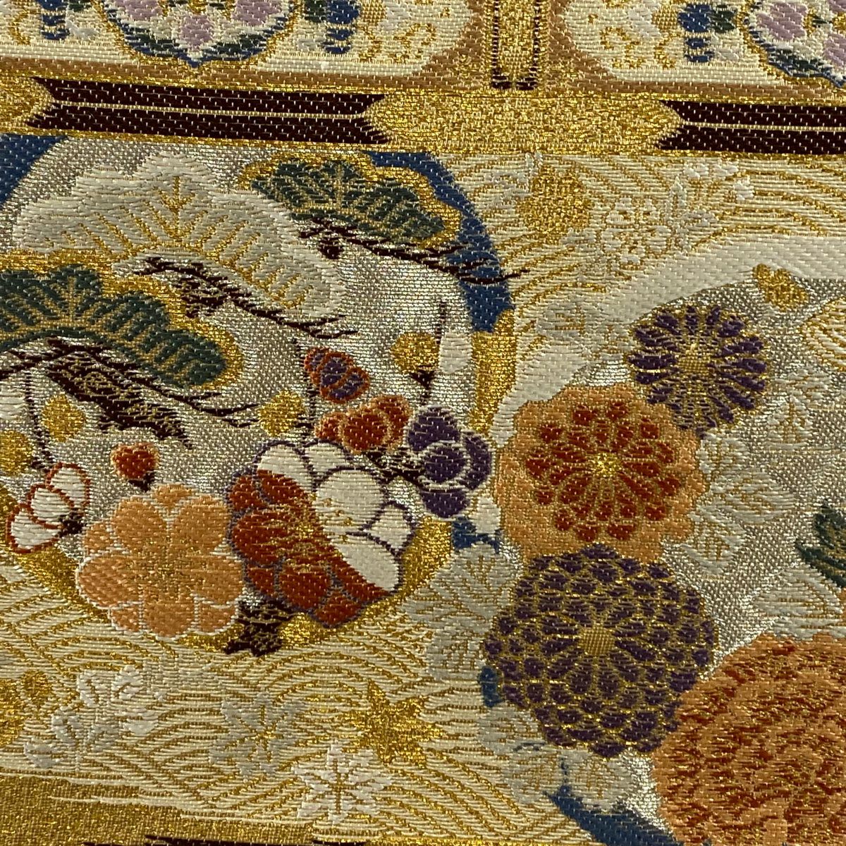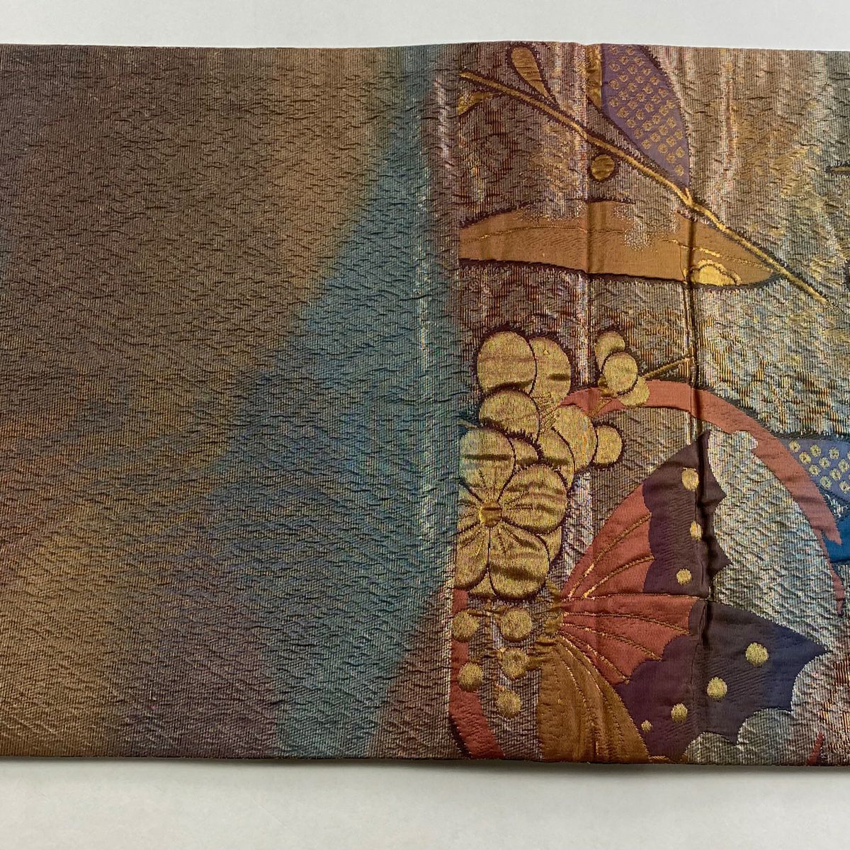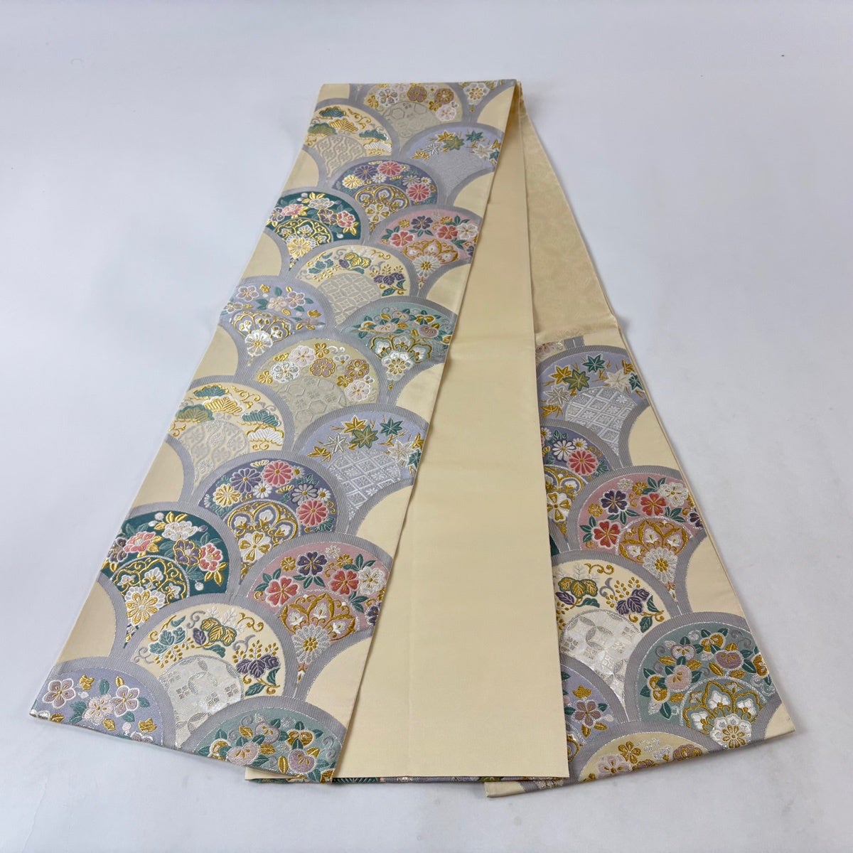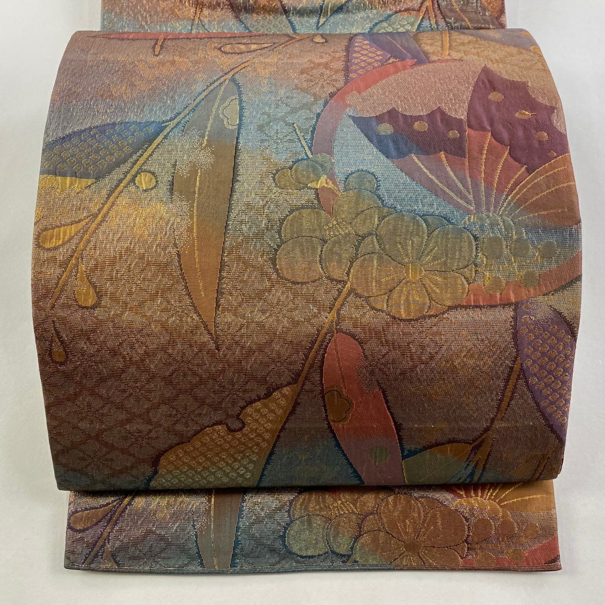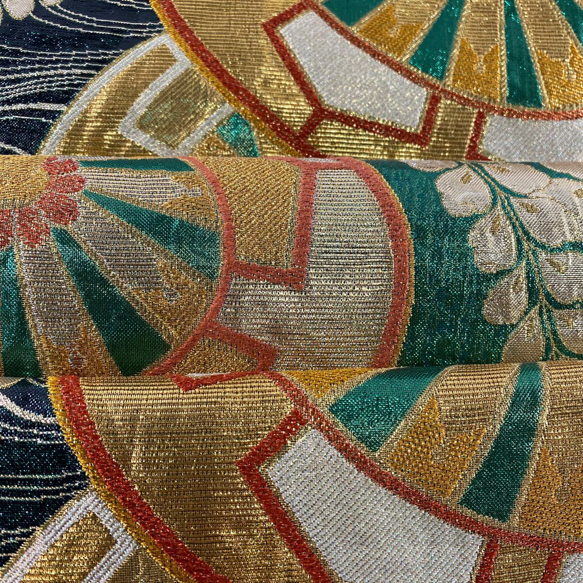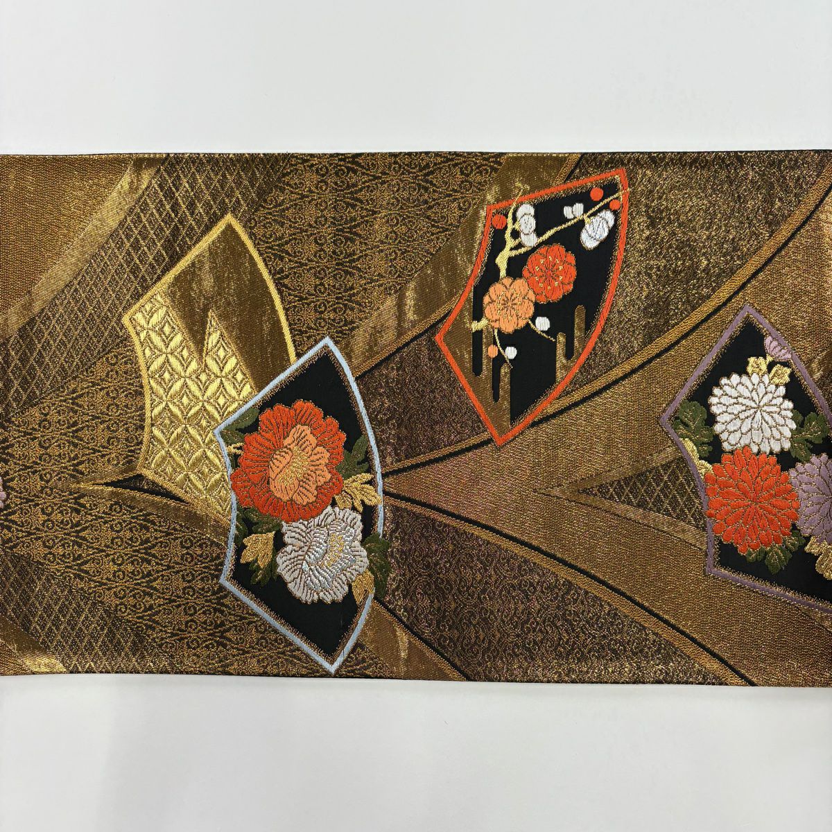 【在庫一掃】 袋帯 秀品 扇面 草花 金銀糸 箔 金色 六通 正絹